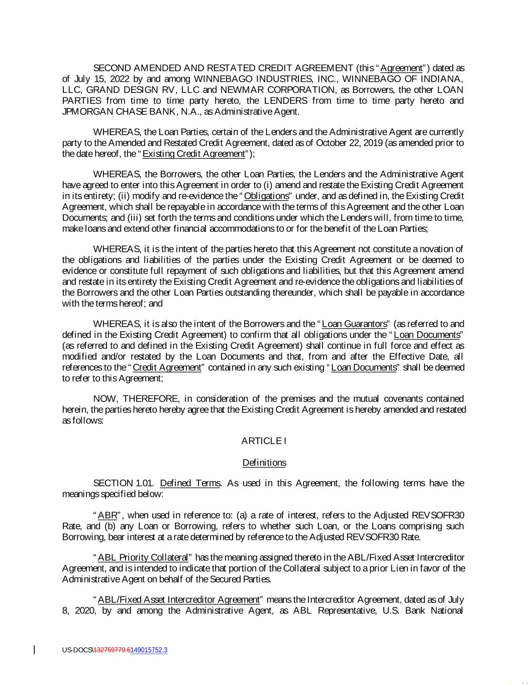 US-DOCS\132759779.6149015752.3 SECOND AMENDED AND RESTATED CREDIT AGREEMENT (this “Agreement”) dated as of July 15, 2022 by and among WINNEBAGO INDUSTRIES, INC., WINNEBAGO OF INDIANA, LLC, GRAND DESIGN RV, LLC and NEWMAR CORPORATION, as Borrowers, the other LOAN PARTIES from time to time party hereto, the LENDERS from time to time party hereto and JPMORGAN CHASE BANK, N.A., as Administrative Agent. WHEREAS, the Loan Parties, certain of the Lenders and the Administrative Agent are currently party to the Amended and Restated Credit Agreement, dated as of October 22, 2019 (as amended prior to the date hereof, the “Existing Credit Agreement”); WHEREAS, the Borrowers, the other Loan Parties, the Lenders and the Administrative Agent have agreed to enter into this Agreement in order to (i) amend and restate the Existing Credit Agreement in its entirety; (ii) modify and re-evidence the “Obligations” under, and as defined in, the Existing Credit Agreement, which shall be repayable in accordance with the terms of this Agreement and the other Loan Documents; and (iii) set forth the terms and conditions under which the Lenders will, from time to time, make loans and extend other financial accommodations to or for the benefit of the Loan Parties; WHEREAS, it is the intent of the parties hereto that this Agreement not constitute a novation of the obligations and liabilities of the parties under the Existing Credit Agreement or be deemed to evidence or constitute full repayment of such obligations and liabilities, but that this Agreement amend and restate in its entirety the Existing Credit Agreement and re-evidence the obligations and liabilities of the Borrowers and the other Loan Parties outstanding thereunder, which shall be payable in accordance with the terms hereof; and WHEREAS, it is also the intent of the Borrowers and the “Loan Guarantors” (as referred to and defined in the Existing Credit Agreement) to confirm that all obligations under the “Loan Documents” (as referred to and defined in the Existing Credit Agreement) shall continue in full force and effect as modified and/or restated by the Loan Documents and that, from and after the Effective Date, all references to the “Credit Agreement” contained in any such existing “Loan Documents” shall be deemed to refer to this Agreement; NOW, THEREFORE, in consideration of the premises and the mutual covenants contained herein, the parties hereto hereby agree that the Existing Credit Agreement is hereby amended and restated as follows: ARTICLE I Definitions SECTION 1.01. Defined Terms. As used in this Agreement, the following terms have the meanings specified below: “ABR”, when used in reference to: (a) a rate of interest, refers to the Adjusted REVSOFR30 Rate, and (b) any Loan or Borrowing, refers to whether such Loan, or the Loans comprising such Borrowing, bear interest at a rate determined by reference to the Adjusted REVSOFR30 Rate. “ABL Priority Collateral” has the meaning assigned thereto in the ABL/Fixed Asset Intercreditor Agreement, and is intended to indicate that portion of the Collateral subject to a prior Lien in favor of the Administrative Agent on behalf of the Secured Parties. “ABL/Fixed Asset Intercreditor Agreement” means the Intercreditor Agreement, dated as of July 8, 2020, by and among the Administrative Agent, as ABL Representative, U.S. Bank National