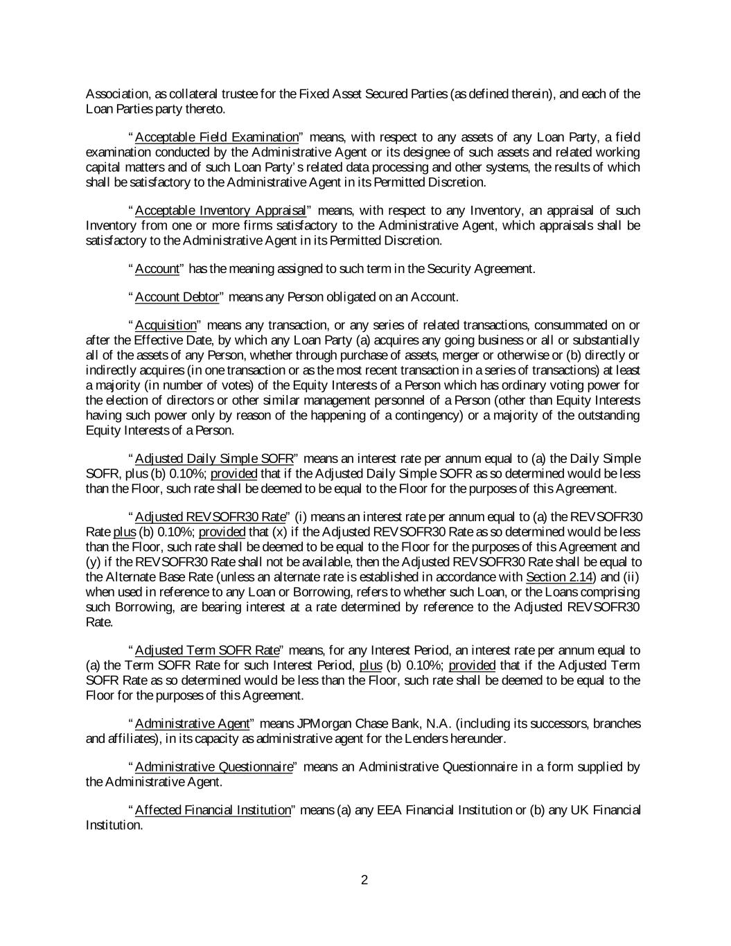 Association, as collateral trustee for the Fixed Asset Secured Parties (as defined therein), and each of the Loan Parties party thereto. “Acceptable Field Examination” means, with respect to any assets of any Loan Party, a field examination conducted by the Administrative Agent or its designee of such assets and related working capital matters and of such Loan Party’s related data processing and other systems, the results of which shall be satisfactory to the Administrative Agent in its Permitted Discretion. “Acceptable Inventory Appraisal” means, with respect to any Inventory, an appraisal of such Inventory from one or more firms satisfactory to the Administrative Agent, which appraisals shall be satisfactory to the Administrative Agent in its Permitted Discretion. “Account” has the meaning assigned to such term in the Security Agreement. “Account Debtor” means any Person obligated on an Account. “Acquisition” means any transaction, or any series of related transactions, consummated on or after the Effective Date, by which any Loan Party (a) acquires any going business or all or substantially all of the assets of any Person, whether through purchase of assets, merger or otherwise or (b) directly or indirectly acquires (in one transaction or as the most recent transaction in a series of transactions) at least a majority (in number of votes) of the Equity Interests of a Person which has ordinary voting power for the election of directors or other similar management personnel of a Person (other than Equity Interests having such power only by reason of the happening of a contingency) or a majority of the outstanding Equity Interests of a Person. “Adjusted Daily Simple SOFR” means an interest rate per annum equal to (a) the Daily Simple SOFR, plus (b) 0.10%; provided that if the Adjusted Daily Simple SOFR as so determined would be less than the Floor, such rate shall be deemed to be equal to the Floor for the purposes of this Agreement. “Adjusted REVSOFR30 Rate” (i) means an interest rate per annum equal to (a) the REVSOFR30 Rate plus (b) 0.10%; provided that (x) if the Adjusted REVSOFR30 Rate as so determined would be less than the Floor, such rate shall be deemed to be equal to the Floor for the purposes of this Agreement and (y) if the REVSOFR30 Rate shall not be available, then the Adjusted REVSOFR30 Rate shall be equal to the Alternate Base Rate (unless an alternate rate is established in accordance with Section 2.14) and (ii) when used in reference to any Loan or Borrowing, refers to whether such Loan, or the Loans comprising such Borrowing, are bearing interest at a rate determined by reference to the Adjusted REVSOFR30 Rate. “Adjusted Term SOFR Rate” means, for any Interest Period, an interest rate per annum equal to (a) the Term SOFR Rate for such Interest Period, plus (b) 0.10%; provided that if the Adjusted Term SOFR Rate as so determined would be less than the Floor, such rate shall be deemed to be equal to the Floor for the purposes of this Agreement. “Administrative Agent” means JPMorgan Chase Bank, N.A. (including its successors, branches and affiliates), in its capacity as administrative agent for the Lenders hereunder. “Administrative Questionnaire” means an Administrative Questionnaire in a form supplied by the Administrative Agent. “Affected Financial Institution” means (a) any EEA Financial Institution or (b) any UK Financial Institution. 2
