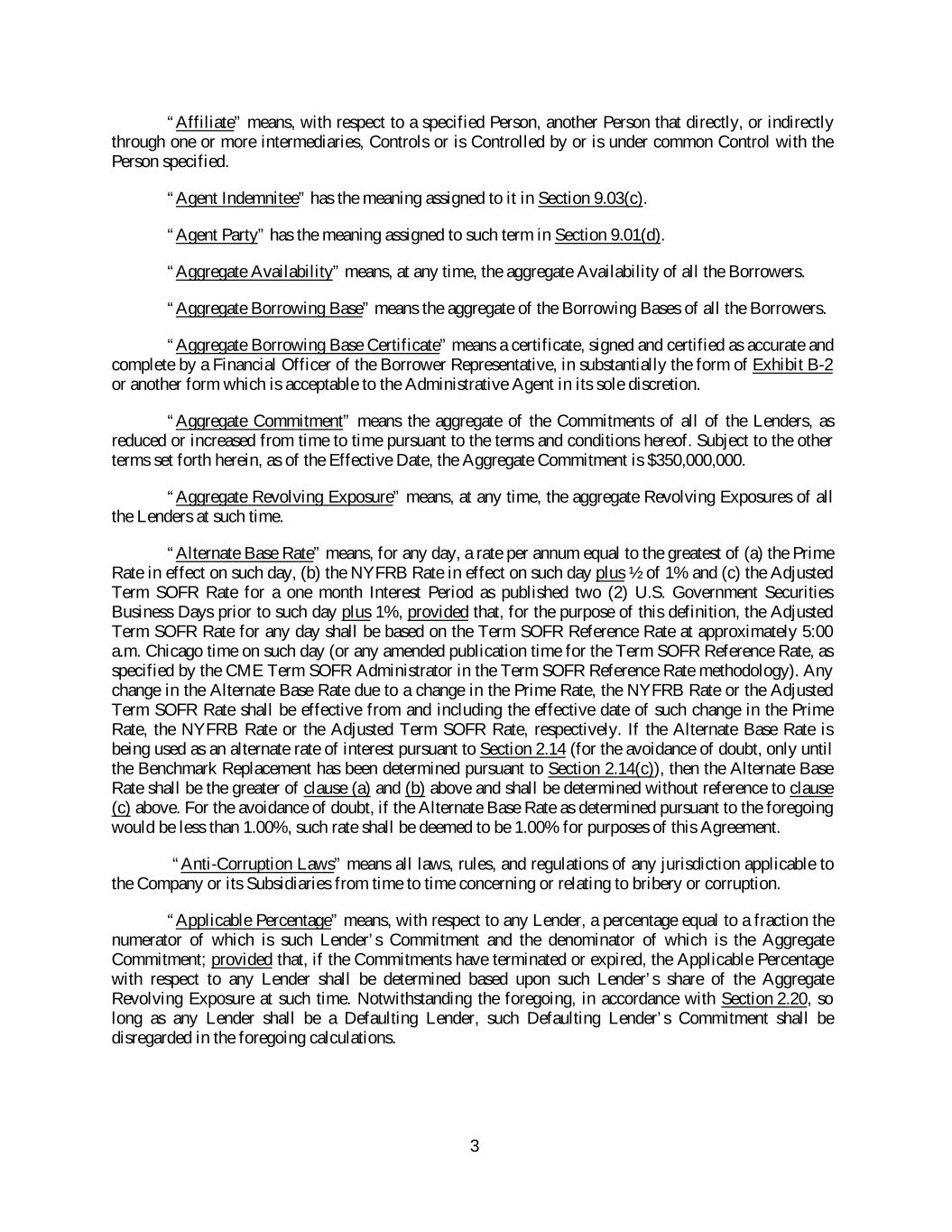 “Affiliate” means, with respect to a specified Person, another Person that directly, or indirectly through one or more intermediaries, Controls or is Controlled by or is under common Control with the Person specified. “Agent Indemnitee” has the meaning assigned to it in Section 9.03(c). “Agent Party” has the meaning assigned to such term in Section 9.01(d). “Aggregate Availability” means, at any time, the aggregate Availability of all the Borrowers. “Aggregate Borrowing Base” means the aggregate of the Borrowing Bases of all the Borrowers. “Aggregate Borrowing Base Certificate” means a certificate, signed and certified as accurate and complete by a Financial Officer of the Borrower Representative, in substantially the form of Exhibit B-2 or another form which is acceptable to the Administrative Agent in its sole discretion. “Aggregate Commitment” means the aggregate of the Commitments of all of the Lenders, as reduced or increased from time to time pursuant to the terms and conditions hereof. Subject to the other terms set forth herein, as of the Effective Date, the Aggregate Commitment is $350,000,000. “Aggregate Revolving Exposure” means, at any time, the aggregate Revolving Exposures of all the Lenders at such time. “Alternate Base Rate” means, for any day, a rate per annum equal to the greatest of (a) the Prime Rate in effect on such day, (b) the NYFRB Rate in effect on such day plus ½ of 1% and (c) the Adjusted Term SOFR Rate for a one month Interest Period as published two (2) U.S. Government Securities Business Days prior to such day plus 1%, provided that, for the purpose of this definition, the Adjusted Term SOFR Rate for any day shall be based on the Term SOFR Reference Rate at approximately 5:00 a.m. Chicago time on such day (or any amended publication time for the Term SOFR Reference Rate, as specified by the CME Term SOFR Administrator in the Term SOFR Reference Rate methodology). Any change in the Alternate Base Rate due to a change in the Prime Rate, the NYFRB Rate or the Adjusted Term SOFR Rate shall be effective from and including the effective date of such change in the Prime Rate, the NYFRB Rate or the Adjusted Term SOFR Rate, respectively. If the Alternate Base Rate is being used as an alternate rate of interest pursuant to Section 2.14 (for the avoidance of doubt, only until the Benchmark Replacement has been determined pursuant to Section 2.14(c)), then the Alternate Base Rate shall be the greater of clause (a) and (b) above and shall be determined without reference to clause (c) above. For the avoidance of doubt, if the Alternate Base Rate as determined pursuant to the foregoing would be less than 1.00%, such rate shall be deemed to be 1.00% for purposes of this Agreement. “Anti-Corruption Laws” means all laws, rules, and regulations of any jurisdiction applicable to the Company or its Subsidiaries from time to time concerning or relating to bribery or corruption. “Applicable Percentage” means, with respect to any Lender, a percentage equal to a fraction the numerator of which is such Lender’s Commitment and the denominator of which is the Aggregate Commitment; provided that, if the Commitments have terminated or expired, the Applicable Percentage with respect to any Lender shall be determined based upon such Lender’s share of the Aggregate Revolving Exposure at such time. Notwithstanding the foregoing, in accordance with Section 2.20, so long as any Lender shall be a Defaulting Lender, such Defaulting Lender’s Commitment shall be disregarded in the foregoing calculations. 3
