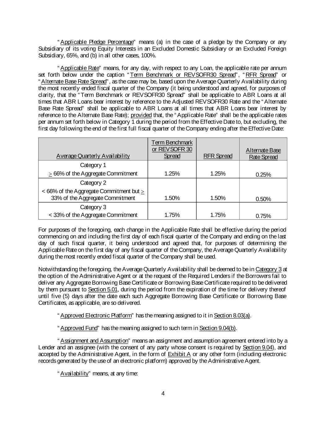 4 0.25% RFR Spread Category 2 < 66% of the Aggregate Commitment but 33% of the Aggregate Commitment Alternate Base Rate Spread 1.50% 1.50% 0.50% Average Quarterly Availability Category 1 66% of the Aggregate Commitment Category 3 < 33% of the Aggregate Commitment 1.75% 1.25% 1.75% Term Benchmark or REVSOFR 30 Spread 0.75% 1.25% For purposes of the foregoing, each change in the Applicable Rate shall be effective during the period commencing on and including the first day of each fiscal quarter of the Company and ending on the last day of such fiscal quarter, it being understood and agreed that, for purposes of determining the Applicable Rate on the first day of any fiscal quarter of the Company, the Average Quarterly Availability during the most recently ended fiscal quarter of the Company shall be used. Notwithstanding the foregoing, the Average Quarterly Availability shall be deemed to be in Category 3 at the option of the Administrative Agent or at the request of the Required Lenders if the Borrowers fail to deliver any Aggregate Borrowing Base Certificate or Borrowing Base Certificate required to be delivered by them pursuant to Section 5.01, during the period from the expiration of the time for delivery thereof until five (5) days after the date each such Aggregate Borrowing Base Certificate or Borrowing Base Certificates, as applicable, are so delivered. “Approved Electronic Platform” has the meaning assigned to it in Section 8.03(a). “Approved Fund” has the meaning assigned to such term in Section 9.04(b). “Assignment and Assumption” means an assignment and assumption agreement entered into by a Lender and an assignee (with the consent of any party whose consent is required by Section 9.04), and accepted by the Administrative Agent, in the form of Exhibit A or any other form (including electronic records generated by the use of an electronic platform) approved by the Administrative Agent. “Availability” means, at any time: “Applicable Pledge Percentage” means (a) in the case of a pledge by the Company or any Subsidiary of its voting Equity Interests in an Excluded Domestic Subsidiary or an Excluded Foreign Subsidiary, 65%, and (b) in all other cases, 100%. “Applicable Rate” means, for any day, with respect to any Loan, the applicable rate per annum set forth below under the caption “Term Benchmark or REVSOFR30 Spread”, “RFR Spread” or “Alternate Base Rate Spread”, as the case may be, based upon the Average Quarterly Availability during the most recently ended fiscal quarter of the Company (it being understood and agreed, for purposes of clarity, that the “Term Benchmark or REVSOFR30 Spread” shall be applicable to ABR Loans at all times that ABR Loans bear interest by reference to the Adjusted REVSOFR30 Rate and the “Alternate Base Rate Spread” shall be applicable to ABR Loans at all times that ABR Loans bear interest by reference to the Alternate Base Rate); provided that, the “Applicable Rate” shall be the applicable rates per annum set forth below in Category 1 during the period from the Effective Date to, but excluding, the first day following the end of the first full fiscal quarter of the Company ending after the Effective Date: