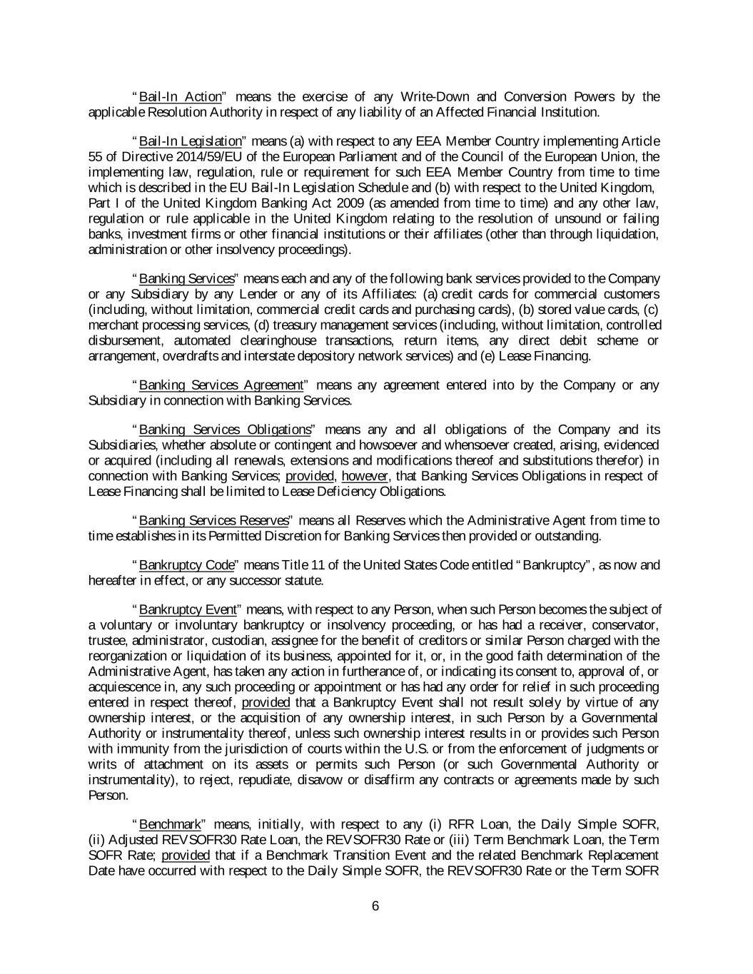 “Bail-In Action” means the exercise of any Write-Down and Conversion Powers by the applicable Resolution Authority in respect of any liability of an Affected Financial Institution. “Bail-In Legislation” means (a) with respect to any EEA Member Country implementing Article 55 of Directive 2014/59/EU of the European Parliament and of the Council of the European Union, the implementing law, regulation, rule or requirement for such EEA Member Country from time to time which is described in the EU Bail-In Legislation Schedule and (b) with respect to the United Kingdom, Part I of the United Kingdom Banking Act 2009 (as amended from time to time) and any other law, regulation or rule applicable in the United Kingdom relating to the resolution of unsound or failing banks, investment firms or other financial institutions or their affiliates (other than through liquidation, administration or other insolvency proceedings). “Banking Services” means each and any of the following bank services provided to the Company or any Subsidiary by any Lender or any of its Affiliates: (a) credit cards for commercial customers (including, without limitation, commercial credit cards and purchasing cards), (b) stored value cards, (c) merchant processing services, (d) treasury management services (including, without limitation, controlled disbursement, automated clearinghouse transactions, return items, any direct debit scheme or arrangement, overdrafts and interstate depository network services) and (e) Lease Financing. “Banking Services Agreement” means any agreement entered into by the Company or any Subsidiary in connection with Banking Services. “Banking Services Obligations” means any and all obligations of the Company and its Subsidiaries, whether absolute or contingent and howsoever and whensoever created, arising, evidenced or acquired (including all renewals, extensions and modifications thereof and substitutions therefor) in connection with Banking Services; provided, however, that Banking Services Obligations in respect of Lease Financing shall be limited to Lease Deficiency Obligations. “Banking Services Reserves” means all Reserves which the Administrative Agent from time to time establishes in its Permitted Discretion for Banking Services then provided or outstanding. “Bankruptcy Code” means Title 11 of the United States Code entitled “Bankruptcy”, as now and hereafter in effect, or any successor statute. “Bankruptcy Event” means, with respect to any Person, when such Person becomes the subject of a voluntary or involuntary bankruptcy or insolvency proceeding, or has had a receiver, conservator, trustee, administrator, custodian, assignee for the benefit of creditors or similar Person charged with the reorganization or liquidation of its business, appointed for it, or, in the good faith determination of the Administrative Agent, has taken any action in furtherance of, or indicating its consent to, approval of, or acquiescence in, any such proceeding or appointment or has had any order for relief in such proceeding entered in respect thereof, provided that a Bankruptcy Event shall not result solely by virtue of any ownership interest, or the acquisition of any ownership interest, in such Person by a Governmental Authority or instrumentality thereof, unless such ownership interest results in or provides such Person with immunity from the jurisdiction of courts within the U.S. or from the enforcement of judgments or writs of attachment on its assets or permits such Person (or such Governmental Authority or instrumentality), to reject, repudiate, disavow or disaffirm any contracts or agreements made by such Person. “Benchmark” means, initially, with respect to any (i) RFR Loan, the Daily Simple SOFR, (ii) Adjusted REVSOFR30 Rate Loan, the REVSOFR30 Rate or (iii) Term Benchmark Loan, the Term SOFR Rate; provided that if a Benchmark Transition Event and the related Benchmark Replacement Date have occurred with respect to the Daily Simple SOFR, the REVSOFR30 Rate or the Term SOFR 6