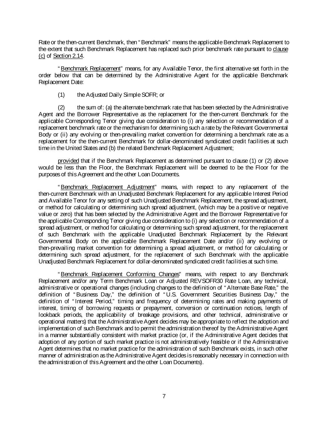 Rate or the then-current Benchmark, then “Benchmark” means the applicable Benchmark Replacement to the extent that such Benchmark Replacement has replaced such prior benchmark rate pursuant to clause (c) of Section 2.14. “Benchmark Replacement” means, for any Available Tenor, the first alternative set forth in the order below that can be determined by the Administrative Agent for the applicable Benchmark Replacement Date: (1) the Adjusted Daily Simple SOFR; or (2) the sum of: (a) the alternate benchmark rate that has been selected by the Administrative Agent and the Borrower Representative as the replacement for the then-current Benchmark for the applicable Corresponding Tenor giving due consideration to (i) any selection or recommendation of a replacement benchmark rate or the mechanism for determining such a rate by the Relevant Governmental Body or (ii) any evolving or then-prevailing market convention for determining a benchmark rate as a replacement for the then-current Benchmark for dollar-denominated syndicated credit facilities at such time in the United States and (b) the related Benchmark Replacement Adjustment; provided that if the Benchmark Replacement as determined pursuant to clause (1) or (2) above would be less than the Floor, the Benchmark Replacement will be deemed to be the Floor for the purposes of this Agreement and the other Loan Documents. “Benchmark Replacement Adjustment” means, with respect to any replacement of the then-current Benchmark with an Unadjusted Benchmark Replacement for any applicable Interest Period and Available Tenor for any setting of such Unadjusted Benchmark Replacement, the spread adjustment, or method for calculating or determining such spread adjustment, (which may be a positive or negative value or zero) that has been selected by the Administrative Agent and the Borrower Representative for the applicable Corresponding Tenor giving due consideration to (i) any selection or recommendation of a spread adjustment, or method for calculating or determining such spread adjustment, for the replacement of such Benchmark with the applicable Unadjusted Benchmark Replacement by the Relevant Governmental Body on the applicable Benchmark Replacement Date and/or (ii) any evolving or then-prevailing market convention for determining a spread adjustment, or method for calculating or determining such spread adjustment, for the replacement of such Benchmark with the applicable Unadjusted Benchmark Replacement for dollar-denominated syndicated credit facilities at such time. “Benchmark Replacement Conforming Changes” means, with respect to any Benchmark Replacement and/or any Term Benchmark Loan or Adjusted REVSOFR30 Rate Loan, any technical, administrative or operational changes (including changes to the definition of “Alternate Base Rate,” the definition of “Business Day,” the definition of “U.S. Government Securities Business Day,” the definition of “Interest Period,” timing and frequency of determining rates and making payments of interest, timing of borrowing requests or prepayment, conversion or continuation notices, length of lookback periods, the applicability of breakage provisions, and other technical, administrative or operational matters) that the Administrative Agent decides may be appropriate to reflect the adoption and implementation of such Benchmark and to permit the administration thereof by the Administrative Agent in a manner substantially consistent with market practice (or, if the Administrative Agent decides that adoption of any portion of such market practice is not administratively feasible or if the Administrative Agent determines that no market practice for the administration of such Benchmark exists, in such other manner of administration as the Administrative Agent decides is reasonably necessary in connection with the administration of this Agreement and the other Loan Documents). 7