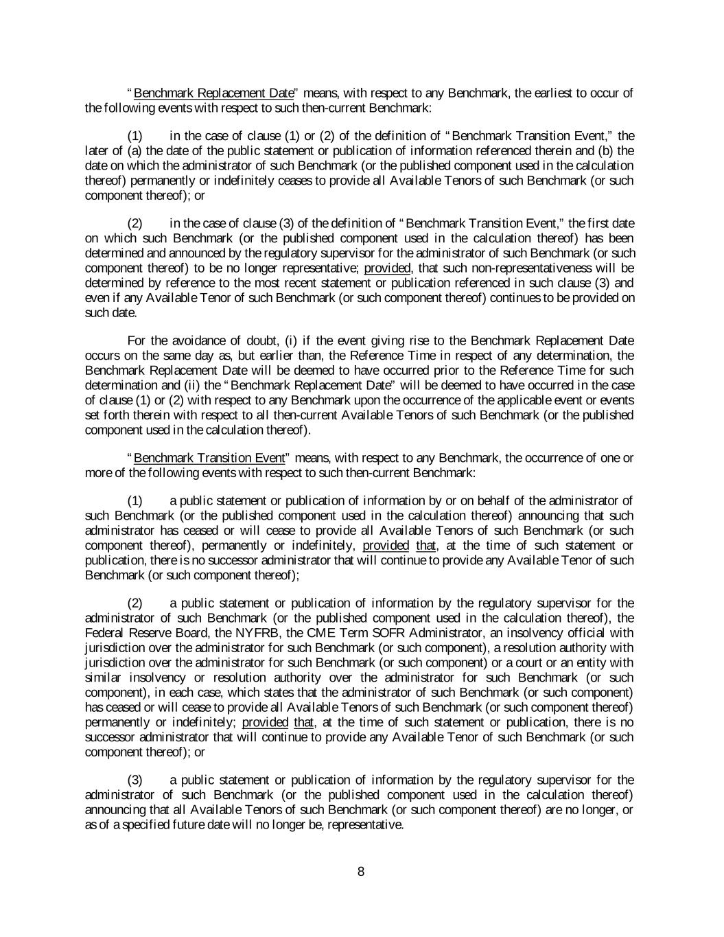 “Benchmark Replacement Date” means, with respect to any Benchmark, the earliest to occur of the following events with respect to such then-current Benchmark: (1) in the case of clause (1) or (2) of the definition of “Benchmark Transition Event,” the later of (a) the date of the public statement or publication of information referenced therein and (b) the date on which the administrator of such Benchmark (or the published component used in the calculation thereof) permanently or indefinitely ceases to provide all Available Tenors of such Benchmark (or such component thereof); or (2) in the case of clause (3) of the definition of “Benchmark Transition Event,” the first date on which such Benchmark (or the published component used in the calculation thereof) has been determined and announced by the regulatory supervisor for the administrator of such Benchmark (or such component thereof) to be no longer representative; provided, that such non-representativeness will be determined by reference to the most recent statement or publication referenced in such clause (3) and even if any Available Tenor of such Benchmark (or such component thereof) continues to be provided on such date. For the avoidance of doubt, (i) if the event giving rise to the Benchmark Replacement Date occurs on the same day as, but earlier than, the Reference Time in respect of any determination, the Benchmark Replacement Date will be deemed to have occurred prior to the Reference Time for such determination and (ii) the “Benchmark Replacement Date” will be deemed to have occurred in the case of clause (1) or (2) with respect to any Benchmark upon the occurrence of the applicable event or events set forth therein with respect to all then-current Available Tenors of such Benchmark (or the published component used in the calculation thereof). “Benchmark Transition Event” means, with respect to any Benchmark, the occurrence of one or more of the following events with respect to such then-current Benchmark: (1) a public statement or publication of information by or on behalf of the administrator of such Benchmark (or the published component used in the calculation thereof) announcing that such administrator has ceased or will cease to provide all Available Tenors of such Benchmark (or such component thereof), permanently or indefinitely, provided that, at the time of such statement or publication, there is no successor administrator that will continue to provide any Available Tenor of such Benchmark (or such component thereof); (2) a public statement or publication of information by the regulatory supervisor for the administrator of such Benchmark (or the published component used in the calculation thereof), the Federal Reserve Board, the NYFRB, the CME Term SOFR Administrator, an insolvency official with jurisdiction over the administrator for such Benchmark (or such component), a resolution authority with jurisdiction over the administrator for such Benchmark (or such component) or a court or an entity with similar insolvency or resolution authority over the administrator for such Benchmark (or such component), in each case, which states that the administrator of such Benchmark (or such component) has ceased or will cease to provide all Available Tenors of such Benchmark (or such component thereof) permanently or indefinitely; provided that, at the time of such statement or publication, there is no successor administrator that will continue to provide any Available Tenor of such Benchmark (or such component thereof); or (3) a public statement or publication of information by the regulatory supervisor for the administrator of such Benchmark (or the published component used in the calculation thereof) announcing that all Available Tenors of such Benchmark (or such component thereof) are no longer, or as of a specified future date will no longer be, representative. 8