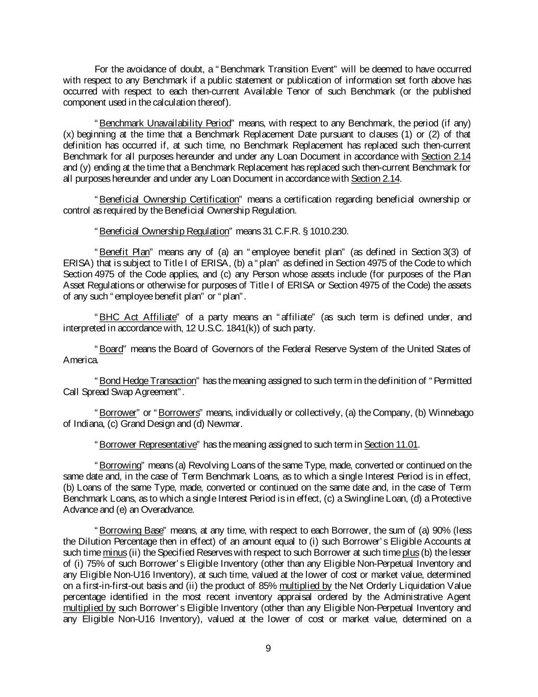 For the avoidance of doubt, a “Benchmark Transition Event” will be deemed to have occurred with respect to any Benchmark if a public statement or publication of information set forth above has occurred with respect to each then-current Available Tenor of such Benchmark (or the published component used in the calculation thereof). “Benchmark Unavailability Period” means, with respect to any Benchmark, the period (if any) (x) beginning at the time that a Benchmark Replacement Date pursuant to clauses (1) or (2) of that definition has occurred if, at such time, no Benchmark Replacement has replaced such then-current Benchmark for all purposes hereunder and under any Loan Document in accordance with Section 2.14 and (y) ending at the time that a Benchmark Replacement has replaced such then-current Benchmark for all purposes hereunder and under any Loan Document in accordance with Section 2.14. “Beneficial Ownership Certification” means a certification regarding beneficial ownership or control as required by the Beneficial Ownership Regulation. “Beneficial Ownership Regulation” means 31 C.F.R. § 1010.230. “Benefit Plan” means any of (a) an “employee benefit plan” (as defined in Section 3(3) of ERISA) that is subject to Title I of ERISA, (b) a “plan” as defined in Section 4975 of the Code to which Section 4975 of the Code applies, and (c) any Person whose assets include (for purposes of the Plan Asset Regulations or otherwise for purposes of Title I of ERISA or Section 4975 of the Code) the assets of any such “employee benefit plan” or “plan”. “BHC Act Affiliate” of a party means an “affiliate” (as such term is defined under, and interpreted in accordance with, 12 U.S.C. 1841(k)) of such party. “Board” means the Board of Governors of the Federal Reserve System of the United States of America. “Bond Hedge Transaction” has the meaning assigned to such term in the definition of “Permitted Call Spread Swap Agreement”. “Borrower” or “Borrowers” means, individually or collectively, (a) the Company, (b) Winnebago of Indiana, (c) Grand Design and (d) Newmar. “Borrower Representative” has the meaning assigned to such term in Section 11.01. “Borrowing” means (a) Revolving Loans of the same Type, made, converted or continued on the same date and, in the case of Term Benchmark Loans, as to which a single Interest Period is in effect, (b) Loans of the same Type, made, converted or continued on the same date and, in the case of Term Benchmark Loans, as to which a single Interest Period is in effect, (c) a Swingline Loan, (d) a Protective Advance and (e) an Overadvance. “Borrowing Base” means, at any time, with respect to each Borrower, the sum of (a) 90% (less the Dilution Percentage then in effect) of an amount equal to (i) such Borrower’s Eligible Accounts at such time minus (ii) the Specified Reserves with respect to such Borrower at such time plus (b) the lesser of (i) 75% of such Borrower’s Eligible Inventory (other than any Eligible Non-Perpetual Inventory and any Eligible Non-U16 Inventory), at such time, valued at the lower of cost or market value, determined on a first-in-first-out basis and (ii) the product of 85% multiplied by the Net Orderly Liquidation Value percentage identified in the most recent inventory appraisal ordered by the Administrative Agent multiplied by such Borrower’s Eligible Inventory (other than any Eligible Non-Perpetual Inventory and any Eligible Non-U16 Inventory), valued at the lower of cost or market value, determined on a 9