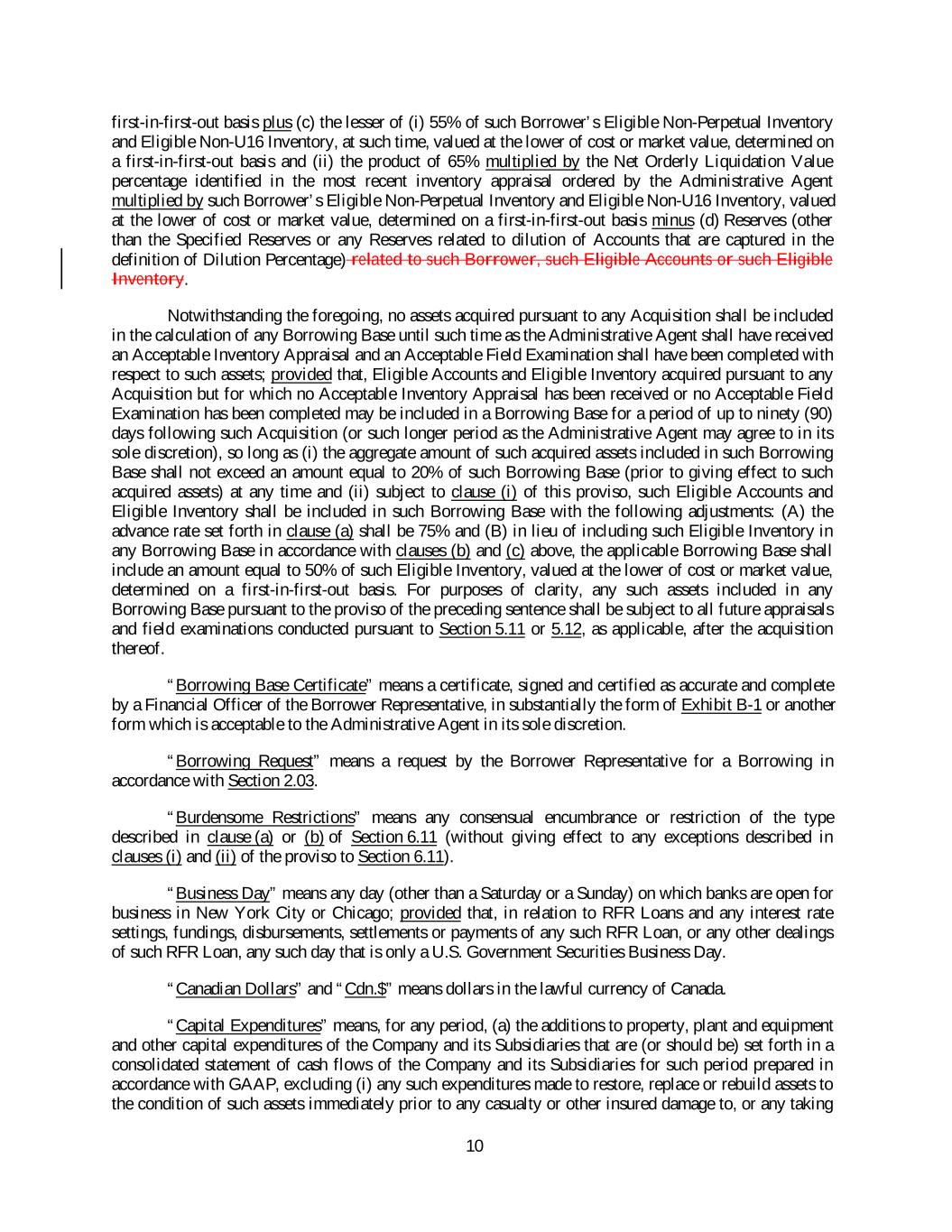 first-in-first-out basis plus (c) the lesser of (i) 55% of such Borrower’s Eligible Non-Perpetual Inventory and Eligible Non-U16 Inventory, at such time, valued at the lower of cost or market value, determined on a first-in-first-out basis and (ii) the product of 65% multiplied by the Net Orderly Liquidation Value percentage identified in the most recent inventory appraisal ordered by the Administrative Agent multiplied by such Borrower’s Eligible Non-Perpetual Inventory and Eligible Non-U16 Inventory, valued at the lower of cost or market value, determined on a first-in-first-out basis minus (d) Reserves (other than the Specified Reserves or any Reserves related to dilution of Accounts that are captured in the definition of Dilution Percentage) related to such Borrower, such Eligible Accounts or such Eligible Inventory. Notwithstanding the foregoing, no assets acquired pursuant to any Acquisition shall be included in the calculation of any Borrowing Base until such time as the Administrative Agent shall have received an Acceptable Inventory Appraisal and an Acceptable Field Examination shall have been completed with respect to such assets; provided that, Eligible Accounts and Eligible Inventory acquired pursuant to any Acquisition but for which no Acceptable Inventory Appraisal has been received or no Acceptable Field Examination has been completed may be included in a Borrowing Base for a period of up to ninety (90) days following such Acquisition (or such longer period as the Administrative Agent may agree to in its sole discretion), so long as (i) the aggregate amount of such acquired assets included in such Borrowing Base shall not exceed an amount equal to 20% of such Borrowing Base (prior to giving effect to such acquired assets) at any time and (ii) subject to clause (i) of this proviso, such Eligible Accounts and Eligible Inventory shall be included in such Borrowing Base with the following adjustments: (A) the advance rate set forth in clause (a) shall be 75% and (B) in lieu of including such Eligible Inventory in any Borrowing Base in accordance with clauses (b) and (c) above, the applicable Borrowing Base shall include an amount equal to 50% of such Eligible Inventory, valued at the lower of cost or market value, determined on a first-in-first-out basis. For purposes of clarity, any such assets included in any Borrowing Base pursuant to the proviso of the preceding sentence shall be subject to all future appraisals and field examinations conducted pursuant to Section 5.11 or 5.12, as applicable, after the acquisition thereof. “Borrowing Base Certificate” means a certificate, signed and certified as accurate and complete by a Financial Officer of the Borrower Representative, in substantially the form of Exhibit B-1 or another form which is acceptable to the Administrative Agent in its sole discretion. “Borrowing Request” means a request by the Borrower Representative for a Borrowing in accordance with Section 2.03. “Burdensome Restrictions” means any consensual encumbrance or restriction of the type described in clause (a) or (b) of Section 6.11 (without giving effect to any exceptions described in clauses (i) and (ii) of the proviso to Section 6.11). “Business Day” means any day (other than a Saturday or a Sunday) on which banks are open for business in New York City or Chicago; provided that, in relation to RFR Loans and any interest rate settings, fundings, disbursements, settlements or payments of any such RFR Loan, or any other dealings of such RFR Loan, any such day that is only a U.S. Government Securities Business Day. “Canadian Dollars” and “Cdn.$” means dollars in the lawful currency of Canada. “Capital Expenditures” means, for any period, (a) the additions to property, plant and equipment and other capital expenditures of the Company and its Subsidiaries that are (or should be) set forth in a consolidated statement of cash flows of the Company and its Subsidiaries for such period prepared in accordance with GAAP, excluding (i) any such expenditures made to restore, replace or rebuild assets to the condition of such assets immediately prior to any casualty or other insured damage to, or any taking 10