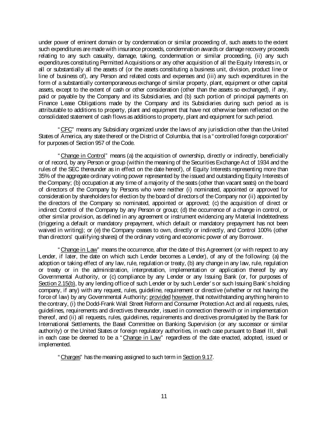 under power of eminent domain or by condemnation or similar proceeding of, such assets to the extent such expenditures are made with insurance proceeds, condemnation awards or damage recovery proceeds relating to any such casualty, damage, taking, condemnation or similar proceeding, (ii) any such expenditures constituting Permitted Acquisitions or any other acquisition of all the Equity Interests in, or all or substantially all the assets of (or the assets constituting a business unit, division, product line or line of business of), any Person and related costs and expenses and (iii) any such expenditures in the form of a substantially contemporaneous exchange of similar property, plant, equipment or other capital assets, except to the extent of cash or other consideration (other than the assets so exchanged), if any, paid or payable by the Company and its Subsidiaries, and (b) such portion of principal payments on Finance Lease Obligations made by the Company and its Subsidiaries during such period as is attributable to additions to property, plant and equipment that have not otherwise been reflected on the consolidated statement of cash flows as additions to property, plant and equipment for such period. “CFC” means any Subsidiary organized under the laws of any jurisdiction other than the United States of America, any state thereof or the District of Columbia, that is a “controlled foreign corporation” for purposes of Section 957 of the Code. “Change in Control” means (a) the acquisition of ownership, directly or indirectly, beneficially or of record, by any Person or group (within the meaning of the Securities Exchange Act of 1934 and the rules of the SEC thereunder as in effect on the date hereof), of Equity Interests representing more than 35% of the aggregate ordinary voting power represented by the issued and outstanding Equity Interests of the Company; (b) occupation at any time of a majority of the seats (other than vacant seats) on the board of directors of the Company by Persons who were neither (i) nominated, appointed or approved for consideration by shareholders for election by the board of directors of the Company nor (ii) appointed by the directors of the Company so nominated, appointed or approved; (c) the acquisition of direct or indirect Control of the Company by any Person or group; (d) the occurrence of a change in control, or other similar provision, as defined in any agreement or instrument evidencing any Material Indebtedness (triggering a default or mandatory prepayment, which default or mandatory prepayment has not been waived in writing); or (e) the Company ceases to own, directly or indirectly, and Control 100% (other than directors’ qualifying shares) of the ordinary voting and economic power of any Borrower. “Change in Law” means the occurrence, after the date of this Agreement (or with respect to any Lender, if later, the date on which such Lender becomes a Lender), of any of the following: (a) the adoption or taking effect of any law, rule, regulation or treaty, (b) any change in any law, rule, regulation or treaty or in the administration, interpretation, implementation or application thereof by any Governmental Authority, or (c) compliance by any Lender or any Issuing Bank (or, for purposes of Section 2.15(b), by any lending office of such Lender or by such Lender’s or such Issuing Bank’s holding company, if any) with any request, rules, guideline, requirement or directive (whether or not having the force of law) by any Governmental Authority; provided however, that notwithstanding anything herein to the contrary, (i) the Dodd-Frank Wall Street Reform and Consumer Protection Act and all requests, rules, guidelines, requirements and directives thereunder, issued in connection therewith or in implementation thereof, and (ii) all requests, rules, guidelines, requirements and directives promulgated by the Bank for International Settlements, the Basel Committee on Banking Supervision (or any successor or similar authority) or the United States or foreign regulatory authorities, in each case pursuant to Basel III, shall in each case be deemed to be a “Change in Law” regardless of the date enacted, adopted, issued or implemented. “Charges” has the meaning assigned to such term in Section 9.17. 11