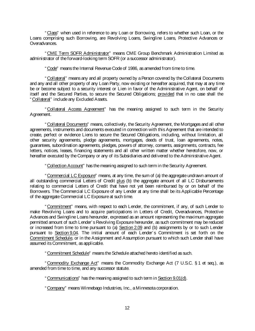 “Class” when used in reference to any Loan or Borrowing, refers to whether such Loan, or the Loans comprising such Borrowing, are Revolving Loans, Swingline Loans, Protective Advances or Overadvances. “CME Term SOFR Administrator” means CME Group Benchmark Administration Limited as administrator of the forward-looking term SOFR (or a successor administrator). “Code” means the Internal Revenue Code of 1986, as amended from time to time. “Collateral” means any and all property owned by a Person covered by the Collateral Documents and any and all other property of any Loan Party, now existing or hereafter acquired, that may at any time be or become subject to a security interest or Lien in favor of the Administrative Agent, on behalf of itself and the Secured Parties, to secure the Secured Obligations; provided that in no case shall the “Collateral” include any Excluded Assets. “Collateral Access Agreement” has the meaning assigned to such term in the Security Agreement. “Collateral Documents” means, collectively, the Security Agreement, the Mortgages and all other agreements, instruments and documents executed in connection with this Agreement that are intended to create, perfect or evidence Liens to secure the Secured Obligations, including, without limitation, all other security agreements, pledge agreements, mortgages, deeds of trust, loan agreements, notes, guarantees, subordination agreements, pledges, powers of attorney, consents, assignments, contracts, fee letters, notices, leases, financing statements and all other written matter whether heretofore, now, or hereafter executed by the Company or any of its Subsidiaries and delivered to the Administrative Agent. “Collection Account” has the meaning assigned to such term in the Security Agreement. “Commercial LC Exposure” means, at any time, the sum of (a) the aggregate undrawn amount of all outstanding commercial Letters of Credit plus (b) the aggregate amount of all LC Disbursements relating to commercial Letters of Credit that have not yet been reimbursed by or on behalf of the Borrowers. The Commercial LC Exposure of any Lender at any time shall be its Applicable Percentage of the aggregate Commercial LC Exposure at such time. “Commitment” means, with respect to each Lender, the commitment, if any, of such Lender to make Revolving Loans and to acquire participations in Letters of Credit, Overadvances, Protective Advances and Swingline Loans hereunder, expressed as an amount representing the maximum aggregate permitted amount of such Lender’s Revolving Exposure hereunder, as such commitment may be reduced or increased from time to time pursuant to (a) Section 2.09 and (b) assignments by or to such Lender pursuant to Section 9.04. The initial amount of each Lender’s Commitment is set forth on the Commitment Schedule, or in the Assignment and Assumption pursuant to which such Lender shall have assumed its Commitment, as applicable. “Commitment Schedule” means the Schedule attached hereto identified as such. “Commodity Exchange Act” means the Commodity Exchange Act (7 U.S.C. § 1 et seq.), as amended from time to time, and any successor statute. “Communications” has the meaning assigned to such term in Section 9.01(d). “Company” means Winnebago Industries, Inc., a Minnesota corporation. 12