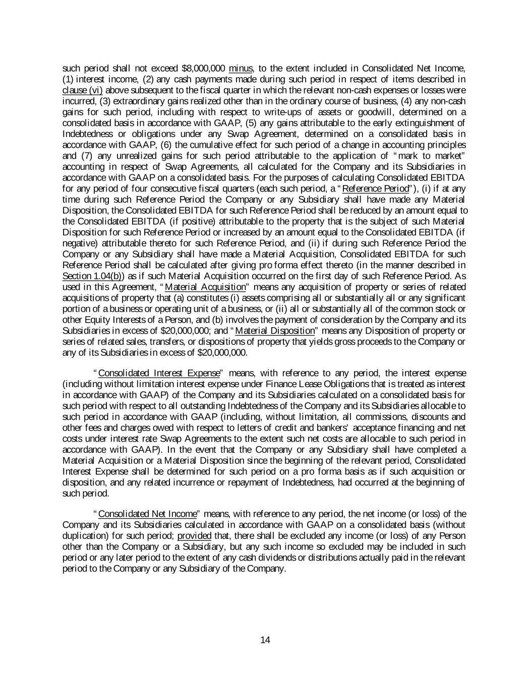 such period shall not exceed $8,000,000 minus, to the extent included in Consolidated Net Income, (1) interest income, (2) any cash payments made during such period in respect of items described in clause (vi) above subsequent to the fiscal quarter in which the relevant non-cash expenses or losses were incurred, (3) extraordinary gains realized other than in the ordinary course of business, (4) any non-cash gains for such period, including with respect to write-ups of assets or goodwill, determined on a consolidated basis in accordance with GAAP, (5) any gains attributable to the early extinguishment of Indebtedness or obligations under any Swap Agreement, determined on a consolidated basis in accordance with GAAP, (6) the cumulative effect for such period of a change in accounting principles and (7) any unrealized gains for such period attributable to the application of “mark to market” accounting in respect of Swap Agreements, all calculated for the Company and its Subsidiaries in accordance with GAAP on a consolidated basis. For the purposes of calculating Consolidated EBITDA for any period of four consecutive fiscal quarters (each such period, a “Reference Period”), (i) if at any time during such Reference Period the Company or any Subsidiary shall have made any Material Disposition, the Consolidated EBITDA for such Reference Period shall be reduced by an amount equal to the Consolidated EBITDA (if positive) attributable to the property that is the subject of such Material Disposition for such Reference Period or increased by an amount equal to the Consolidated EBITDA (if negative) attributable thereto for such Reference Period, and (ii) if during such Reference Period the Company or any Subsidiary shall have made a Material Acquisition, Consolidated EBITDA for such Reference Period shall be calculated after giving pro forma effect thereto (in the manner described in Section 1.04(b)) as if such Material Acquisition occurred on the first day of such Reference Period. As used in this Agreement, “Material Acquisition” means any acquisition of property or series of related acquisitions of property that (a) constitutes (i) assets comprising all or substantially all or any significant portion of a business or operating unit of a business, or (ii) all or substantially all of the common stock or other Equity Interests of a Person, and (b) involves the payment of consideration by the Company and its Subsidiaries in excess of $20,000,000; and “Material Disposition” means any Disposition of property or series of related sales, transfers, or dispositions of property that yields gross proceeds to the Company or any of its Subsidiaries in excess of $20,000,000. “Consolidated Interest Expense” means, with reference to any period, the interest expense (including without limitation interest expense under Finance Lease Obligations that is treated as interest in accordance with GAAP) of the Company and its Subsidiaries calculated on a consolidated basis for such period with respect to all outstanding Indebtedness of the Company and its Subsidiaries allocable to such period in accordance with GAAP (including, without limitation, all commissions, discounts and other fees and charges owed with respect to letters of credit and bankers’ acceptance financing and net costs under interest rate Swap Agreements to the extent such net costs are allocable to such period in accordance with GAAP). In the event that the Company or any Subsidiary shall have completed a Material Acquisition or a Material Disposition since the beginning of the relevant period, Consolidated Interest Expense shall be determined for such period on a pro forma basis as if such acquisition or disposition, and any related incurrence or repayment of Indebtedness, had occurred at the beginning of such period. “Consolidated Net Income” means, with reference to any period, the net income (or loss) of the Company and its Subsidiaries calculated in accordance with GAAP on a consolidated basis (without duplication) for such period; provided that, there shall be excluded any income (or loss) of any Person other than the Company or a Subsidiary, but any such income so excluded may be included in such period or any later period to the extent of any cash dividends or distributions actually paid in the relevant period to the Company or any Subsidiary of the Company. 14