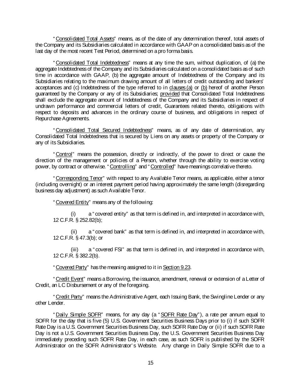 “Consolidated Total Assets” means, as of the date of any determination thereof, total assets of the Company and its Subsidiaries calculated in accordance with GAAP on a consolidated basis as of the last day of the most recent Test Period, determined on a pro forma basis. “Consolidated Total Indebtedness” means at any time the sum, without duplication, of (a) the aggregate Indebtedness of the Company and its Subsidiaries calculated on a consolidated basis as of such time in accordance with GAAP, (b) the aggregate amount of Indebtedness of the Company and its Subsidiaries relating to the maximum drawing amount of all letters of credit outstanding and bankers’ acceptances and (c) Indebtedness of the type referred to in clauses (a) or (b) hereof of another Person guaranteed by the Company or any of its Subsidiaries; provided that Consolidated Total Indebtedness shall exclude the aggregate amount of Indebtedness of the Company and its Subsidiaries in respect of undrawn performance and commercial letters of credit, Guarantees related thereto, obligations with respect to deposits and advances in the ordinary course of business, and obligations in respect of Repurchase Agreements. “Consolidated Total Secured Indebtedness” means, as of any date of determination, any Consolidated Total Indebtedness that is secured by Liens on any assets or property of the Company or any of its Subsidiaries. “Control” means the possession, directly or indirectly, of the power to direct or cause the direction of the management or policies of a Person, whether through the ability to exercise voting power, by contract or otherwise. “Controlling” and “Controlled” have meanings correlative thereto. “Corresponding Tenor” with respect to any Available Tenor means, as applicable, either a tenor (including overnight) or an interest payment period having approximately the same length (disregarding business day adjustment) as such Available Tenor. “Covered Entity” means any of the following: (i) a “covered entity” as that term is defined in, and interpreted in accordance with, 12 C.F.R. § 252.82(b); (ii) a “covered bank” as that term is defined in, and interpreted in accordance with, 12 C.F.R. § 47.3(b); or (iii) a “covered FSI” as that term is defined in, and interpreted in accordance with, 12 C.F.R. § 382.2(b). “Covered Party” has the meaning assigned to it in Section 9.23. “Credit Event” means a Borrowing, the issuance, amendment, renewal or extension of a Letter of Credit, an LC Disbursement or any of the foregoing. “Credit Party” means the Administrative Agent, each Issuing Bank, the Swingline Lender or any other Lender. “Daily Simple SOFR” means, for any day (a “SOFR Rate Day”), a rate per annum equal to SOFR for the day that is five (5) U.S. Government Securities Business Days prior to (i) if such SOFR Rate Day is a U.S. Government Securities Business Day, such SOFR Rate Day or (ii) if such SOFR Rate Day is not a U.S. Government Securities Business Day, the U.S. Government Securities Business Day immediately preceding such SOFR Rate Day, in each case, as such SOFR is published by the SOFR Administrator on the SOFR Administrator’s Website. Any change in Daily Simple SOFR due to a 15