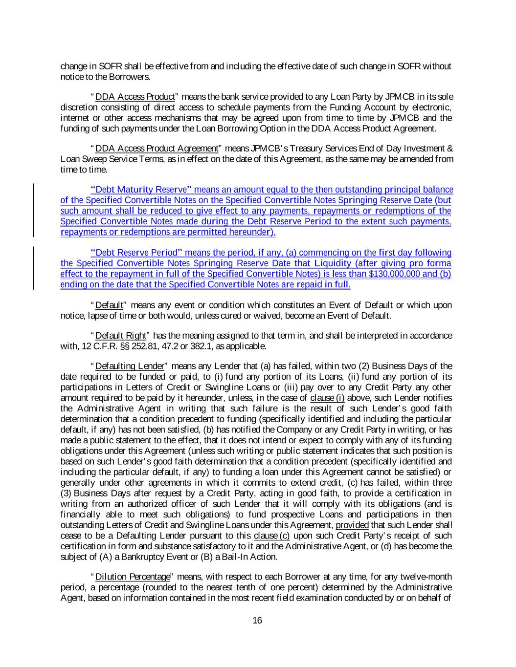 change in SOFR shall be effective from and including the effective date of such change in SOFR without notice to the Borrowers. “DDA Access Product” means the bank service provided to any Loan Party by JPMCB in its sole discretion consisting of direct access to schedule payments from the Funding Account by electronic, internet or other access mechanisms that may be agreed upon from time to time by JPMCB and the funding of such payments under the Loan Borrowing Option in the DDA Access Product Agreement. “DDA Access Product Agreement” means JPMCB’s Treasury Services End of Day Investment & Loan Sweep Service Terms, as in effect on the date of this Agreement, as the same may be amended from time to time. “Debt Maturity Reserve” means an amount equal to the then outstanding principal balance of the Specified Convertible Notes on the Specified Convertible Notes Springing Reserve Date (but such amount shall be reduced to give effect to any payments, repayments or redemptions of the Specified Convertible Notes made during the Debt Reserve Period to the extent such payments, repayments or redemptions are permitted hereunder). “Debt Reserve Period” means the period, if any, (a) commencing on the first day following the Specified Convertible Notes Springing Reserve Date that Liquidity (after giving pro forma effect to the repayment in full of the Specified Convertible Notes) is less than $130,000,000 and (b) ending on the date that the Specified Convertible Notes are repaid in full. “Default” means any event or condition which constitutes an Event of Default or which upon notice, lapse of time or both would, unless cured or waived, become an Event of Default. “Default Right” has the meaning assigned to that term in, and shall be interpreted in accordance with, 12 C.F.R. §§ 252.81, 47.2 or 382.1, as applicable. “Defaulting Lender” means any Lender that (a) has failed, within two (2) Business Days of the date required to be funded or paid, to (i) fund any portion of its Loans, (ii) fund any portion of its participations in Letters of Credit or Swingline Loans or (iii) pay over to any Credit Party any other amount required to be paid by it hereunder, unless, in the case of clause (i) above, such Lender notifies the Administrative Agent in writing that such failure is the result of such Lender’s good faith determination that a condition precedent to funding (specifically identified and including the particular default, if any) has not been satisfied, (b) has notified the Company or any Credit Party in writing, or has made a public statement to the effect, that it does not intend or expect to comply with any of its funding obligations under this Agreement (unless such writing or public statement indicates that such position is based on such Lender’s good faith determination that a condition precedent (specifically identified and including the particular default, if any) to funding a loan under this Agreement cannot be satisfied) or generally under other agreements in which it commits to extend credit, (c) has failed, within three (3) Business Days after request by a Credit Party, acting in good faith, to provide a certification in writing from an authorized officer of such Lender that it will comply with its obligations (and is financially able to meet such obligations) to fund prospective Loans and participations in then outstanding Letters of Credit and Swingline Loans under this Agreement, provided that such Lender shall cease to be a Defaulting Lender pursuant to this clause (c) upon such Credit Party’s receipt of such certification in form and substance satisfactory to it and the Administrative Agent, or (d) has become the subject of (A) a Bankruptcy Event or (B) a Bail-In Action. “Dilution Percentage” means, with respect to each Borrower at any time, for any twelve-month period, a percentage (rounded to the nearest tenth of one percent) determined by the Administrative Agent, based on information contained in the most recent field examination conducted by or on behalf of 16