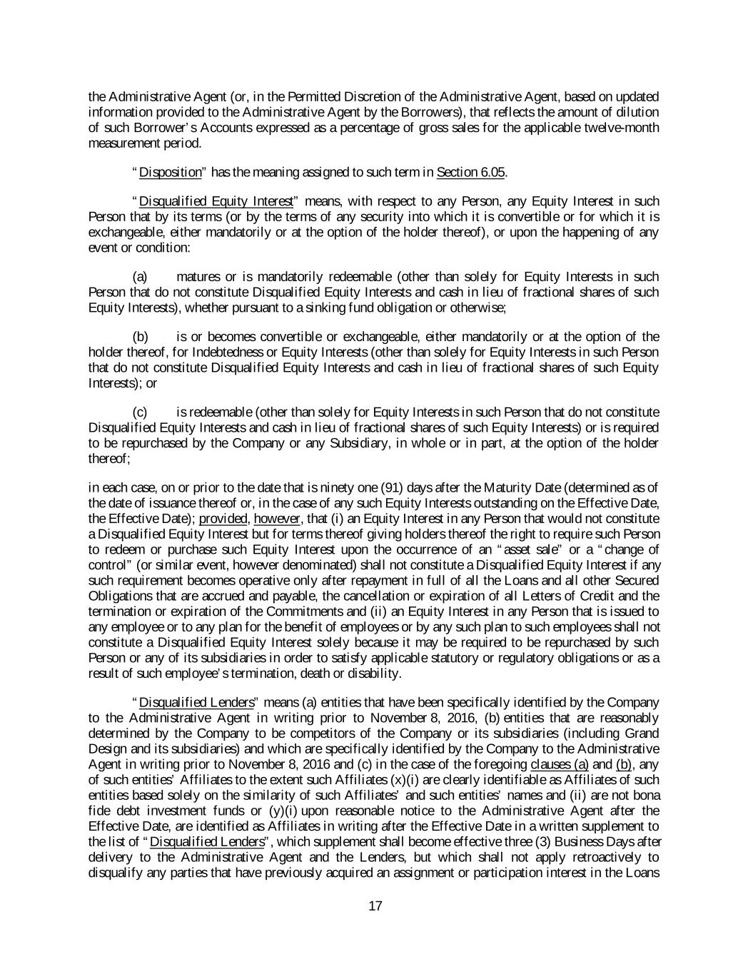 the Administrative Agent (or, in the Permitted Discretion of the Administrative Agent, based on updated information provided to the Administrative Agent by the Borrowers), that reflects the amount of dilution of such Borrower’s Accounts expressed as a percentage of gross sales for the applicable twelve-month measurement period. “Disposition” has the meaning assigned to such term in Section 6.05. “Disqualified Equity Interest” means, with respect to any Person, any Equity Interest in such Person that by its terms (or by the terms of any security into which it is convertible or for which it is exchangeable, either mandatorily or at the option of the holder thereof), or upon the happening of any event or condition: (a) matures or is mandatorily redeemable (other than solely for Equity Interests in such Person that do not constitute Disqualified Equity Interests and cash in lieu of fractional shares of such Equity Interests), whether pursuant to a sinking fund obligation or otherwise; (b) is or becomes convertible or exchangeable, either mandatorily or at the option of the holder thereof, for Indebtedness or Equity Interests (other than solely for Equity Interests in such Person that do not constitute Disqualified Equity Interests and cash in lieu of fractional shares of such Equity Interests); or (c) is redeemable (other than solely for Equity Interests in such Person that do not constitute Disqualified Equity Interests and cash in lieu of fractional shares of such Equity Interests) or is required to be repurchased by the Company or any Subsidiary, in whole or in part, at the option of the holder thereof; in each case, on or prior to the date that is ninety one (91) days after the Maturity Date (determined as of the date of issuance thereof or, in the case of any such Equity Interests outstanding on the Effective Date, the Effective Date); provided, however, that (i) an Equity Interest in any Person that would not constitute a Disqualified Equity Interest but for terms thereof giving holders thereof the right to require such Person to redeem or purchase such Equity Interest upon the occurrence of an “asset sale” or a “change of control” (or similar event, however denominated) shall not constitute a Disqualified Equity Interest if any such requirement becomes operative only after repayment in full of all the Loans and all other Secured Obligations that are accrued and payable, the cancellation or expiration of all Letters of Credit and the termination or expiration of the Commitments and (ii) an Equity Interest in any Person that is issued to any employee or to any plan for the benefit of employees or by any such plan to such employees shall not constitute a Disqualified Equity Interest solely because it may be required to be repurchased by such Person or any of its subsidiaries in order to satisfy applicable statutory or regulatory obligations or as a result of such employee’s termination, death or disability. “Disqualified Lenders” means (a) entities that have been specifically identified by the Company to the Administrative Agent in writing prior to November 8, 2016, (b) entities that are reasonably determined by the Company to be competitors of the Company or its subsidiaries (including Grand Design and its subsidiaries) and which are specifically identified by the Company to the Administrative Agent in writing prior to November 8, 2016 and (c) in the case of the foregoing clauses (a) and (b), any of such entities’ Affiliates to the extent such Affiliates (x)(i) are clearly identifiable as Affiliates of such entities based solely on the similarity of such Affiliates’ and such entities’ names and (ii) are not bona fide debt investment funds or (y)(i) upon reasonable notice to the Administrative Agent after the Effective Date, are identified as Affiliates in writing after the Effective Date in a written supplement to the list of “Disqualified Lenders”, which supplement shall become effective three (3) Business Days after delivery to the Administrative Agent and the Lenders, but which shall not apply retroactively to disqualify any parties that have previously acquired an assignment or participation interest in the Loans 17