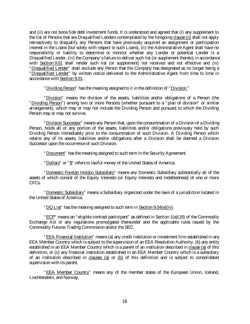 and (ii) are not bona fide debt investment funds. It is understood and agreed that (i) any supplement to the list of Persons that are Disqualified Lenders contemplated by the foregoing clause (c) shall not apply retroactively to disqualify any Persons that have previously acquired an assignment or participation interest in the Loans (but solely with respect to such Loans), (ii) the Administrative Agent shall have no responsibility or liability to determine or monitor whether any Lender or potential Lender is a Disqualified Lender, (iii) the Company’s failure to deliver such list (or supplement thereto) in accordance with Section 9.01 shall render such list (or supplement) not received and not effective and (iv) “Disqualified Lender” shall exclude any Person that the Company has designated as no longer being a “Disqualified Lender” by written notice delivered to the Administrative Agent from time to time in accordance with Section 9.01. “Dividing Person” has the meaning assigned to it in the definition of “Division.” “Division” means the division of the assets, liabilities and/or obligations of a Person (the “Dividing Person”) among two or more Persons (whether pursuant to a “plan of division” or similar arrangement), which may or may not include the Dividing Person and pursuant to which the Dividing Person may or may not survive. “Division Successor” means any Person that, upon the consummation of a Division of a Dividing Person, holds all or any portion of the assets, liabilities and/or obligations previously held by such Dividing Person immediately prior to the consummation of such Division. A Dividing Person which retains any of its assets, liabilities and/or obligations after a Division shall be deemed a Division Successor upon the occurrence of such Division. “Document” has the meaning assigned to such term in the Security Agreement. “Dollars” or “$” refers to lawful money of the United States of America. “Domestic Foreign Holdco Subsidiary” means any Domestic Subsidiary substantially all of the assets of which consist of the Equity Interests (or Equity Interests and Indebtedness) of one or more CFCs. “Domestic Subsidiary” means a Subsidiary organized under the laws of a jurisdiction located in the United States of America. “DQ List” has the meaning assigned to such term in Section 9.04(e)(iv). “ECP” means an “eligible contract participant” as defined in Section 1(a)(18) of the Commodity Exchange Act or any regulations promulgated thereunder and the applicable rules issued by the Commodity Futures Trading Commission and/or the SEC. “EEA Financial Institution” means (a) any credit institution or investment firm established in any EEA Member Country which is subject to the supervision of an EEA Resolution Authority, (b) any entity established in an EEA Member Country which is a parent of an institution described in clause (a) of this definition, or (c) any financial institution established in an EEA Member Country which is a subsidiary of an institution described in clauses (a) or (b) of this definition and is subject to consolidated supervision with its parent. “EEA Member Country” means any of the member states of the European Union, Iceland, Liechtenstein, and Norway. 18