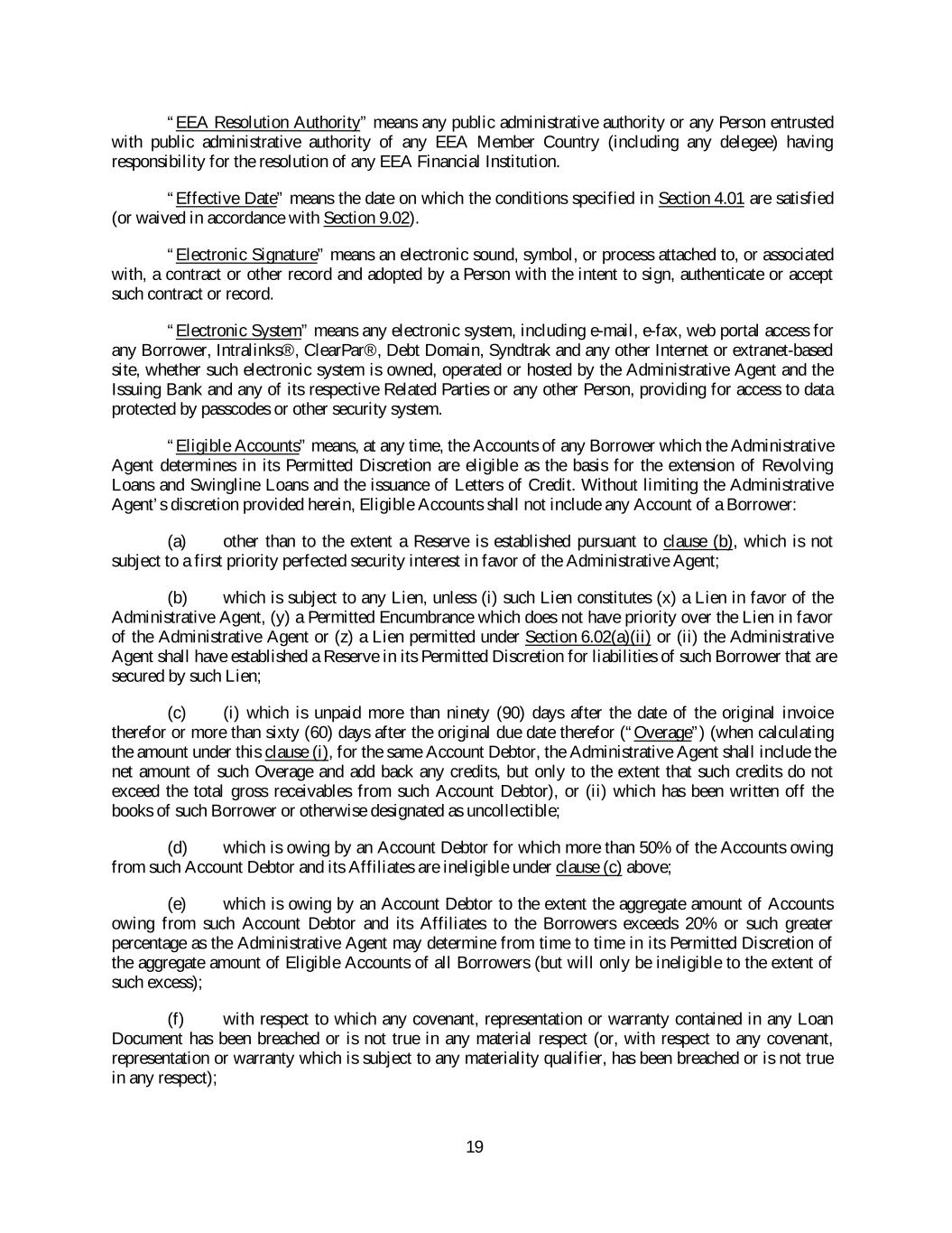 “EEA Resolution Authority” means any public administrative authority or any Person entrusted with public administrative authority of any EEA Member Country (including any delegee) having responsibility for the resolution of any EEA Financial Institution. “Effective Date” means the date on which the conditions specified in Section 4.01 are satisfied (or waived in accordance with Section 9.02). “Electronic Signature” means an electronic sound, symbol, or process attached to, or associated with, a contract or other record and adopted by a Person with the intent to sign, authenticate or accept such contract or record. “Electronic System” means any electronic system, including e-mail, e-fax, web portal access for any Borrower, Intralinks®, ClearPar®, Debt Domain, Syndtrak and any other Internet or extranet-based site, whether such electronic system is owned, operated or hosted by the Administrative Agent and the Issuing Bank and any of its respective Related Parties or any other Person, providing for access to data protected by passcodes or other security system. “Eligible Accounts” means, at any time, the Accounts of any Borrower which the Administrative Agent determines in its Permitted Discretion are eligible as the basis for the extension of Revolving Loans and Swingline Loans and the issuance of Letters of Credit. Without limiting the Administrative Agent’s discretion provided herein, Eligible Accounts shall not include any Account of a Borrower: (a) other than to the extent a Reserve is established pursuant to clause (b), which is not subject to a first priority perfected security interest in favor of the Administrative Agent; (b) which is subject to any Lien, unless (i) such Lien constitutes (x) a Lien in favor of the Administrative Agent, (y) a Permitted Encumbrance which does not have priority over the Lien in favor of the Administrative Agent or (z) a Lien permitted under Section 6.02(a)(ii) or (ii) the Administrative Agent shall have established a Reserve in its Permitted Discretion for liabilities of such Borrower that are secured by such Lien; (c) (i) which is unpaid more than ninety (90) days after the date of the original invoice therefor or more than sixty (60) days after the original due date therefor (“Overage”) (when calculating the amount under this clause (i), for the same Account Debtor, the Administrative Agent shall include the net amount of such Overage and add back any credits, but only to the extent that such credits do not exceed the total gross receivables from such Account Debtor), or (ii) which has been written off the books of such Borrower or otherwise designated as uncollectible; (d) which is owing by an Account Debtor for which more than 50% of the Accounts owing from such Account Debtor and its Affiliates are ineligible under clause (c) above; (e) which is owing by an Account Debtor to the extent the aggregate amount of Accounts owing from such Account Debtor and its Affiliates to the Borrowers exceeds 20% or such greater percentage as the Administrative Agent may determine from time to time in its Permitted Discretion of the aggregate amount of Eligible Accounts of all Borrowers (but will only be ineligible to the extent of such excess); (f) with respect to which any covenant, representation or warranty contained in any Loan Document has been breached or is not true in any material respect (or, with respect to any covenant, representation or warranty which is subject to any materiality qualifier, has been breached or is not true in any respect); 19