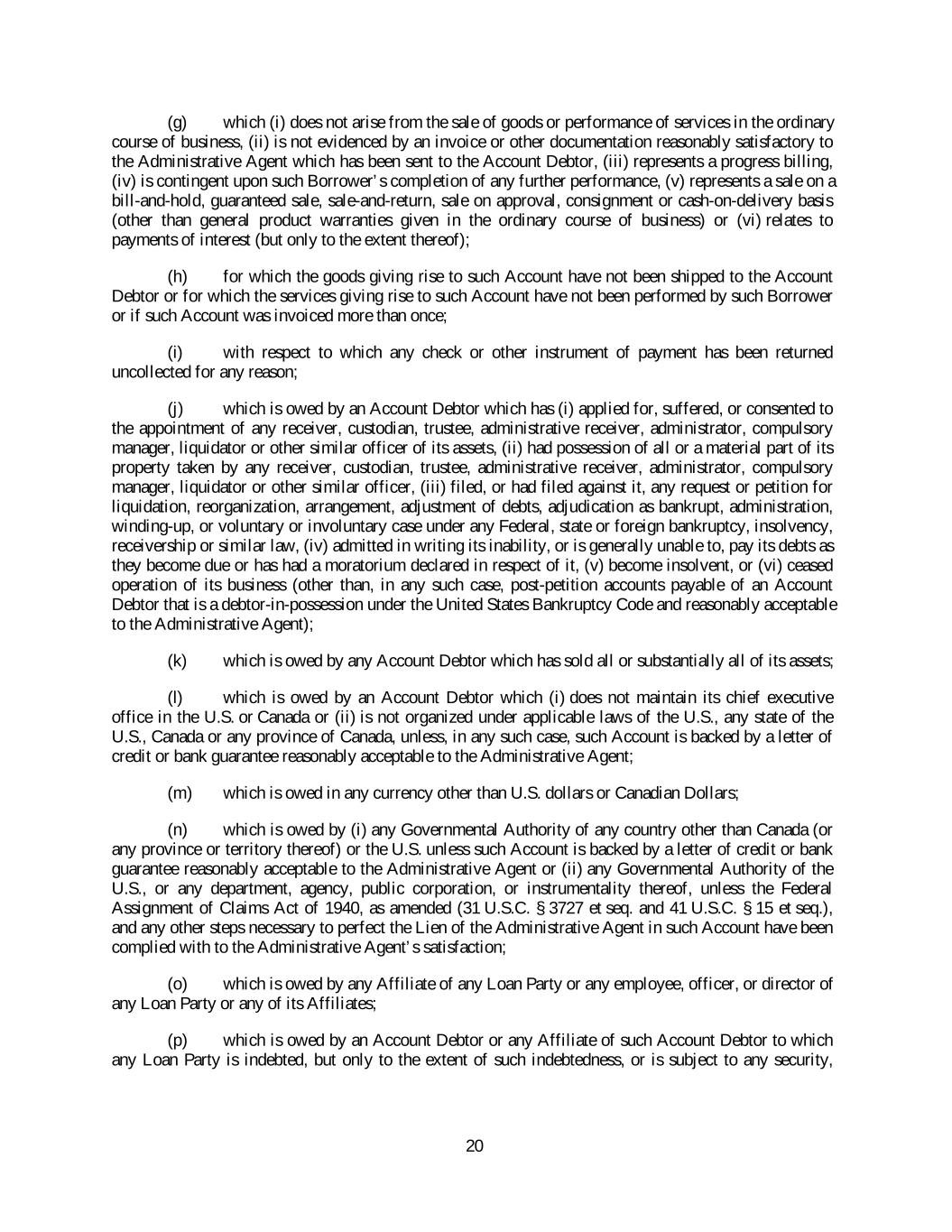 (g) which (i) does not arise from the sale of goods or performance of services in the ordinary course of business, (ii) is not evidenced by an invoice or other documentation reasonably satisfactory to the Administrative Agent which has been sent to the Account Debtor, (iii) represents a progress billing, (iv) is contingent upon such Borrower’s completion of any further performance, (v) represents a sale on a bill-and-hold, guaranteed sale, sale-and-return, sale on approval, consignment or cash-on-delivery basis (other than general product warranties given in the ordinary course of business) or (vi) relates to payments of interest (but only to the extent thereof); (h) for which the goods giving rise to such Account have not been shipped to the Account Debtor or for which the services giving rise to such Account have not been performed by such Borrower or if such Account was invoiced more than once; (i) with respect to which any check or other instrument of payment has been returned uncollected for any reason; (j) which is owed by an Account Debtor which has (i) applied for, suffered, or consented to the appointment of any receiver, custodian, trustee, administrative receiver, administrator, compulsory manager, liquidator or other similar officer of its assets, (ii) had possession of all or a material part of its property taken by any receiver, custodian, trustee, administrative receiver, administrator, compulsory manager, liquidator or other similar officer, (iii) filed, or had filed against it, any request or petition for liquidation, reorganization, arrangement, adjustment of debts, adjudication as bankrupt, administration, winding-up, or voluntary or involuntary case under any Federal, state or foreign bankruptcy, insolvency, receivership or similar law, (iv) admitted in writing its inability, or is generally unable to, pay its debts as they become due or has had a moratorium declared in respect of it, (v) become insolvent, or (vi) ceased operation of its business (other than, in any such case, post-petition accounts payable of an Account Debtor that is a debtor-in-possession under the United States Bankruptcy Code and reasonably acceptable to the Administrative Agent); (k) which is owed by any Account Debtor which has sold all or substantially all of its assets; (l) which is owed by an Account Debtor which (i) does not maintain its chief executive office in the U.S. or Canada or (ii) is not organized under applicable laws of the U.S., any state of the U.S., Canada or any province of Canada, unless, in any such case, such Account is backed by a letter of credit or bank guarantee reasonably acceptable to the Administrative Agent; (m) which is owed in any currency other than U.S. dollars or Canadian Dollars; (n) which is owed by (i) any Governmental Authority of any country other than Canada (or any province or territory thereof) or the U.S. unless such Account is backed by a letter of credit or bank guarantee reasonably acceptable to the Administrative Agent or (ii) any Governmental Authority of the U.S., or any department, agency, public corporation, or instrumentality thereof, unless the Federal Assignment of Claims Act of 1940, as amended (31 U.S.C. § 3727 et seq. and 41 U.S.C. § 15 et seq.), and any other steps necessary to perfect the Lien of the Administrative Agent in such Account have been complied with to the Administrative Agent’s satisfaction; (o) which is owed by any Affiliate of any Loan Party or any employee, officer, or director of any Loan Party or any of its Affiliates; (p) which is owed by an Account Debtor or any Affiliate of such Account Debtor to which any Loan Party is indebted, but only to the extent of such indebtedness, or is subject to any security, 20