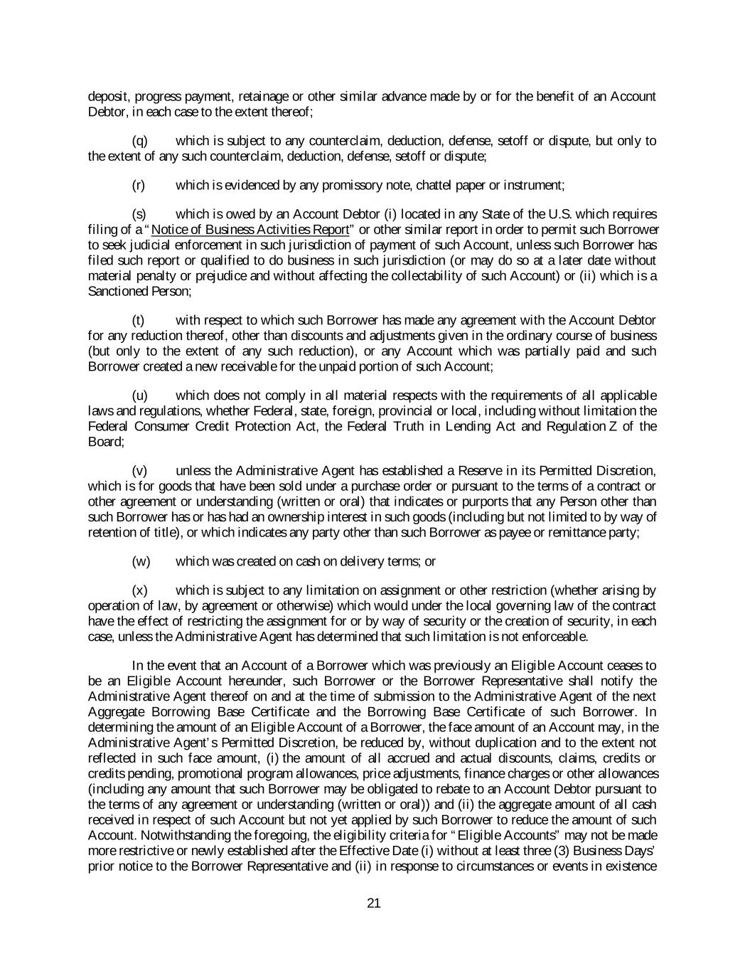 deposit, progress payment, retainage or other similar advance made by or for the benefit of an Account Debtor, in each case to the extent thereof; (q) which is subject to any counterclaim, deduction, defense, setoff or dispute, but only to the extent of any such counterclaim, deduction, defense, setoff or dispute; (r) which is evidenced by any promissory note, chattel paper or instrument; (s) which is owed by an Account Debtor (i) located in any State of the U.S. which requires filing of a “Notice of Business Activities Report” or other similar report in order to permit such Borrower to seek judicial enforcement in such jurisdiction of payment of such Account, unless such Borrower has filed such report or qualified to do business in such jurisdiction (or may do so at a later date without material penalty or prejudice and without affecting the collectability of such Account) or (ii) which is a Sanctioned Person; (t) with respect to which such Borrower has made any agreement with the Account Debtor for any reduction thereof, other than discounts and adjustments given in the ordinary course of business (but only to the extent of any such reduction), or any Account which was partially paid and such Borrower created a new receivable for the unpaid portion of such Account; (u) which does not comply in all material respects with the requirements of all applicable laws and regulations, whether Federal, state, foreign, provincial or local, including without limitation the Federal Consumer Credit Protection Act, the Federal Truth in Lending Act and Regulation Z of the Board; (v) unless the Administrative Agent has established a Reserve in its Permitted Discretion, which is for goods that have been sold under a purchase order or pursuant to the terms of a contract or other agreement or understanding (written or oral) that indicates or purports that any Person other than such Borrower has or has had an ownership interest in such goods (including but not limited to by way of retention of title), or which indicates any party other than such Borrower as payee or remittance party; (w) which was created on cash on delivery terms; or (x) which is subject to any limitation on assignment or other restriction (whether arising by operation of law, by agreement or otherwise) which would under the local governing law of the contract have the effect of restricting the assignment for or by way of security or the creation of security, in each case, unless the Administrative Agent has determined that such limitation is not enforceable. In the event that an Account of a Borrower which was previously an Eligible Account ceases to be an Eligible Account hereunder, such Borrower or the Borrower Representative shall notify the Administrative Agent thereof on and at the time of submission to the Administrative Agent of the next Aggregate Borrowing Base Certificate and the Borrowing Base Certificate of such Borrower. In determining the amount of an Eligible Account of a Borrower, the face amount of an Account may, in the Administrative Agent’s Permitted Discretion, be reduced by, without duplication and to the extent not reflected in such face amount, (i) the amount of all accrued and actual discounts, claims, credits or credits pending, promotional program allowances, price adjustments, finance charges or other allowances (including any amount that such Borrower may be obligated to rebate to an Account Debtor pursuant to the terms of any agreement or understanding (written or oral)) and (ii) the aggregate amount of all cash received in respect of such Account but not yet applied by such Borrower to reduce the amount of such Account. Notwithstanding the foregoing, the eligibility criteria for “Eligible Accounts” may not be made more restrictive or newly established after the Effective Date (i) without at least three (3) Business Days’ prior notice to the Borrower Representative and (ii) in response to circumstances or events in existence 21