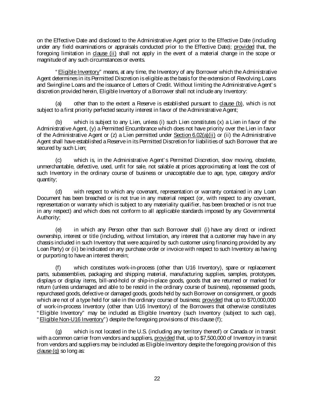 on the Effective Date and disclosed to the Administrative Agent prior to the Effective Date (including under any field examinations or appraisals conducted prior to the Effective Date); provided that, the foregoing limitation in clause (ii) shall not apply in the event of a material change in the scope or magnitude of any such circumstances or events. “Eligible Inventory” means, at any time, the Inventory of any Borrower which the Administrative Agent determines in its Permitted Discretion is eligible as the basis for the extension of Revolving Loans and Swingline Loans and the issuance of Letters of Credit. Without limiting the Administrative Agent’s discretion provided herein, Eligible Inventory of a Borrower shall not include any Inventory: (a) other than to the extent a Reserve is established pursuant to clause (b), which is not subject to a first priority perfected security interest in favor of the Administrative Agent; (b) which is subject to any Lien, unless (i) such Lien constitutes (x) a Lien in favor of the Administrative Agent, (y) a Permitted Encumbrance which does not have priority over the Lien in favor of the Administrative Agent or (z) a Lien permitted under Section 6.02(a)(ii) or (ii) the Administrative Agent shall have established a Reserve in its Permitted Discretion for liabilities of such Borrower that are secured by such Lien; (c) which is, in the Administrative Agent’s Permitted Discretion, slow moving, obsolete, unmerchantable, defective, used, unfit for sale, not salable at prices approximating at least the cost of such Inventory in the ordinary course of business or unacceptable due to age, type, category and/or quantity; (d) with respect to which any covenant, representation or warranty contained in any Loan Document has been breached or is not true in any material respect (or, with respect to any covenant, representation or warranty which is subject to any materiality qualifier, has been breached or is not true in any respect) and which does not conform to all applicable standards imposed by any Governmental Authority; (e) in which any Person other than such Borrower shall (i) have any direct or indirect ownership, interest or title (including, without limitation, any interest that a customer may have in any chassis included in such Inventory that were acquired by such customer using financing provided by any Loan Party) or (ii) be indicated on any purchase order or invoice with respect to such Inventory as having or purporting to have an interest therein; (f) which constitutes work-in-process (other than U16 Inventory), spare or replacement parts, subassemblies, packaging and shipping material, manufacturing supplies, samples, prototypes, displays or display items, bill-and-hold or ship-in-place goods, goods that are returned or marked for return (unless undamaged and able to be resold in the ordinary course of business), repossessed goods, repurchased goods, defective or damaged goods, goods held by such Borrower on consignment, or goods which are not of a type held for sale in the ordinary course of business; provided that up to $70,000,000 of work-in-process Inventory (other than U16 Inventory) of the Borrowers that otherwise constitutes “Eligible Inventory” may be included as Eligible Inventory (such Inventory (subject to such cap), “Eligible Non-U16 Inventory”) despite the foregoing provisions of this clause (f); (g) which is not located in the U.S. (including any territory thereof) or Canada or in transit with a common carrier from vendors and suppliers, provided that, up to $7,500,000 of Inventory in transit from vendors and suppliers may be included as Eligible Inventory despite the foregoing provision of this clause (g) so long as: 22