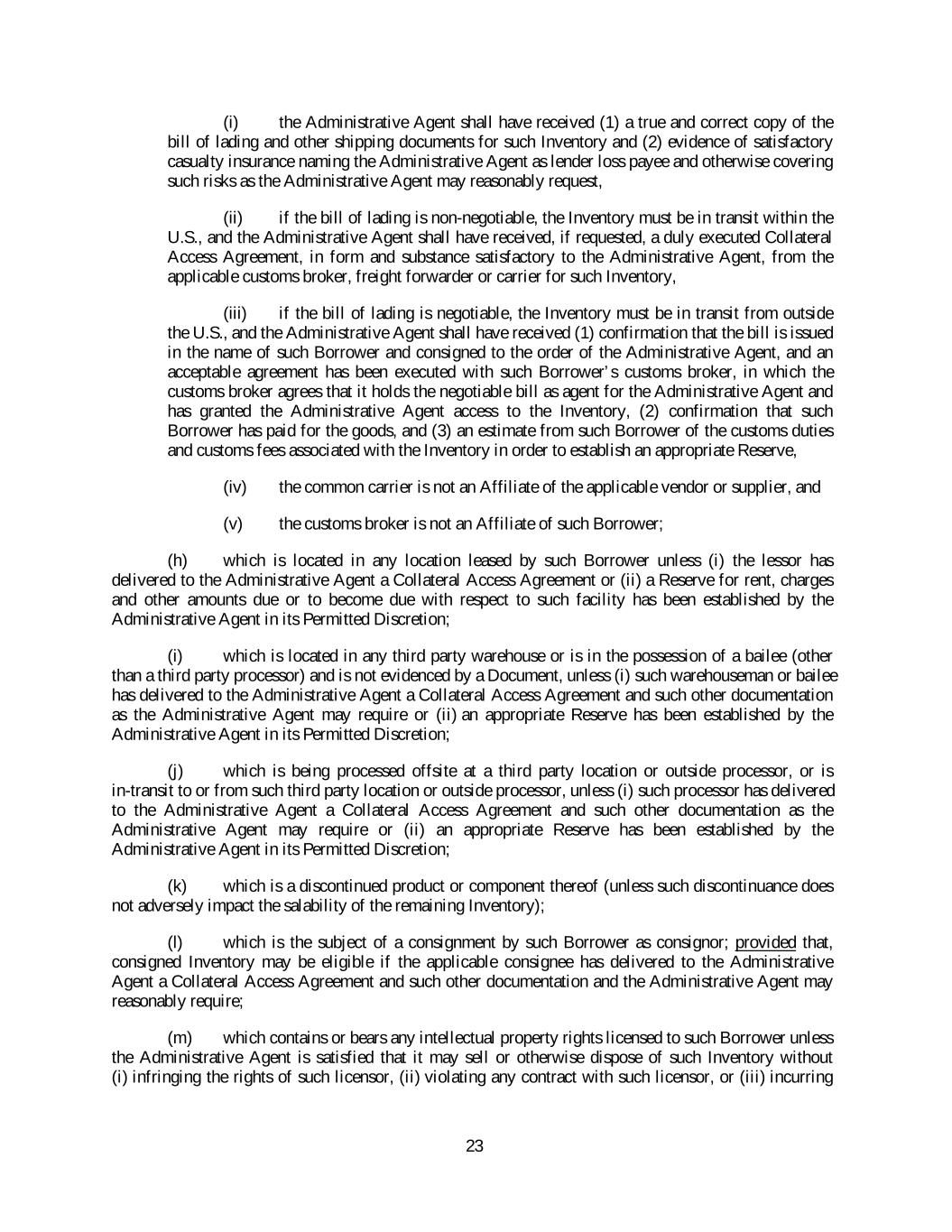 (i) the Administrative Agent shall have received (1) a true and correct copy of the bill of lading and other shipping documents for such Inventory and (2) evidence of satisfactory casualty insurance naming the Administrative Agent as lender loss payee and otherwise covering such risks as the Administrative Agent may reasonably request, (ii) if the bill of lading is non-negotiable, the Inventory must be in transit within the U.S., and the Administrative Agent shall have received, if requested, a duly executed Collateral Access Agreement, in form and substance satisfactory to the Administrative Agent, from the applicable customs broker, freight forwarder or carrier for such Inventory, (iii) if the bill of lading is negotiable, the Inventory must be in transit from outside the U.S., and the Administrative Agent shall have received (1) confirmation that the bill is issued in the name of such Borrower and consigned to the order of the Administrative Agent, and an acceptable agreement has been executed with such Borrower’s customs broker, in which the customs broker agrees that it holds the negotiable bill as agent for the Administrative Agent and has granted the Administrative Agent access to the Inventory, (2) confirmation that such Borrower has paid for the goods, and (3) an estimate from such Borrower of the customs duties and customs fees associated with the Inventory in order to establish an appropriate Reserve, (iv) the common carrier is not an Affiliate of the applicable vendor or supplier, and (v) the customs broker is not an Affiliate of such Borrower; (h) which is located in any location leased by such Borrower unless (i) the lessor has delivered to the Administrative Agent a Collateral Access Agreement or (ii) a Reserve for rent, charges and other amounts due or to become due with respect to such facility has been established by the Administrative Agent in its Permitted Discretion; (i) which is located in any third party warehouse or is in the possession of a bailee (other than a third party processor) and is not evidenced by a Document, unless (i) such warehouseman or bailee has delivered to the Administrative Agent a Collateral Access Agreement and such other documentation as the Administrative Agent may require or (ii) an appropriate Reserve has been established by the Administrative Agent in its Permitted Discretion; (j) which is being processed offsite at a third party location or outside processor, or is in-transit to or from such third party location or outside processor, unless (i) such processor has delivered to the Administrative Agent a Collateral Access Agreement and such other documentation as the Administrative Agent may require or (ii) an appropriate Reserve has been established by the Administrative Agent in its Permitted Discretion; (k) which is a discontinued product or component thereof (unless such discontinuance does not adversely impact the salability of the remaining Inventory); (l) which is the subject of a consignment by such Borrower as consignor; provided that, consigned Inventory may be eligible if the applicable consignee has delivered to the Administrative Agent a Collateral Access Agreement and such other documentation and the Administrative Agent may reasonably require; (m) which contains or bears any intellectual property rights licensed to such Borrower unless the Administrative Agent is satisfied that it may sell or otherwise dispose of such Inventory without (i) infringing the rights of such licensor, (ii) violating any contract with such licensor, or (iii) incurring 23