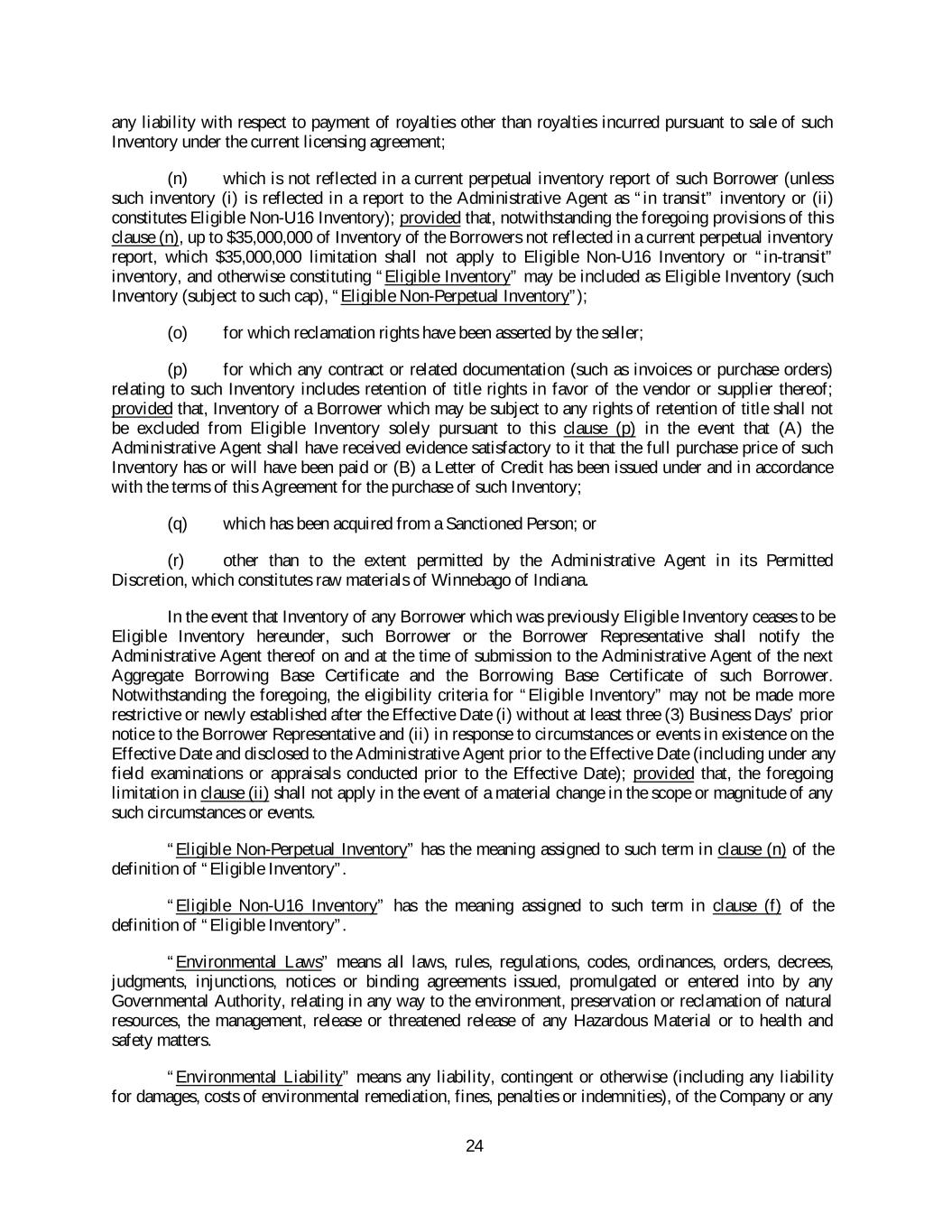 any liability with respect to payment of royalties other than royalties incurred pursuant to sale of such Inventory under the current licensing agreement; (n) which is not reflected in a current perpetual inventory report of such Borrower (unless such inventory (i) is reflected in a report to the Administrative Agent as “in transit” inventory or (ii) constitutes Eligible Non-U16 Inventory); provided that, notwithstanding the foregoing provisions of this clause (n), up to $35,000,000 of Inventory of the Borrowers not reflected in a current perpetual inventory report, which $35,000,000 limitation shall not apply to Eligible Non-U16 Inventory or “in-transit” inventory, and otherwise constituting “Eligible Inventory” may be included as Eligible Inventory (such Inventory (subject to such cap), “Eligible Non-Perpetual Inventory”); (o) for which reclamation rights have been asserted by the seller; (p) for which any contract or related documentation (such as invoices or purchase orders) relating to such Inventory includes retention of title rights in favor of the vendor or supplier thereof; provided that, Inventory of a Borrower which may be subject to any rights of retention of title shall not be excluded from Eligible Inventory solely pursuant to this clause (p) in the event that (A) the Administrative Agent shall have received evidence satisfactory to it that the full purchase price of such Inventory has or will have been paid or (B) a Letter of Credit has been issued under and in accordance with the terms of this Agreement for the purchase of such Inventory; (q) which has been acquired from a Sanctioned Person; or (r) other than to the extent permitted by the Administrative Agent in its Permitted Discretion, which constitutes raw materials of Winnebago of Indiana. In the event that Inventory of any Borrower which was previously Eligible Inventory ceases to be Eligible Inventory hereunder, such Borrower or the Borrower Representative shall notify the Administrative Agent thereof on and at the time of submission to the Administrative Agent of the next Aggregate Borrowing Base Certificate and the Borrowing Base Certificate of such Borrower. Notwithstanding the foregoing, the eligibility criteria for “Eligible Inventory” may not be made more restrictive or newly established after the Effective Date (i) without at least three (3) Business Days’ prior notice to the Borrower Representative and (ii) in response to circumstances or events in existence on the Effective Date and disclosed to the Administrative Agent prior to the Effective Date (including under any field examinations or appraisals conducted prior to the Effective Date); provided that, the foregoing limitation in clause (ii) shall not apply in the event of a material change in the scope or magnitude of any such circumstances or events. “Eligible Non-Perpetual Inventory” has the meaning assigned to such term in clause (n) of the definition of “Eligible Inventory”. “Eligible Non-U16 Inventory” has the meaning assigned to such term in clause (f) of the definition of “Eligible Inventory”. “Environmental Laws” means all laws, rules, regulations, codes, ordinances, orders, decrees, judgments, injunctions, notices or binding agreements issued, promulgated or entered into by any Governmental Authority, relating in any way to the environment, preservation or reclamation of natural resources, the management, release or threatened release of any Hazardous Material or to health and safety matters. “Environmental Liability” means any liability, contingent or otherwise (including any liability for damages, costs of environmental remediation, fines, penalties or indemnities), of the Company or any 24