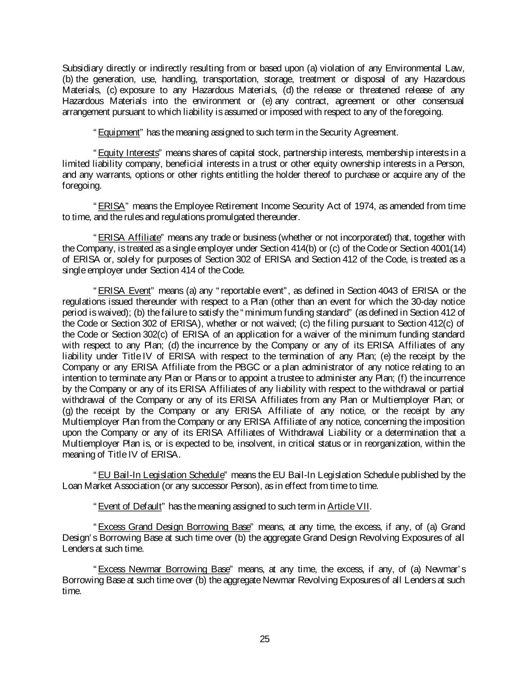 Subsidiary directly or indirectly resulting from or based upon (a) violation of any Environmental Law, (b) the generation, use, handling, transportation, storage, treatment or disposal of any Hazardous Materials, (c) exposure to any Hazardous Materials, (d) the release or threatened release of any Hazardous Materials into the environment or (e) any contract, agreement or other consensual arrangement pursuant to which liability is assumed or imposed with respect to any of the foregoing. “Equipment” has the meaning assigned to such term in the Security Agreement. “Equity Interests” means shares of capital stock, partnership interests, membership interests in a limited liability company, beneficial interests in a trust or other equity ownership interests in a Person, and any warrants, options or other rights entitling the holder thereof to purchase or acquire any of the foregoing. “ERISA” means the Employee Retirement Income Security Act of 1974, as amended from time to time, and the rules and regulations promulgated thereunder. “ERISA Affiliate” means any trade or business (whether or not incorporated) that, together with the Company, is treated as a single employer under Section 414(b) or (c) of the Code or Section 4001(14) of ERISA or, solely for purposes of Section 302 of ERISA and Section 412 of the Code, is treated as a single employer under Section 414 of the Code. “ERISA Event” means (a) any “reportable event”, as defined in Section 4043 of ERISA or the regulations issued thereunder with respect to a Plan (other than an event for which the 30-day notice period is waived); (b) the failure to satisfy the “minimum funding standard” (as defined in Section 412 of the Code or Section 302 of ERISA), whether or not waived; (c) the filing pursuant to Section 412(c) of the Code or Section 302(c) of ERISA of an application for a waiver of the minimum funding standard with respect to any Plan; (d) the incurrence by the Company or any of its ERISA Affiliates of any liability under Title IV of ERISA with respect to the termination of any Plan; (e) the receipt by the Company or any ERISA Affiliate from the PBGC or a plan administrator of any notice relating to an intention to terminate any Plan or Plans or to appoint a trustee to administer any Plan; (f) the incurrence by the Company or any of its ERISA Affiliates of any liability with respect to the withdrawal or partial withdrawal of the Company or any of its ERISA Affiliates from any Plan or Multiemployer Plan; or (g) the receipt by the Company or any ERISA Affiliate of any notice, or the receipt by any Multiemployer Plan from the Company or any ERISA Affiliate of any notice, concerning the imposition upon the Company or any of its ERISA Affiliates of Withdrawal Liability or a determination that a Multiemployer Plan is, or is expected to be, insolvent, in critical status or in reorganization, within the meaning of Title IV of ERISA. “EU Bail-In Legislation Schedule” means the EU Bail-In Legislation Schedule published by the Loan Market Association (or any successor Person), as in effect from time to time. “Event of Default” has the meaning assigned to such term in Article VII. “Excess Grand Design Borrowing Base” means, at any time, the excess, if any, of (a) Grand Design’s Borrowing Base at such time over (b) the aggregate Grand Design Revolving Exposures of all Lenders at such time. “Excess Newmar Borrowing Base” means, at any time, the excess, if any, of (a) Newmar’s Borrowing Base at such time over (b) the aggregate Newmar Revolving Exposures of all Lenders at such time. 25