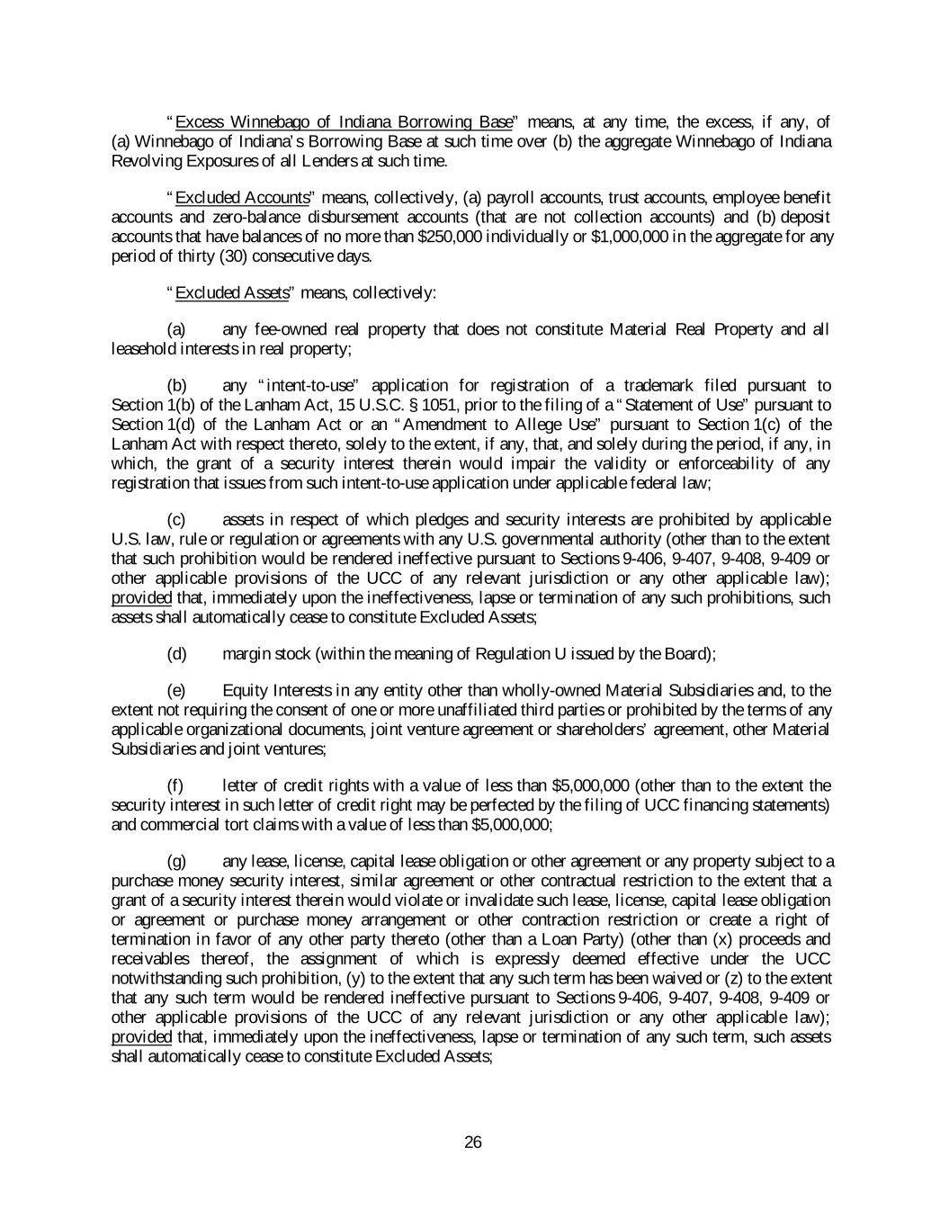 “Excess Winnebago of Indiana Borrowing Base” means, at any time, the excess, if any, of (a) Winnebago of Indiana’s Borrowing Base at such time over (b) the aggregate Winnebago of Indiana Revolving Exposures of all Lenders at such time. “Excluded Accounts” means, collectively, (a) payroll accounts, trust accounts, employee benefit accounts and zero-balance disbursement accounts (that are not collection accounts) and (b) deposit accounts that have balances of no more than $250,000 individually or $1,000,000 in the aggregate for any period of thirty (30) consecutive days. “Excluded Assets” means, collectively: (a) any fee-owned real property that does not constitute Material Real Property and all leasehold interests in real property; (b) any “intent-to-use” application for registration of a trademark filed pursuant to Section 1(b) of the Lanham Act, 15 U.S.C. § 1051, prior to the filing of a “Statement of Use” pursuant to Section 1(d) of the Lanham Act or an “Amendment to Allege Use” pursuant to Section 1(c) of the Lanham Act with respect thereto, solely to the extent, if any, that, and solely during the period, if any, in which, the grant of a security interest therein would impair the validity or enforceability of any registration that issues from such intent-to-use application under applicable federal law; (c) assets in respect of which pledges and security interests are prohibited by applicable U.S. law, rule or regulation or agreements with any U.S. governmental authority (other than to the extent that such prohibition would be rendered ineffective pursuant to Sections 9-406, 9-407, 9-408, 9-409 or other applicable provisions of the UCC of any relevant jurisdiction or any other applicable law); provided that, immediately upon the ineffectiveness, lapse or termination of any such prohibitions, such assets shall automatically cease to constitute Excluded Assets; (d) margin stock (within the meaning of Regulation U issued by the Board); (e) Equity Interests in any entity other than wholly-owned Material Subsidiaries and, to the extent not requiring the consent of one or more unaffiliated third parties or prohibited by the terms of any applicable organizational documents, joint venture agreement or shareholders’ agreement, other Material Subsidiaries and joint ventures; (f) letter of credit rights with a value of less than $5,000,000 (other than to the extent the security interest in such letter of credit right may be perfected by the filing of UCC financing statements) and commercial tort claims with a value of less than $5,000,000; (g) any lease, license, capital lease obligation or other agreement or any property subject to a purchase money security interest, similar agreement or other contractual restriction to the extent that a grant of a security interest therein would violate or invalidate such lease, license, capital lease obligation or agreement or purchase money arrangement or other contraction restriction or create a right of termination in favor of any other party thereto (other than a Loan Party) (other than (x) proceeds and receivables thereof, the assignment of which is expressly deemed effective under the UCC notwithstanding such prohibition, (y) to the extent that any such term has been waived or (z) to the extent that any such term would be rendered ineffective pursuant to Sections 9-406, 9-407, 9-408, 9-409 or other applicable provisions of the UCC of any relevant jurisdiction or any other applicable law); provided that, immediately upon the ineffectiveness, lapse or termination of any such term, such assets shall automatically cease to constitute Excluded Assets; 26