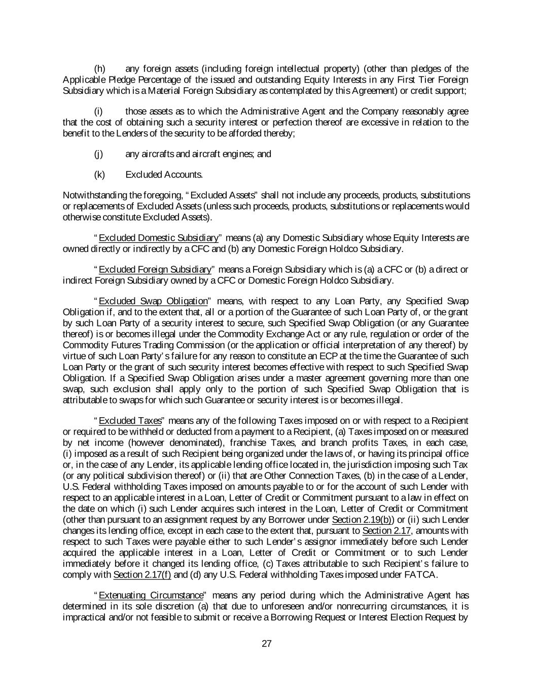 (h) any foreign assets (including foreign intellectual property) (other than pledges of the Applicable Pledge Percentage of the issued and outstanding Equity Interests in any First Tier Foreign Subsidiary which is a Material Foreign Subsidiary as contemplated by this Agreement) or credit support; (i) those assets as to which the Administrative Agent and the Company reasonably agree that the cost of obtaining such a security interest or perfection thereof are excessive in relation to the benefit to the Lenders of the security to be afforded thereby; (j) any aircrafts and aircraft engines; and (k) Excluded Accounts. Notwithstanding the foregoing, “Excluded Assets” shall not include any proceeds, products, substitutions or replacements of Excluded Assets (unless such proceeds, products, substitutions or replacements would otherwise constitute Excluded Assets). “Excluded Domestic Subsidiary” means (a) any Domestic Subsidiary whose Equity Interests are owned directly or indirectly by a CFC and (b) any Domestic Foreign Holdco Subsidiary. “Excluded Foreign Subsidiary” means a Foreign Subsidiary which is (a) a CFC or (b) a direct or indirect Foreign Subsidiary owned by a CFC or Domestic Foreign Holdco Subsidiary. “Excluded Swap Obligation” means, with respect to any Loan Party, any Specified Swap Obligation if, and to the extent that, all or a portion of the Guarantee of such Loan Party of, or the grant by such Loan Party of a security interest to secure, such Specified Swap Obligation (or any Guarantee thereof) is or becomes illegal under the Commodity Exchange Act or any rule, regulation or order of the Commodity Futures Trading Commission (or the application or official interpretation of any thereof) by virtue of such Loan Party’s failure for any reason to constitute an ECP at the time the Guarantee of such Loan Party or the grant of such security interest becomes effective with respect to such Specified Swap Obligation. If a Specified Swap Obligation arises under a master agreement governing more than one swap, such exclusion shall apply only to the portion of such Specified Swap Obligation that is attributable to swaps for which such Guarantee or security interest is or becomes illegal. “Excluded Taxes” means any of the following Taxes imposed on or with respect to a Recipient or required to be withheld or deducted from a payment to a Recipient, (a) Taxes imposed on or measured by net income (however denominated), franchise Taxes, and branch profits Taxes, in each case, (i) imposed as a result of such Recipient being organized under the laws of, or having its principal office or, in the case of any Lender, its applicable lending office located in, the jurisdiction imposing such Tax (or any political subdivision thereof) or (ii) that are Other Connection Taxes, (b) in the case of a Lender, U.S. Federal withholding Taxes imposed on amounts payable to or for the account of such Lender with respect to an applicable interest in a Loan, Letter of Credit or Commitment pursuant to a law in effect on the date on which (i) such Lender acquires such interest in the Loan, Letter of Credit or Commitment (other than pursuant to an assignment request by any Borrower under Section 2.19(b)) or (ii) such Lender changes its lending office, except in each case to the extent that, pursuant to Section 2.17, amounts with respect to such Taxes were payable either to such Lender’s assignor immediately before such Lender acquired the applicable interest in a Loan, Letter of Credit or Commitment or to such Lender immediately before it changed its lending office, (c) Taxes attributable to such Recipient’s failure to comply with Section 2.17(f) and (d) any U.S. Federal withholding Taxes imposed under FATCA. “Extenuating Circumstance” means any period during which the Administrative Agent has determined in its sole discretion (a) that due to unforeseen and/or nonrecurring circumstances, it is impractical and/or not feasible to submit or receive a Borrowing Request or Interest Election Request by 27