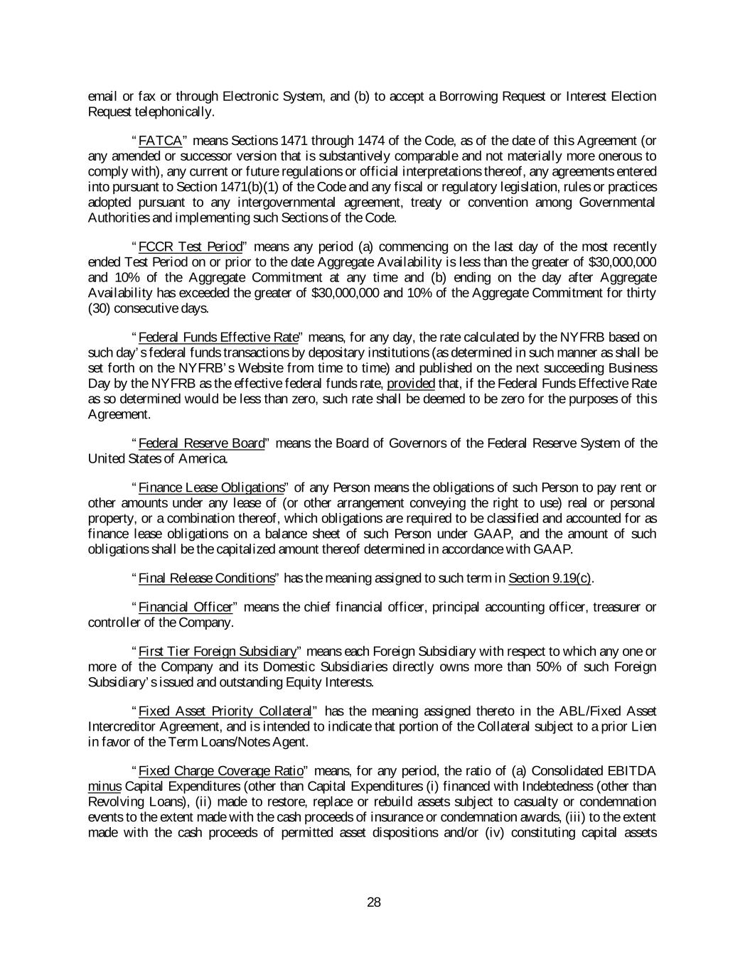 email or fax or through Electronic System, and (b) to accept a Borrowing Request or Interest Election Request telephonically. “FATCA” means Sections 1471 through 1474 of the Code, as of the date of this Agreement (or any amended or successor version that is substantively comparable and not materially more onerous to comply with), any current or future regulations or official interpretations thereof, any agreements entered into pursuant to Section 1471(b)(1) of the Code and any fiscal or regulatory legislation, rules or practices adopted pursuant to any intergovernmental agreement, treaty or convention among Governmental Authorities and implementing such Sections of the Code. “FCCR Test Period” means any period (a) commencing on the last day of the most recently ended Test Period on or prior to the date Aggregate Availability is less than the greater of $30,000,000 and 10% of the Aggregate Commitment at any time and (b) ending on the day after Aggregate Availability has exceeded the greater of $30,000,000 and 10% of the Aggregate Commitment for thirty (30) consecutive days. “Federal Funds Effective Rate” means, for any day, the rate calculated by the NYFRB based on such day’s federal funds transactions by depositary institutions (as determined in such manner as shall be set forth on the NYFRB’s Website from time to time) and published on the next succeeding Business Day by the NYFRB as the effective federal funds rate, provided that, if the Federal Funds Effective Rate as so determined would be less than zero, such rate shall be deemed to be zero for the purposes of this Agreement. “Federal Reserve Board” means the Board of Governors of the Federal Reserve System of the United States of America. “Finance Lease Obligations” of any Person means the obligations of such Person to pay rent or other amounts under any lease of (or other arrangement conveying the right to use) real or personal property, or a combination thereof, which obligations are required to be classified and accounted for as finance lease obligations on a balance sheet of such Person under GAAP, and the amount of such obligations shall be the capitalized amount thereof determined in accordance with GAAP. “Final Release Conditions” has the meaning assigned to such term in Section 9.19(c). “Financial Officer” means the chief financial officer, principal accounting officer, treasurer or controller of the Company. “First Tier Foreign Subsidiary” means each Foreign Subsidiary with respect to which any one or more of the Company and its Domestic Subsidiaries directly owns more than 50% of such Foreign Subsidiary’s issued and outstanding Equity Interests. “Fixed Asset Priority Collateral” has the meaning assigned thereto in the ABL/Fixed Asset Intercreditor Agreement, and is intended to indicate that portion of the Collateral subject to a prior Lien in favor of the Term Loans/Notes Agent. “Fixed Charge Coverage Ratio” means, for any period, the ratio of (a) Consolidated EBITDA minus Capital Expenditures (other than Capital Expenditures (i) financed with Indebtedness (other than Revolving Loans), (ii) made to restore, replace or rebuild assets subject to casualty or condemnation events to the extent made with the cash proceeds of insurance or condemnation awards, (iii) to the extent made with the cash proceeds of permitted asset dispositions and/or (iv) constituting capital assets 28