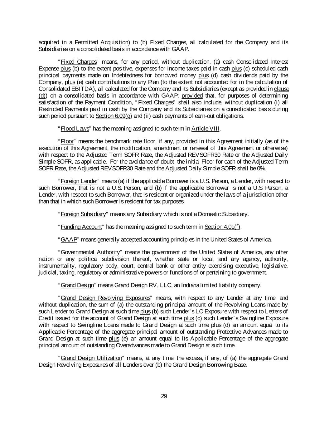 acquired in a Permitted Acquisition) to (b) Fixed Charges, all calculated for the Company and its Subsidiaries on a consolidated basis in accordance with GAAP. “Fixed Charges” means, for any period, without duplication, (a) cash Consolidated Interest Expense plus (b) to the extent positive, expenses for income taxes paid in cash plus (c) scheduled cash principal payments made on Indebtedness for borrowed money plus (d) cash dividends paid by the Company, plus (e) cash contributions to any Plan (to the extent not accounted for in the calculation of Consolidated EBITDA), all calculated for the Company and its Subsidiaries (except as provided in clause (d)) on a consolidated basis in accordance with GAAP; provided that, for purposes of determining satisfaction of the Payment Condition, “Fixed Charges” shall also include, without duplication (i) all Restricted Payments paid in cash by the Company and its Subsidiaries on a consolidated basis during such period pursuant to Section 6.09(g) and (ii) cash payments of earn-out obligations. “Flood Laws” has the meaning assigned to such term in Article VIII. “Floor” means the benchmark rate floor, if any, provided in this Agreement initially (as of the execution of this Agreement, the modification, amendment or renewal of this Agreement or otherwise) with respect to the Adjusted Term SOFR Rate, the Adjusted REVSOFR30 Rate or the Adjusted Daily Simple SOFR, as applicable. For the avoidance of doubt, the initial Floor for each of the Adjusted Term SOFR Rate, the Adjusted REVSOFR30 Rate and the Adjusted Daily Simple SOFR shall be 0%. “Foreign Lender” means (a) if the applicable Borrower is a U.S. Person, a Lender, with respect to such Borrower, that is not a U.S. Person, and (b) if the applicable Borrower is not a U.S. Person, a Lender, with respect to such Borrower, that is resident or organized under the laws of a jurisdiction other than that in which such Borrower is resident for tax purposes. “Foreign Subsidiary” means any Subsidiary which is not a Domestic Subsidiary. “Funding Account” has the meaning assigned to such term in Section 4.01(f). “GAAP” means generally accepted accounting principles in the United States of America. “Governmental Authority” means the government of the United States of America, any other nation or any political subdivision thereof, whether state or local, and any agency, authority, instrumentality, regulatory body, court, central bank or other entity exercising executive, legislative, judicial, taxing, regulatory or administrative powers or functions of or pertaining to government. “Grand Design” means Grand Design RV, LLC, an Indiana limited liability company. “Grand Design Revolving Exposures” means, with respect to any Lender at any time, and without duplication, the sum of (a) the outstanding principal amount of the Revolving Loans made by such Lender to Grand Design at such time plus (b) such Lender’s LC Exposure with respect to Letters of Credit issued for the account of Grand Design at such time plus (c) such Lender’s Swingline Exposure with respect to Swingline Loans made to Grand Design at such time plus (d) an amount equal to its Applicable Percentage of the aggregate principal amount of outstanding Protective Advances made to Grand Design at such time plus (e) an amount equal to its Applicable Percentage of the aggregate principal amount of outstanding Overadvances made to Grand Design at such time. “Grand Design Utilization” means, at any time, the excess, if any, of (a) the aggregate Grand Design Revolving Exposures of all Lenders over (b) the Grand Design Borrowing Base. 29