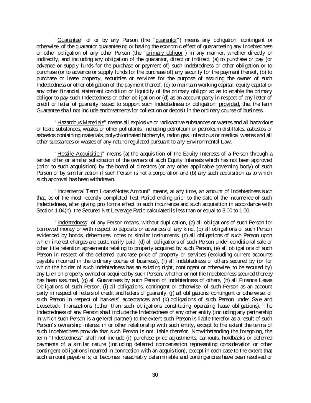 “Guarantee” of or by any Person (the “guarantor”) means any obligation, contingent or otherwise, of the guarantor guaranteeing or having the economic effect of guaranteeing any Indebtedness or other obligation of any other Person (the “primary obligor”) in any manner, whether directly or indirectly, and including any obligation of the guarantor, direct or indirect, (a) to purchase or pay (or advance or supply funds for the purchase or payment of) such Indebtedness or other obligation or to purchase (or to advance or supply funds for the purchase of) any security for the payment thereof, (b) to purchase or lease property, securities or services for the purpose of assuring the owner of such Indebtedness or other obligation of the payment thereof, (c) to maintain working capital, equity capital or any other financial statement condition or liquidity of the primary obligor so as to enable the primary obligor to pay such Indebtedness or other obligation or (d) as an account party in respect of any letter of credit or letter of guaranty issued to support such Indebtedness or obligation; provided, that the term Guarantee shall not include endorsements for collection or deposit in the ordinary course of business. “Hazardous Materials” means all explosive or radioactive substances or wastes and all hazardous or toxic substances, wastes or other pollutants, including petroleum or petroleum distillates, asbestos or asbestos containing materials, polychlorinated biphenyls, radon gas, infectious or medical wastes and all other substances or wastes of any nature regulated pursuant to any Environmental Law. “Hostile Acquisition” means (a) the acquisition of the Equity Interests of a Person through a tender offer or similar solicitation of the owners of such Equity Interests which has not been approved (prior to such acquisition) by the board of directors (or any other applicable governing body) of such Person or by similar action if such Person is not a corporation and (b) any such acquisition as to which such approval has been withdrawn. “Incremental Term Loans/Notes Amount” means, at any time, an amount of Indebtedness such that, as of the most recently completed Test Period ending prior to the date of the incurrence of such Indebtedness, after giving pro forma effect to such incurrence and such acquisition in accordance with Section 1.04(b), the Secured Net Leverage Ratio calculated is less than or equal to 3.00 to 1.00. “Indebtedness” of any Person means, without duplication, (a) all obligations of such Person for borrowed money or with respect to deposits or advances of any kind, (b) all obligations of such Person evidenced by bonds, debentures, notes or similar instruments, (c) all obligations of such Person upon which interest charges are customarily paid, (d) all obligations of such Person under conditional sale or other title retention agreements relating to property acquired by such Person, (e) all obligations of such Person in respect of the deferred purchase price of property or services (excluding current accounts payable incurred in the ordinary course of business), (f) all Indebtedness of others secured by (or for which the holder of such Indebtedness has an existing right, contingent or otherwise, to be secured by) any Lien on property owned or acquired by such Person, whether or not the Indebtedness secured thereby has been assumed, (g) all Guarantees by such Person of Indebtedness of others, (h) all Finance Lease Obligations of such Person, (i) all obligations, contingent or otherwise, of such Person as an account party in respect of letters of credit and letters of guaranty, (j) all obligations, contingent or otherwise, of such Person in respect of bankers’ acceptances and (k) obligations of such Person under Sale and Leaseback Transactions (other than such obligations constituting operating lease obligations). The Indebtedness of any Person shall include the Indebtedness of any other entity (including any partnership in which such Person is a general partner) to the extent such Person is liable therefor as a result of such Person’s ownership interest in or other relationship with such entity, except to the extent the terms of such Indebtedness provide that such Person is not liable therefor. Notwithstanding the foregoing, the term “Indebtedness” shall not include (i) purchase price adjustments, earnouts, holdbacks or deferred payments of a similar nature (including deferred compensation representing consideration or other contingent obligations incurred in connection with an acquisition), except in each case to the extent that such amount payable is, or becomes, reasonably determinable and contingencies have been resolved or 30