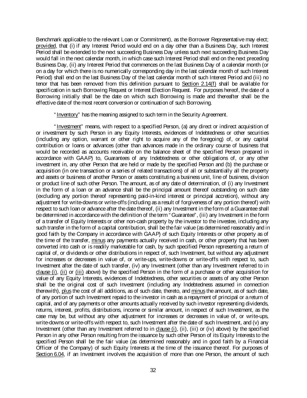 Benchmark applicable to the relevant Loan or Commitment), as the Borrower Representative may elect; provided, that (i) if any Interest Period would end on a day other than a Business Day, such Interest Period shall be extended to the next succeeding Business Day unless such next succeeding Business Day would fall in the next calendar month, in which case such Interest Period shall end on the next preceding Business Day, (ii) any Interest Period that commences on the last Business Day of a calendar month (or on a day for which there is no numerically corresponding day in the last calendar month of such Interest Period) shall end on the last Business Day of the last calendar month of such Interest Period and (iii) no tenor that has been removed from this definition pursuant to Section 2.14(f) shall be available for specification in such Borrowing Request or Interest Election Request. For purposes hereof, the date of a Borrowing initially shall be the date on which such Borrowing is made and thereafter shall be the effective date of the most recent conversion or continuation of such Borrowing. “Inventory” has the meaning assigned to such term in the Security Agreement. “Investment” means, with respect to a specified Person, (a) any direct or indirect acquisition of or investment by such Person in any Equity Interests, evidences of Indebtedness or other securities (including any option, warrant or other right to acquire any of the foregoing) of, or any capital contribution or loans or advances (other than advances made in the ordinary course of business that would be recorded as accounts receivable on the balance sheet of the specified Person prepared in accordance with GAAP) to, Guarantees of any Indebtedness or other obligations of, or any other investment in, any other Person that are held or made by the specified Person and (b) the purchase or acquisition (in one transaction or a series of related transactions) of all or substantially all the property and assets or business of another Person or assets constituting a business unit, line of business, division or product line of such other Person. The amount, as of any date of determination, of (i) any Investment in the form of a loan or an advance shall be the principal amount thereof outstanding on such date (excluding any portion thereof representing paid-in-kind interest or principal accretion), without any adjustment for write-downs or write-offs (including as a result of forgiveness of any portion thereof) with respect to such loan or advance after the date thereof, (ii) any Investment in the form of a Guarantee shall be determined in accordance with the definition of the term “Guarantee”, (iii) any Investment in the form of a transfer of Equity Interests or other non-cash property by the investor to the investee, including any such transfer in the form of a capital contribution, shall be the fair value (as determined reasonably and in good faith by the Company in accordance with GAAP) of such Equity Interests or other property as of the time of the transfer, minus any payments actually received in cash, or other property that has been converted into cash or is readily marketable for cash, by such specified Person representing a return of capital of, or dividends or other distributions in respect of, such Investment, but without any adjustment for increases or decreases in value of, or write-ups, write-downs or write-offs with respect to, such Investment after the date of such transfer, (iv) any Investment (other than any Investment referred to in clause (i), (ii) or (iii) above) by the specified Person in the form of a purchase or other acquisition for value of any Equity Interests, evidences of Indebtedness, other securities or assets of any other Person shall be the original cost of such Investment (including any Indebtedness assumed in connection therewith), plus the cost of all additions, as of such date, thereto, and minus the amount, as of such date, of any portion of such Investment repaid to the investor in cash as a repayment of principal or a return of capital, and of any payments or other amounts actually received by such investor representing dividends, returns, interest, profits, distributions, income or similar amount, in respect of such Investment, as the case may be, but without any other adjustment for increases or decreases in value of, or write-ups, write-downs or write-offs with respect to, such Investment after the date of such Investment, and (v) any Investment (other than any Investment referred to in clause (i), (ii), (iii) or (iv) above) by the specified Person in any other Person resulting from the issuance by such other Person of its Equity Interests to the specified Person shall be the fair value (as determined reasonably and in good faith by a Financial Officer of the Company) of such Equity Interests at the time of the issuance thereof. For purposes of Section 6.04, if an Investment involves the acquisition of more than one Person, the amount of such 32