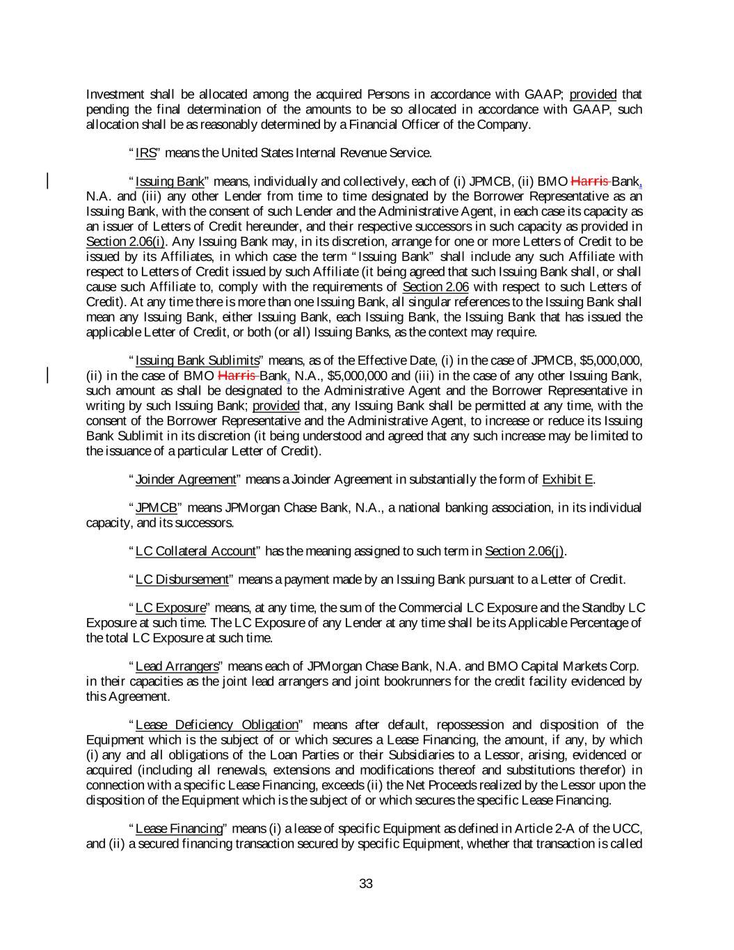 Investment shall be allocated among the acquired Persons in accordance with GAAP; provided that pending the final determination of the amounts to be so allocated in accordance with GAAP, such allocation shall be as reasonably determined by a Financial Officer of the Company. “IRS” means the United States Internal Revenue Service. “Issuing Bank” means, individually and collectively, each of (i) JPMCB, (ii) BMO Harris Bank, N.A. and (iii) any other Lender from time to time designated by the Borrower Representative as an Issuing Bank, with the consent of such Lender and the Administrative Agent, in each case its capacity as an issuer of Letters of Credit hereunder, and their respective successors in such capacity as provided in Section 2.06(i). Any Issuing Bank may, in its discretion, arrange for one or more Letters of Credit to be issued by its Affiliates, in which case the term “Issuing Bank” shall include any such Affiliate with respect to Letters of Credit issued by such Affiliate (it being agreed that such Issuing Bank shall, or shall cause such Affiliate to, comply with the requirements of Section 2.06 with respect to such Letters of Credit). At any time there is more than one Issuing Bank, all singular references to the Issuing Bank shall mean any Issuing Bank, either Issuing Bank, each Issuing Bank, the Issuing Bank that has issued the applicable Letter of Credit, or both (or all) Issuing Banks, as the context may require. “Issuing Bank Sublimits” means, as of the Effective Date, (i) in the case of JPMCB, $5,000,000, (ii) in the case of BMO Harris Bank, N.A., $5,000,000 and (iii) in the case of any other Issuing Bank, such amount as shall be designated to the Administrative Agent and the Borrower Representative in writing by such Issuing Bank; provided that, any Issuing Bank shall be permitted at any time, with the consent of the Borrower Representative and the Administrative Agent, to increase or reduce its Issuing Bank Sublimit in its discretion (it being understood and agreed that any such increase may be limited to the issuance of a particular Letter of Credit). “Joinder Agreement” means a Joinder Agreement in substantially the form of Exhibit E. “JPMCB” means JPMorgan Chase Bank, N.A., a national banking association, in its individual capacity, and its successors. “LC Collateral Account” has the meaning assigned to such term in Section 2.06(j). “LC Disbursement” means a payment made by an Issuing Bank pursuant to a Letter of Credit. “LC Exposure” means, at any time, the sum of the Commercial LC Exposure and the Standby LC Exposure at such time. The LC Exposure of any Lender at any time shall be its Applicable Percentage of the total LC Exposure at such time. “Lead Arrangers” means each of JPMorgan Chase Bank, N.A. and BMO Capital Markets Corp. in their capacities as the joint lead arrangers and joint bookrunners for the credit facility evidenced by this Agreement. “Lease Deficiency Obligation” means after default, repossession and disposition of the Equipment which is the subject of or which secures a Lease Financing, the amount, if any, by which (i) any and all obligations of the Loan Parties or their Subsidiaries to a Lessor, arising, evidenced or acquired (including all renewals, extensions and modifications thereof and substitutions therefor) in connection with a specific Lease Financing, exceeds (ii) the Net Proceeds realized by the Lessor upon the disposition of the Equipment which is the subject of or which secures the specific Lease Financing. “Lease Financing” means (i) a lease of specific Equipment as defined in Article 2-A of the UCC, and (ii) a secured financing transaction secured by specific Equipment, whether that transaction is called 33