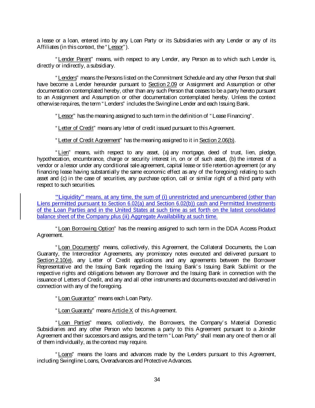 a lease or a loan, entered into by any Loan Party or its Subsidiaries with any Lender or any of its Affiliates (in this context, the “Lessor”). “Lender Parent” means, with respect to any Lender, any Person as to which such Lender is, directly or indirectly, a subsidiary. “Lenders” means the Persons listed on the Commitment Schedule and any other Person that shall have become a Lender hereunder pursuant to Section 2.09 or Assignment and Assumption or other documentation contemplated hereby, other than any such Person that ceases to be a party hereto pursuant to an Assignment and Assumption or other documentation contemplated hereby. Unless the context otherwise requires, the term “Lenders” includes the Swingline Lender and each Issuing Bank. “Lessor” has the meaning assigned to such term in the definition of “Lease Financing”. “Letter of Credit” means any letter of credit issued pursuant to this Agreement. “Letter of Credit Agreement” has the meaning assigned to it in Section 2.06(b). “Lien” means, with respect to any asset, (a) any mortgage, deed of trust, lien, pledge, hypothecation, encumbrance, charge or security interest in, on or of such asset, (b) the interest of a vendor or a lessor under any conditional sale agreement, capital lease or title retention agreement (or any financing lease having substantially the same economic effect as any of the foregoing) relating to such asset and (c) in the case of securities, any purchase option, call or similar right of a third party with respect to such securities. “Liquidity” means, at any time, the sum of (i) unrestricted and unencumbered (other than Liens permitted pursuant to Section 6.02(a) and Section 6.02(b)) cash and Permitted Investments of the Loan Parties and in the United States at such time as set forth on the latest consolidated balance sheet of the Company plus (ii) Aggregate Availability at such time. “Loan Borrowing Option” has the meaning assigned to such term in the DDA Access Product Agreement. “Loan Documents” means, collectively, this Agreement, the Collateral Documents, the Loan Guaranty, the Intercreditor Agreements, any promissory notes executed and delivered pursuant to Section 2.10(e), any Letter of Credit applications and any agreements between the Borrower Representative and the Issuing Bank regarding the Issuing Bank’s Issuing Bank Sublimit or the respective rights and obligations between any Borrower and the Issuing Bank in connection with the issuance of Letters of Credit, and any and all other instruments and documents executed and delivered in connection with any of the foregoing. “Loan Guarantor” means each Loan Party. “Loan Guaranty” means Article X of this Agreement. “Loan Parties” means, collectively, the Borrowers, the Company’s Material Domestic Subsidiaries and any other Person who becomes a party to this Agreement pursuant to a Joinder Agreement and their successors and assigns, and the term “Loan Party” shall mean any one of them or all of them individually, as the context may require. “Loans” means the loans and advances made by the Lenders pursuant to this Agreement, including Swingline Loans, Overadvances and Protective Advances. 34
