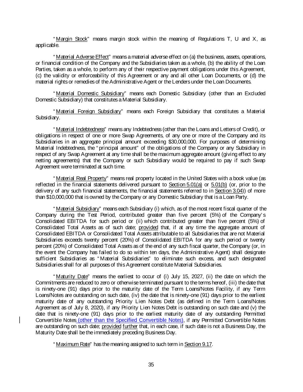 “Margin Stock” means margin stock within the meaning of Regulations T, U and X, as applicable. “Material Adverse Effect” means a material adverse effect on (a) the business, assets, operations, or financial condition of the Company and the Subsidiaries taken as a whole, (b) the ability of the Loan Parties, taken as a whole, to perform any of their respective payment obligations under this Agreement, (c) the validity or enforceability of this Agreement or any and all other Loan Documents, or (d) the material rights or remedies of the Administrative Agent or the Lenders under the Loan Documents. “Material Domestic Subsidiary” means each Domestic Subsidiary (other than an Excluded Domestic Subsidiary) that constitutes a Material Subsidiary. “Material Foreign Subsidiary” means each Foreign Subsidiary that constitutes a Material Subsidiary. “Material Indebtedness” means any Indebtedness (other than the Loans and Letters of Credit), or obligations in respect of one or more Swap Agreements, of any one or more of the Company and its Subsidiaries in an aggregate principal amount exceeding $30,000,000. For purposes of determining Material Indebtedness, the “principal amount” of the obligations of the Company or any Subsidiary in respect of any Swap Agreement at any time shall be the maximum aggregate amount (giving effect to any netting agreements) that the Company or such Subsidiary would be required to pay if such Swap Agreement were terminated at such time. “Material Real Property” means real property located in the United States with a book value (as reflected in the financial statements delivered pursuant to Section 5.01(a) or 5.01(b) (or, prior to the delivery of any such financial statements, the financial statements referred to in Section 3.04)) of more than $10,000,000 that is owned by the Company or any Domestic Subsidiary that is a Loan Party. “Material Subsidiary” means each Subsidiary (i) which, as of the most recent fiscal quarter of the Company during the Test Period, contributed greater than five percent (5%) of the Company’s Consolidated EBITDA for such period or (ii) which contributed greater than five percent (5%) of Consolidated Total Assets as of such date; provided that, if at any time the aggregate amount of Consolidated EBITDA or Consolidated Total Assets attributable to all Subsidiaries that are not Material Subsidiaries exceeds twenty percent (20%) of Consolidated EBITDA for any such period or twenty percent (20%) of Consolidated Total Assets as of the end of any such fiscal quarter, the Company (or, in the event the Company has failed to do so within ten days, the Administrative Agent) shall designate sufficient Subsidiaries as “Material Subsidiaries” to eliminate such excess, and such designated Subsidiaries shall for all purposes of this Agreement constitute Material Subsidiaries. “Maturity Date” means the earliest to occur of (i) July 15, 2027, (ii) the date on which the Commitments are reduced to zero or otherwise terminated pursuant to the terms hereof, (iii) the date that is ninety-one (91) days prior to the maturity date of the Term Loans/Notes Facility, if any Term Loans/Notes are outstanding on such date, (iv) the date that is ninety-one (91) days prior to the earliest maturity date of any outstanding Priority Lien Notes Debt (as defined in the Term Loans/Notes Agreement as of July 8, 2020), if any Priority Lien Notes Debt is outstanding on such date and (v) the date that is ninety-one (91) days prior to the earliest maturity date of any outstanding Permitted Convertible Notes (other than the Specified Convertible Notes), if any Permitted Convertible Notes are outstanding on such date; provided further that, in each case, if such date is not a Business Day, the Maturity Date shall be the immediately preceding Business Day. “Maximum Rate” has the meaning assigned to such term in Section 9.17. 35