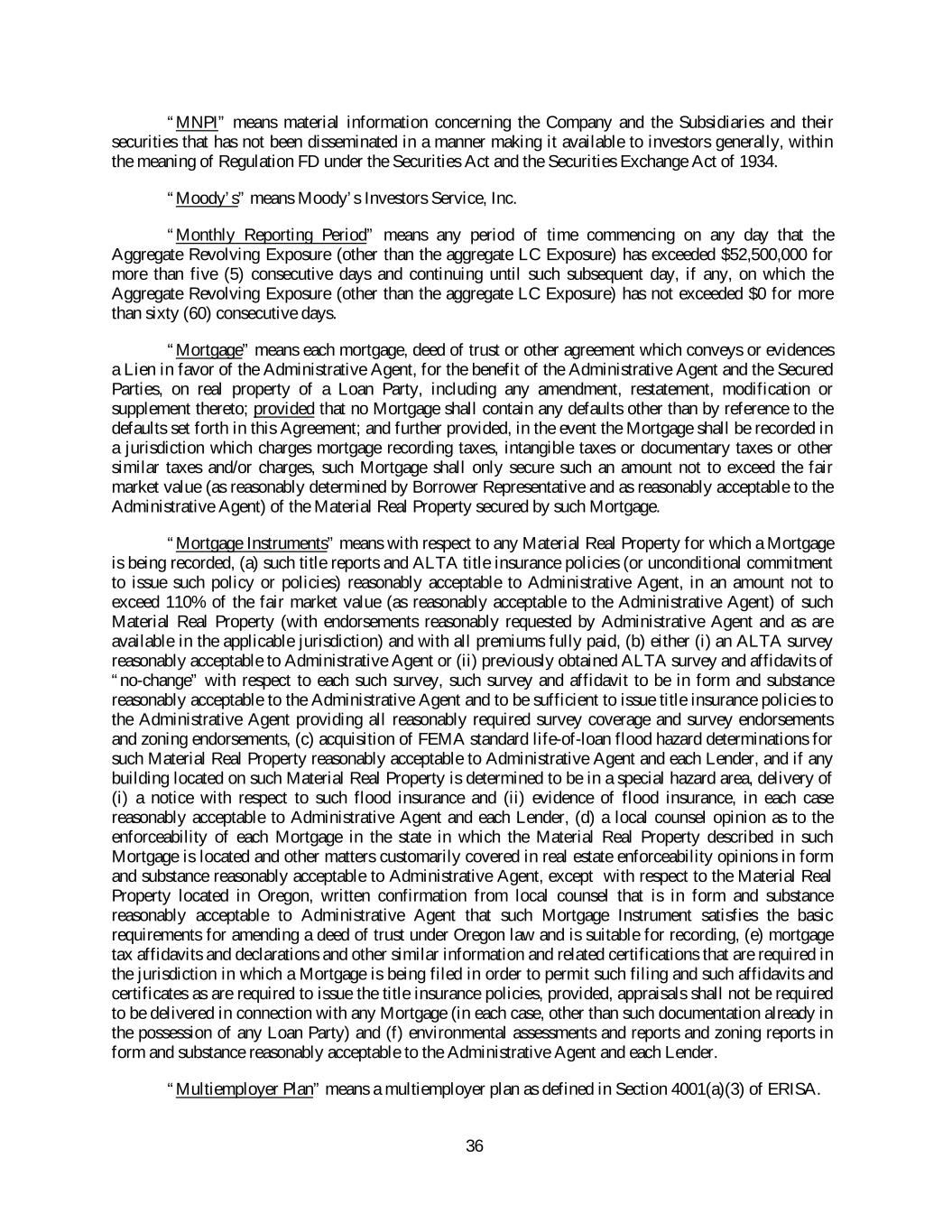 “MNPI” means material information concerning the Company and the Subsidiaries and their securities that has not been disseminated in a manner making it available to investors generally, within the meaning of Regulation FD under the Securities Act and the Securities Exchange Act of 1934. “Moody’s” means Moody’s Investors Service, Inc. “Monthly Reporting Period” means any period of time commencing on any day that the Aggregate Revolving Exposure (other than the aggregate LC Exposure) has exceeded $52,500,000 for more than five (5) consecutive days and continuing until such subsequent day, if any, on which the Aggregate Revolving Exposure (other than the aggregate LC Exposure) has not exceeded $0 for more than sixty (60) consecutive days. “Mortgage” means each mortgage, deed of trust or other agreement which conveys or evidences a Lien in favor of the Administrative Agent, for the benefit of the Administrative Agent and the Secured Parties, on real property of a Loan Party, including any amendment, restatement, modification or supplement thereto; provided that no Mortgage shall contain any defaults other than by reference to the defaults set forth in this Agreement; and further provided, in the event the Mortgage shall be recorded in a jurisdiction which charges mortgage recording taxes, intangible taxes or documentary taxes or other similar taxes and/or charges, such Mortgage shall only secure such an amount not to exceed the fair market value (as reasonably determined by Borrower Representative and as reasonably acceptable to the Administrative Agent) of the Material Real Property secured by such Mortgage. “Mortgage Instruments” means with respect to any Material Real Property for which a Mortgage is being recorded, (a) such title reports and ALTA title insurance policies (or unconditional commitment to issue such policy or policies) reasonably acceptable to Administrative Agent, in an amount not to exceed 110% of the fair market value (as reasonably acceptable to the Administrative Agent) of such Material Real Property (with endorsements reasonably requested by Administrative Agent and as are available in the applicable jurisdiction) and with all premiums fully paid, (b) either (i) an ALTA survey reasonably acceptable to Administrative Agent or (ii) previously obtained ALTA survey and affidavits of “no-change” with respect to each such survey, such survey and affidavit to be in form and substance reasonably acceptable to the Administrative Agent and to be sufficient to issue title insurance policies to the Administrative Agent providing all reasonably required survey coverage and survey endorsements and zoning endorsements, (c) acquisition of FEMA standard life-of-loan flood hazard determinations for such Material Real Property reasonably acceptable to Administrative Agent and each Lender, and if any building located on such Material Real Property is determined to be in a special hazard area, delivery of (i) a notice with respect to such flood insurance and (ii) evidence of flood insurance, in each case reasonably acceptable to Administrative Agent and each Lender, (d) a local counsel opinion as to the enforceability of each Mortgage in the state in which the Material Real Property described in such Mortgage is located and other matters customarily covered in real estate enforceability opinions in form and substance reasonably acceptable to Administrative Agent, except with respect to the Material Real Property located in Oregon, written confirmation from local counsel that is in form and substance reasonably acceptable to Administrative Agent that such Mortgage Instrument satisfies the basic requirements for amending a deed of trust under Oregon law and is suitable for recording, (e) mortgage tax affidavits and declarations and other similar information and related certifications that are required in the jurisdiction in which a Mortgage is being filed in order to permit such filing and such affidavits and certificates as are required to issue the title insurance policies, provided, appraisals shall not be required to be delivered in connection with any Mortgage (in each case, other than such documentation already in the possession of any Loan Party) and (f) environmental assessments and reports and zoning reports in form and substance reasonably acceptable to the Administrative Agent and each Lender. “Multiemployer Plan” means a multiemployer plan as defined in Section 4001(a)(3) of ERISA. 36