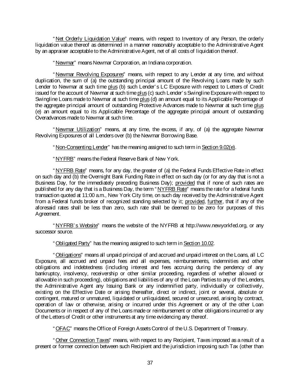 “Net Orderly Liquidation Value” means, with respect to Inventory of any Person, the orderly liquidation value thereof as determined in a manner reasonably acceptable to the Administrative Agent by an appraiser acceptable to the Administrative Agent, net of all costs of liquidation thereof. “Newmar” means Newmar Corporation, an Indiana corporation. “Newmar Revolving Exposures” means, with respect to any Lender at any time, and without duplication, the sum of (a) the outstanding principal amount of the Revolving Loans made by such Lender to Newmar at such time plus (b) such Lender’s LC Exposure with respect to Letters of Credit issued for the account of Newmar at such time plus (c) such Lender’s Swingline Exposure with respect to Swingline Loans made to Newmar at such time plus (d) an amount equal to its Applicable Percentage of the aggregate principal amount of outstanding Protective Advances made to Newmar at such time plus (e) an amount equal to its Applicable Percentage of the aggregate principal amount of outstanding Overadvances made to Newmar at such time. “Newmar Utilization” means, at any time, the excess, if any, of (a) the aggregate Newmar Revolving Exposures of all Lenders over (b) the Newmar Borrowing Base. “Non-Consenting Lender” has the meaning assigned to such term in Section 9.02(e). “NYFRB” means the Federal Reserve Bank of New York. “NYFRB Rate” means, for any day, the greater of (a) the Federal Funds Effective Rate in effect on such day and (b) the Overnight Bank Funding Rate in effect on such day (or for any day that is not a Business Day, for the immediately preceding Business Day); provided that if none of such rates are published for any day that is a Business Day, the term “NYFRB Rate” means the rate for a federal funds transaction quoted at 11:00 a.m., New York City time, on such day received by the Administrative Agent from a Federal funds broker of recognized standing selected by it; provided, further, that if any of the aforesaid rates shall be less than zero, such rate shall be deemed to be zero for purposes of this Agreement. “NYFRB’s Website” means the website of the NYFRB at http://www.newyorkfed.org, or any successor source. “Obligated Party” has the meaning assigned to such term in Section 10.02. “Obligations” means all unpaid principal of and accrued and unpaid interest on the Loans, all LC Exposure, all accrued and unpaid fees and all expenses, reimbursements, indemnities and other obligations and indebtedness (including interest and fees accruing during the pendency of any bankruptcy, insolvency, receivership or other similar proceeding, regardless of whether allowed or allowable in such proceeding), obligations and liabilities of any of the Loan Parties to any of the Lenders, the Administrative Agent any Issuing Bank or any indemnified party, individually or collectively, existing on the Effective Date or arising thereafter, direct or indirect, joint or several, absolute or contingent, matured or unmatured, liquidated or unliquidated, secured or unsecured, arising by contract, operation of law or otherwise, arising or incurred under this Agreement or any of the other Loan Documents or in respect of any of the Loans made or reimbursement or other obligations incurred or any of the Letters of Credit or other instruments at any time evidencing any thereof. “OFAC” means the Office of Foreign Assets Control of the U.S. Department of Treasury. “Other Connection Taxes” means, with respect to any Recipient, Taxes imposed as a result of a present or former connection between such Recipient and the jurisdiction imposing such Tax (other than 37