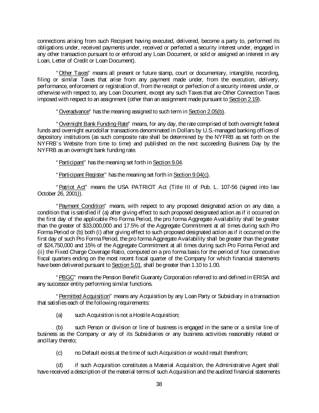 connections arising from such Recipient having executed, delivered, become a party to, performed its obligations under, received payments under, received or perfected a security interest under, engaged in any other transaction pursuant to or enforced any Loan Document, or sold or assigned an interest in any Loan, Letter of Credit or Loan Document). “Other Taxes” means all present or future stamp, court or documentary, intangible, recording, filing or similar Taxes that arise from any payment made under, from the execution, delivery, performance, enforcement or registration of, from the receipt or perfection of a security interest under, or otherwise with respect to, any Loan Document, except any such Taxes that are Other Connection Taxes imposed with respect to an assignment (other than an assignment made pursuant to Section 2.19). “Overadvance” has the meaning assigned to such term in Section 2.05(b). “Overnight Bank Funding Rate” means, for any day, the rate comprised of both overnight federal funds and overnight eurodollar transactions denominated in Dollars by U.S.-managed banking offices of depository institutions (as such composite rate shall be determined by the NYFRB as set forth on the NYFRB’s Website from time to time) and published on the next succeeding Business Day by the NYFRB as an overnight bank funding rate. “Participant” has the meaning set forth in Section 9.04. “Participant Register” has the meaning set forth in Section 9.04(c). “Patriot Act” means the USA PATRIOT Act (Title III of Pub. L. 107-56 (signed into law October 26, 2001)). “Payment Condition” means, with respect to any proposed designated action on any date, a condition that is satisfied if (a) after giving effect to such proposed designated action as if it occurred on the first day of the applicable Pro Forma Period, the pro forma Aggregate Availability shall be greater than the greater of $33,000,000 and 17.5% of the Aggregate Commitment at all times during such Pro Forma Period or (b) both (i) after giving effect to such proposed designated action as if it occurred on the first day of such Pro Forma Period, the pro forma Aggregate Availability shall be greater than the greater of $24,750,000 and 15% of the Aggregate Commitment at all times during such Pro Forma Period and (ii) the Fixed Charge Coverage Ratio, computed on a pro forma basis for the period of four consecutive fiscal quarters ending on the most recent fiscal quarter of the Company for which financial statements have been delivered pursuant to Section 5.01, shall be greater than 1.10 to 1.00. “PBGC” means the Pension Benefit Guaranty Corporation referred to and defined in ERISA and any successor entity performing similar functions. “Permitted Acquisition” means any Acquisition by any Loan Party or Subsidiary in a transaction that satisfies each of the following requirements: (a) such Acquisition is not a Hostile Acquisition; (b) such Person or division or line of business is engaged in the same or a similar line of business as the Company or any of its Subsidiaries or any business activities reasonably related or ancillary thereto; (c) no Default exists at the time of such Acquisition or would result therefrom; (d) if such Acquisition constitutes a Material Acquisition, the Administrative Agent shall have received a description of the material terms of such Acquisition and the audited financial statements 38