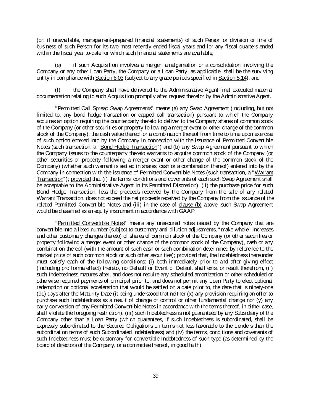(or, if unavailable, management-prepared financial statements) of such Person or division or line of business of such Person for its two most recently ended fiscal years and for any fiscal quarters ended within the fiscal year to-date for which such financial statements are available; (e) if such Acquisition involves a merger, amalgamation or a consolidation involving the Company or any other Loan Party, the Company or a Loan Party, as applicable, shall be the surviving entity in compliance with Section 6.03 (subject to any grace periods specified in Section 5.14); and (f) the Company shall have delivered to the Administrative Agent final executed material documentation relating to such Acquisition promptly after request therefor by the Administrative Agent. “Permitted Call Spread Swap Agreements” means (a) any Swap Agreement (including, but not limited to, any bond hedge transaction or capped call transaction) pursuant to which the Company acquires an option requiring the counterparty thereto to deliver to the Company shares of common stock of the Company (or other securities or property following a merger event or other change of the common stock of the Company), the cash value thereof or a combination thereof from time to time upon exercise of such option entered into by the Company in connection with the issuance of Permitted Convertible Notes (such transaction, a “Bond Hedge Transaction”) and (b) any Swap Agreement pursuant to which the Company issues to the counterparty thereto warrants to acquire common stock of the Company (or other securities or property following a merger event or other change of the common stock of the Company) (whether such warrant is settled in shares, cash or a combination thereof) entered into by the Company in connection with the issuance of Permitted Convertible Notes (such transaction, a “Warrant Transaction”); provided that (i) the terms, conditions and covenants of each such Swap Agreement shall be acceptable to the Administrative Agent in its Permitted Discretion), (ii) the purchase price for such Bond Hedge Transaction, less the proceeds received by the Company from the sale of any related Warrant Transaction, does not exceed the net proceeds received by the Company from the issuance of the related Permitted Convertible Notes and (iii) in the case of clause (b) above, such Swap Agreement would be classified as an equity instrument in accordance with GAAP. “Permitted Convertible Notes” means any unsecured notes issued by the Company that are convertible into a fixed number (subject to customary anti-dilution adjustments, “make-whole” increases and other customary changes thereto) of shares of common stock of the Company (or other securities or property following a merger event or other change of the common stock of the Company), cash or any combination thereof (with the amount of such cash or such combination determined by reference to the market price of such common stock or such other securities); provided that, the Indebtedness thereunder must satisfy each of the following conditions: (i) both immediately prior to and after giving effect (including pro forma effect) thereto, no Default or Event of Default shall exist or result therefrom, (ii) such Indebtedness matures after, and does not require any scheduled amortization or other scheduled or otherwise required payments of principal prior to, and does not permit any Loan Party to elect optional redemption or optional acceleration that would be settled on a date prior to, the date that is ninety-one (91) days after the Maturity Date (it being understood that neither (x) any provision requiring an offer to purchase such Indebtedness as a result of change of control or other fundamental change nor (y) any early conversion of any Permitted Convertible Notes in accordance with the terms thereof, in either case, shall violate the foregoing restriction), (iii) such Indebtedness is not guaranteed by any Subsidiary of the Company other than a Loan Party (which guarantees, if such Indebtedness is subordinated, shall be expressly subordinated to the Secured Obligations on terms not less favorable to the Lenders than the subordination terms of such Subordinated Indebtedness) and (iv) the terms, conditions and covenants of such Indebtedness must be customary for convertible Indebtedness of such type (as determined by the board of directors of the Company, or a committee thereof, in good faith). 39