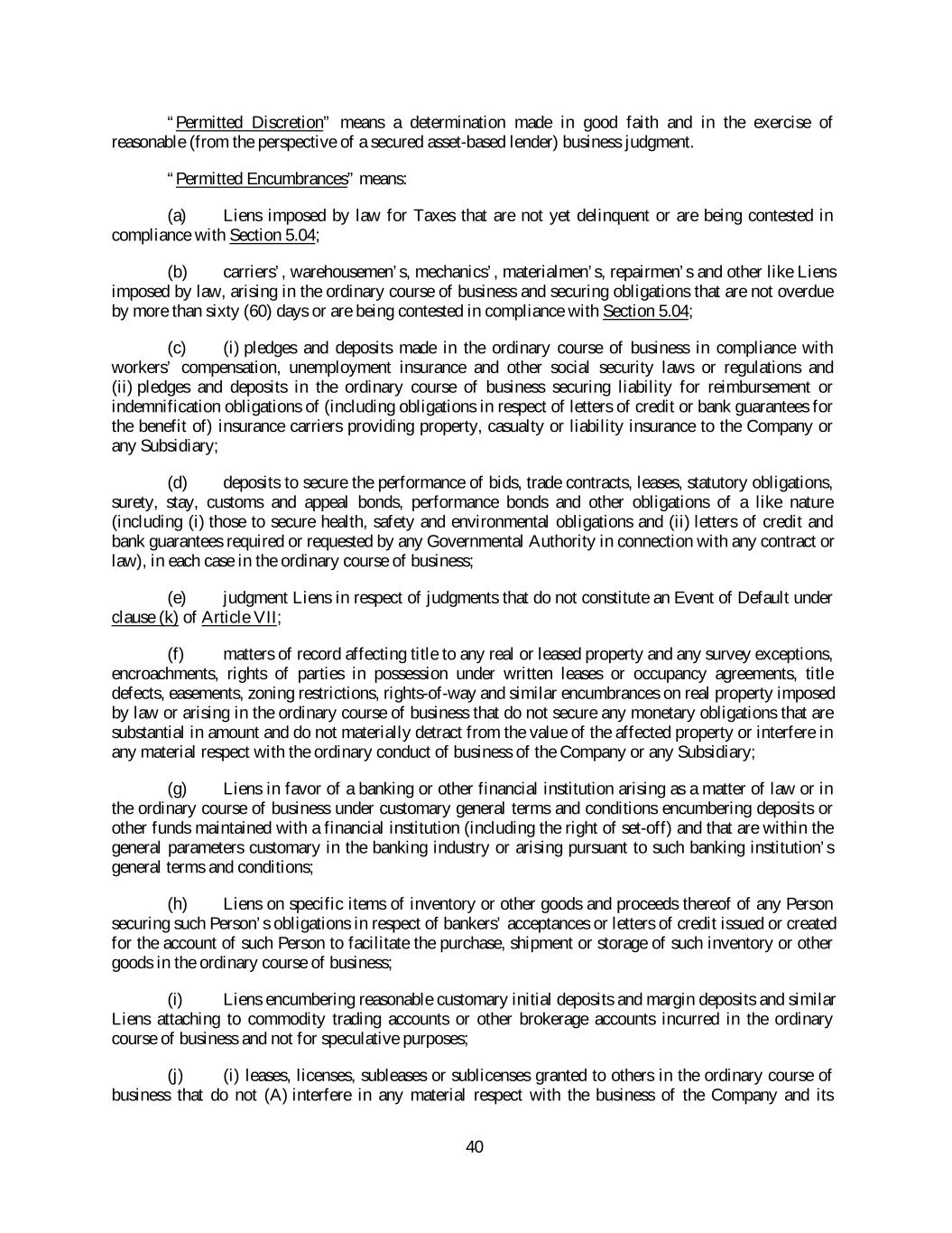 “Permitted Discretion” means a determination made in good faith and in the exercise of reasonable (from the perspective of a secured asset-based lender) business judgment. “Permitted Encumbrances” means: (a) Liens imposed by law for Taxes that are not yet delinquent or are being contested in compliance with Section 5.04; (b) carriers’, warehousemen’s, mechanics’, materialmen’s, repairmen’s and other like Liens imposed by law, arising in the ordinary course of business and securing obligations that are not overdue by more than sixty (60) days or are being contested in compliance with Section 5.04; (c) (i) pledges and deposits made in the ordinary course of business in compliance with workers’ compensation, unemployment insurance and other social security laws or regulations and (ii) pledges and deposits in the ordinary course of business securing liability for reimbursement or indemnification obligations of (including obligations in respect of letters of credit or bank guarantees for the benefit of) insurance carriers providing property, casualty or liability insurance to the Company or any Subsidiary; (d) deposits to secure the performance of bids, trade contracts, leases, statutory obligations, surety, stay, customs and appeal bonds, performance bonds and other obligations of a like nature (including (i) those to secure health, safety and environmental obligations and (ii) letters of credit and bank guarantees required or requested by any Governmental Authority in connection with any contract or law), in each case in the ordinary course of business; (e) judgment Liens in respect of judgments that do not constitute an Event of Default under clause (k) of Article VII; (f) matters of record affecting title to any real or leased property and any survey exceptions, encroachments, rights of parties in possession under written leases or occupancy agreements, title defects, easements, zoning restrictions, rights-of-way and similar encumbrances on real property imposed by law or arising in the ordinary course of business that do not secure any monetary obligations that are substantial in amount and do not materially detract from the value of the affected property or interfere in any material respect with the ordinary conduct of business of the Company or any Subsidiary; (g) Liens in favor of a banking or other financial institution arising as a matter of law or in the ordinary course of business under customary general terms and conditions encumbering deposits or other funds maintained with a financial institution (including the right of set-off) and that are within the general parameters customary in the banking industry or arising pursuant to such banking institution’s general terms and conditions; (h) Liens on specific items of inventory or other goods and proceeds thereof of any Person securing such Person’s obligations in respect of bankers’ acceptances or letters of credit issued or created for the account of such Person to facilitate the purchase, shipment or storage of such inventory or other goods in the ordinary course of business; (i) Liens encumbering reasonable customary initial deposits and margin deposits and similar Liens attaching to commodity trading accounts or other brokerage accounts incurred in the ordinary course of business and not for speculative purposes; (j) (i) leases, licenses, subleases or sublicenses granted to others in the ordinary course of business that do not (A) interfere in any material respect with the business of the Company and its 40