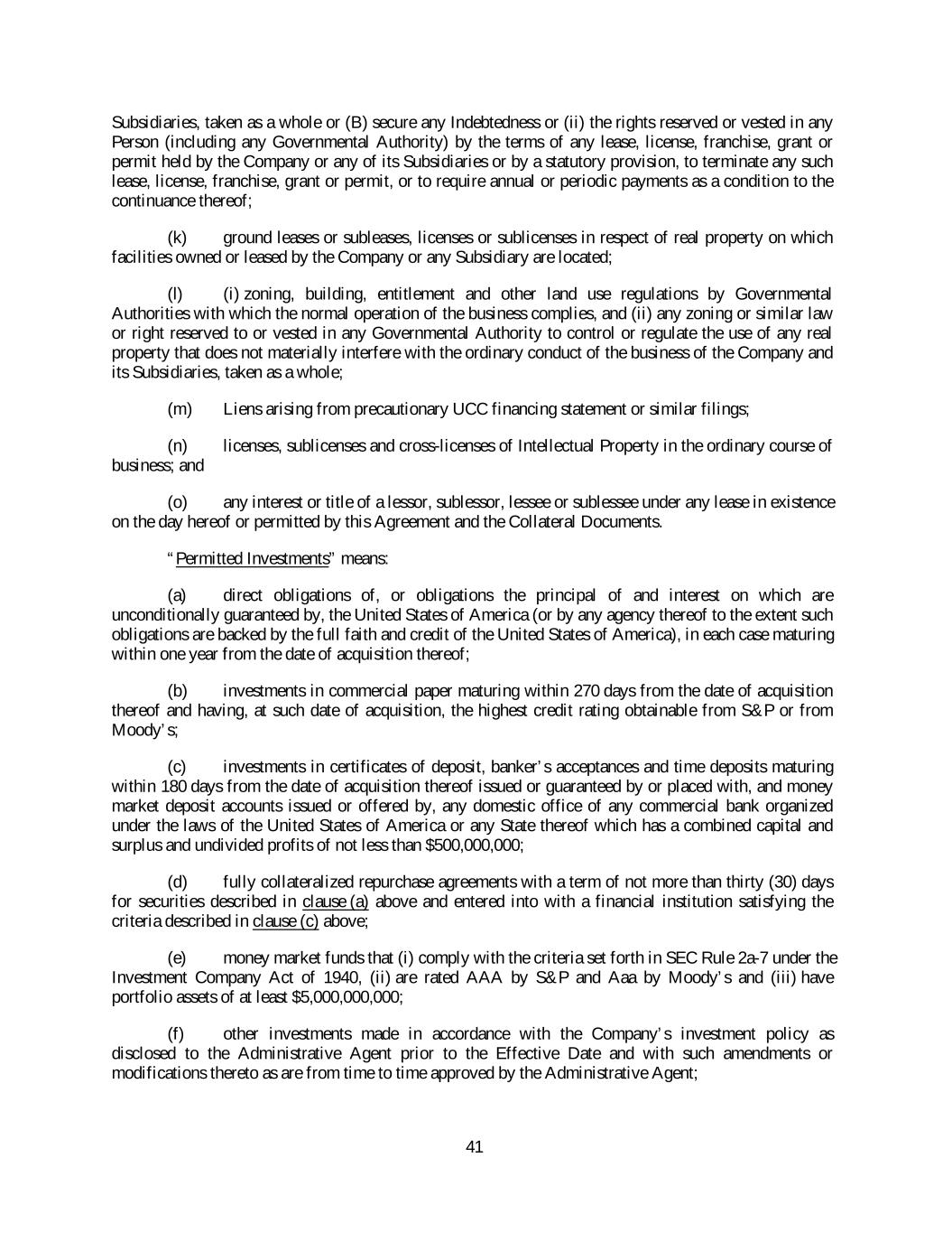 Subsidiaries, taken as a whole or (B) secure any Indebtedness or (ii) the rights reserved or vested in any Person (including any Governmental Authority) by the terms of any lease, license, franchise, grant or permit held by the Company or any of its Subsidiaries or by a statutory provision, to terminate any such lease, license, franchise, grant or permit, or to require annual or periodic payments as a condition to the continuance thereof; (k) ground leases or subleases, licenses or sublicenses in respect of real property on which facilities owned or leased by the Company or any Subsidiary are located; (l) (i) zoning, building, entitlement and other land use regulations by Governmental Authorities with which the normal operation of the business complies, and (ii) any zoning or similar law or right reserved to or vested in any Governmental Authority to control or regulate the use of any real property that does not materially interfere with the ordinary conduct of the business of the Company and its Subsidiaries, taken as a whole; (m) Liens arising from precautionary UCC financing statement or similar filings; (n) licenses, sublicenses and cross-licenses of Intellectual Property in the ordinary course of business; and (o) any interest or title of a lessor, sublessor, lessee or sublessee under any lease in existence on the day hereof or permitted by this Agreement and the Collateral Documents. “Permitted Investments” means: (a) direct obligations of, or obligations the principal of and interest on which are unconditionally guaranteed by, the United States of America (or by any agency thereof to the extent such obligations are backed by the full faith and credit of the United States of America), in each case maturing within one year from the date of acquisition thereof; (b) investments in commercial paper maturing within 270 days from the date of acquisition thereof and having, at such date of acquisition, the highest credit rating obtainable from S&P or from Moody’s; (c) investments in certificates of deposit, banker’s acceptances and time deposits maturing within 180 days from the date of acquisition thereof issued or guaranteed by or placed with, and money market deposit accounts issued or offered by, any domestic office of any commercial bank organized under the laws of the United States of America or any State thereof which has a combined capital and surplus and undivided profits of not less than $500,000,000; (d) fully collateralized repurchase agreements with a term of not more than thirty (30) days for securities described in clause (a) above and entered into with a financial institution satisfying the criteria described in clause (c) above; (e) money market funds that (i) comply with the criteria set forth in SEC Rule 2a-7 under the Investment Company Act of 1940, (ii) are rated AAA by S&P and Aaa by Moody’s and (iii) have portfolio assets of at least $5,000,000,000; (f) other investments made in accordance with the Company’s investment policy as disclosed to the Administrative Agent prior to the Effective Date and with such amendments or modifications thereto as are from time to time approved by the Administrative Agent; 41