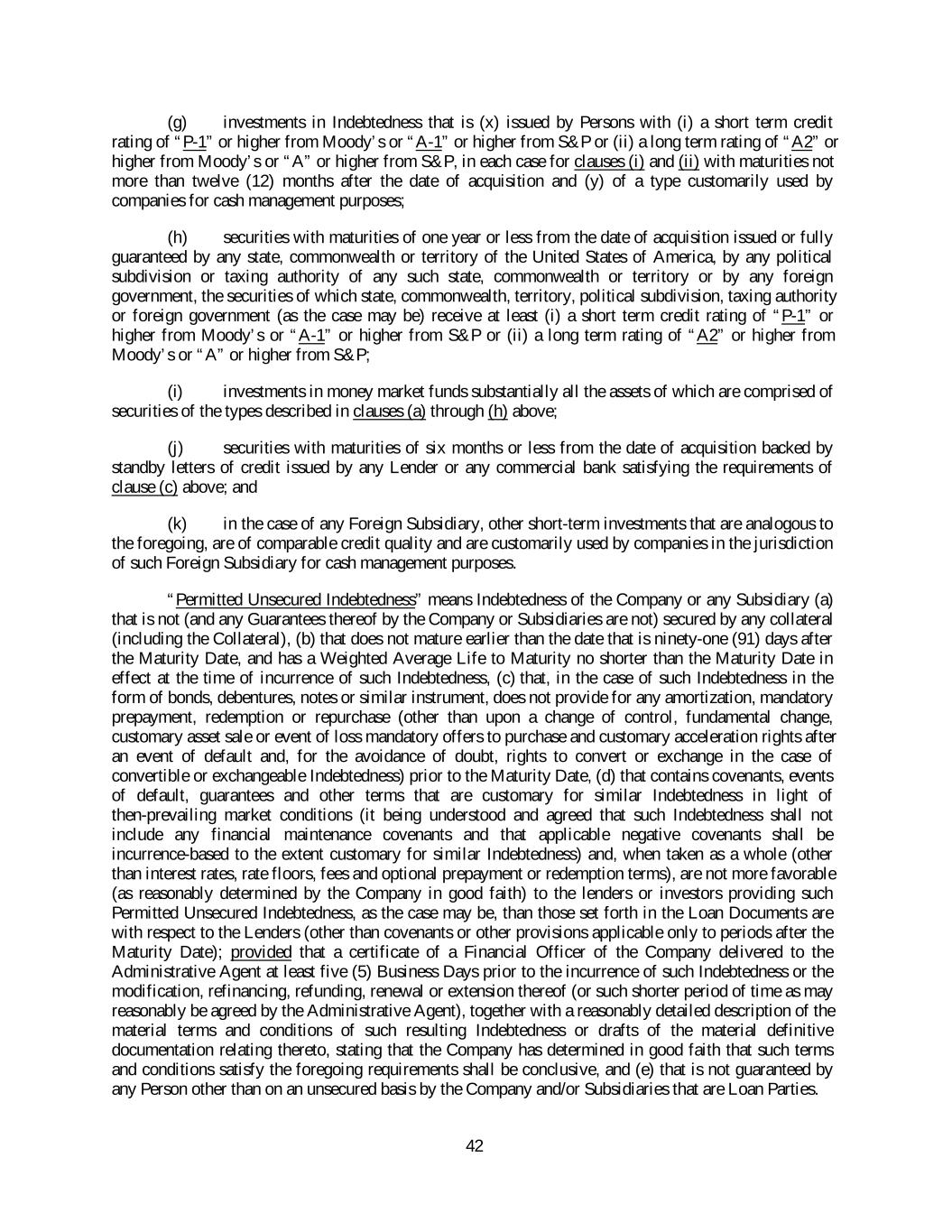 (g) investments in Indebtedness that is (x) issued by Persons with (i) a short term credit rating of “P-1” or higher from Moody’s or “A-1” or higher from S&P or (ii) a long term rating of “A2” or higher from Moody’s or “A” or higher from S&P, in each case for clauses (i) and (ii) with maturities not more than twelve (12) months after the date of acquisition and (y) of a type customarily used by companies for cash management purposes; (h) securities with maturities of one year or less from the date of acquisition issued or fully guaranteed by any state, commonwealth or territory of the United States of America, by any political subdivision or taxing authority of any such state, commonwealth or territory or by any foreign government, the securities of which state, commonwealth, territory, political subdivision, taxing authority or foreign government (as the case may be) receive at least (i) a short term credit rating of “P-1” or higher from Moody’s or “A-1” or higher from S&P or (ii) a long term rating of “A2” or higher from Moody’s or “A” or higher from S&P; (i) investments in money market funds substantially all the assets of which are comprised of securities of the types described in clauses (a) through (h) above; (j) securities with maturities of six months or less from the date of acquisition backed by standby letters of credit issued by any Lender or any commercial bank satisfying the requirements of clause (c) above; and (k) in the case of any Foreign Subsidiary, other short-term investments that are analogous to the foregoing, are of comparable credit quality and are customarily used by companies in the jurisdiction of such Foreign Subsidiary for cash management purposes. “Permitted Unsecured Indebtedness” means Indebtedness of the Company or any Subsidiary (a) that is not (and any Guarantees thereof by the Company or Subsidiaries are not) secured by any collateral (including the Collateral), (b) that does not mature earlier than the date that is ninety-one (91) days after the Maturity Date, and has a Weighted Average Life to Maturity no shorter than the Maturity Date in effect at the time of incurrence of such Indebtedness, (c) that, in the case of such Indebtedness in the form of bonds, debentures, notes or similar instrument, does not provide for any amortization, mandatory prepayment, redemption or repurchase (other than upon a change of control, fundamental change, customary asset sale or event of loss mandatory offers to purchase and customary acceleration rights after an event of default and, for the avoidance of doubt, rights to convert or exchange in the case of convertible or exchangeable Indebtedness) prior to the Maturity Date, (d) that contains covenants, events of default, guarantees and other terms that are customary for similar Indebtedness in light of then-prevailing market conditions (it being understood and agreed that such Indebtedness shall not include any financial maintenance covenants and that applicable negative covenants shall be incurrence-based to the extent customary for similar Indebtedness) and, when taken as a whole (other than interest rates, rate floors, fees and optional prepayment or redemption terms), are not more favorable (as reasonably determined by the Company in good faith) to the lenders or investors providing such Permitted Unsecured Indebtedness, as the case may be, than those set forth in the Loan Documents are with respect to the Lenders (other than covenants or other provisions applicable only to periods after the Maturity Date); provided that a certificate of a Financial Officer of the Company delivered to the Administrative Agent at least five (5) Business Days prior to the incurrence of such Indebtedness or the modification, refinancing, refunding, renewal or extension thereof (or such shorter period of time as may reasonably be agreed by the Administrative Agent), together with a reasonably detailed description of the material terms and conditions of such resulting Indebtedness or drafts of the material definitive documentation relating thereto, stating that the Company has determined in good faith that such terms and conditions satisfy the foregoing requirements shall be conclusive, and (e) that is not guaranteed by any Person other than on an unsecured basis by the Company and/or Subsidiaries that are Loan Parties. 42