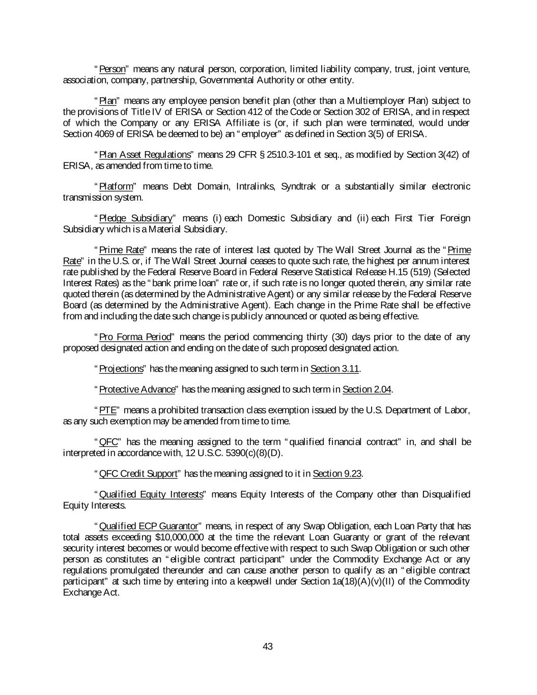 “Person” means any natural person, corporation, limited liability company, trust, joint venture, association, company, partnership, Governmental Authority or other entity. “Plan” means any employee pension benefit plan (other than a Multiemployer Plan) subject to the provisions of Title IV of ERISA or Section 412 of the Code or Section 302 of ERISA, and in respect of which the Company or any ERISA Affiliate is (or, if such plan were terminated, would under Section 4069 of ERISA be deemed to be) an “employer” as defined in Section 3(5) of ERISA. “Plan Asset Regulations” means 29 CFR § 2510.3-101 et seq., as modified by Section 3(42) of ERISA, as amended from time to time. “Platform” means Debt Domain, Intralinks, Syndtrak or a substantially similar electronic transmission system. “Pledge Subsidiary” means (i) each Domestic Subsidiary and (ii) each First Tier Foreign Subsidiary which is a Material Subsidiary. “Prime Rate” means the rate of interest last quoted by The Wall Street Journal as the “Prime Rate” in the U.S. or, if The Wall Street Journal ceases to quote such rate, the highest per annum interest rate published by the Federal Reserve Board in Federal Reserve Statistical Release H.15 (519) (Selected Interest Rates) as the “bank prime loan” rate or, if such rate is no longer quoted therein, any similar rate quoted therein (as determined by the Administrative Agent) or any similar release by the Federal Reserve Board (as determined by the Administrative Agent). Each change in the Prime Rate shall be effective from and including the date such change is publicly announced or quoted as being effective. “Pro Forma Period” means the period commencing thirty (30) days prior to the date of any proposed designated action and ending on the date of such proposed designated action. “Projections” has the meaning assigned to such term in Section 3.11. “Protective Advance” has the meaning assigned to such term in Section 2.04. “PTE” means a prohibited transaction class exemption issued by the U.S. Department of Labor, as any such exemption may be amended from time to time. “QFC” has the meaning assigned to the term “qualified financial contract” in, and shall be interpreted in accordance with, 12 U.S.C. 5390(c)(8)(D). “QFC Credit Support” has the meaning assigned to it in Section 9.23. “Qualified Equity Interests” means Equity Interests of the Company other than Disqualified Equity Interests. “Qualified ECP Guarantor” means, in respect of any Swap Obligation, each Loan Party that has total assets exceeding $10,000,000 at the time the relevant Loan Guaranty or grant of the relevant security interest becomes or would become effective with respect to such Swap Obligation or such other person as constitutes an “eligible contract participant” under the Commodity Exchange Act or any regulations promulgated thereunder and can cause another person to qualify as an “eligible contract participant” at such time by entering into a keepwell under Section 1a(18)(A)(v)(II) of the Commodity Exchange Act. 43