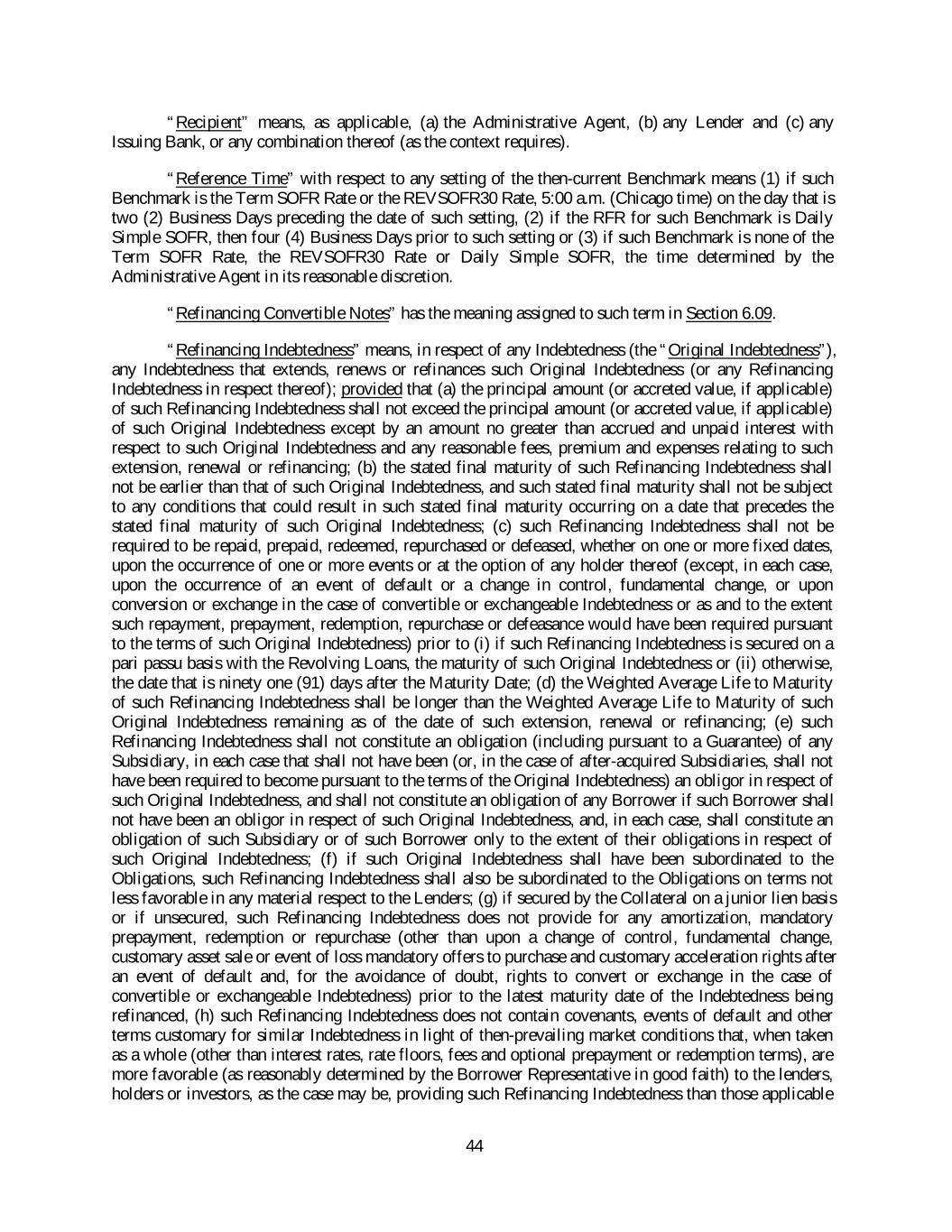 “Recipient” means, as applicable, (a) the Administrative Agent, (b) any Lender and (c) any Issuing Bank, or any combination thereof (as the context requires). “Reference Time” with respect to any setting of the then-current Benchmark means (1) if such Benchmark is the Term SOFR Rate or the REVSOFR30 Rate, 5:00 a.m. (Chicago time) on the day that is two (2) Business Days preceding the date of such setting, (2) if the RFR for such Benchmark is Daily Simple SOFR, then four (4) Business Days prior to such setting or (3) if such Benchmark is none of the Term SOFR Rate, the REVSOFR30 Rate or Daily Simple SOFR, the time determined by the Administrative Agent in its reasonable discretion. “Refinancing Convertible Notes” has the meaning assigned to such term in Section 6.09. “Refinancing Indebtedness” means, in respect of any Indebtedness (the “Original Indebtedness”), any Indebtedness that extends, renews or refinances such Original Indebtedness (or any Refinancing Indebtedness in respect thereof); provided that (a) the principal amount (or accreted value, if applicable) of such Refinancing Indebtedness shall not exceed the principal amount (or accreted value, if applicable) of such Original Indebtedness except by an amount no greater than accrued and unpaid interest with respect to such Original Indebtedness and any reasonable fees, premium and expenses relating to such extension, renewal or refinancing; (b) the stated final maturity of such Refinancing Indebtedness shall not be earlier than that of such Original Indebtedness, and such stated final maturity shall not be subject to any conditions that could result in such stated final maturity occurring on a date that precedes the stated final maturity of such Original Indebtedness; (c) such Refinancing Indebtedness shall not be required to be repaid, prepaid, redeemed, repurchased or defeased, whether on one or more fixed dates, upon the occurrence of one or more events or at the option of any holder thereof (except, in each case, upon the occurrence of an event of default or a change in control, fundamental change, or upon conversion or exchange in the case of convertible or exchangeable Indebtedness or as and to the extent such repayment, prepayment, redemption, repurchase or defeasance would have been required pursuant to the terms of such Original Indebtedness) prior to (i) if such Refinancing Indebtedness is secured on a pari passu basis with the Revolving Loans, the maturity of such Original Indebtedness or (ii) otherwise, the date that is ninety one (91) days after the Maturity Date; (d) the Weighted Average Life to Maturity of such Refinancing Indebtedness shall be longer than the Weighted Average Life to Maturity of such Original Indebtedness remaining as of the date of such extension, renewal or refinancing; (e) such Refinancing Indebtedness shall not constitute an obligation (including pursuant to a Guarantee) of any Subsidiary, in each case that shall not have been (or, in the case of after-acquired Subsidiaries, shall not have been required to become pursuant to the terms of the Original Indebtedness) an obligor in respect of such Original Indebtedness, and shall not constitute an obligation of any Borrower if such Borrower shall not have been an obligor in respect of such Original Indebtedness, and, in each case, shall constitute an obligation of such Subsidiary or of such Borrower only to the extent of their obligations in respect of such Original Indebtedness; (f) if such Original Indebtedness shall have been subordinated to the Obligations, such Refinancing Indebtedness shall also be subordinated to the Obligations on terms not less favorable in any material respect to the Lenders; (g) if secured by the Collateral on a junior lien basis or if unsecured, such Refinancing Indebtedness does not provide for any amortization, mandatory prepayment, redemption or repurchase (other than upon a change of control, fundamental change, customary asset sale or event of loss mandatory offers to purchase and customary acceleration rights after an event of default and, for the avoidance of doubt, rights to convert or exchange in the case of convertible or exchangeable Indebtedness) prior to the latest maturity date of the Indebtedness being refinanced, (h) such Refinancing Indebtedness does not contain covenants, events of default and other terms customary for similar Indebtedness in light of then-prevailing market conditions that, when taken as a whole (other than interest rates, rate floors, fees and optional prepayment or redemption terms), are more favorable (as reasonably determined by the Borrower Representative in good faith) to the lenders, holders or investors, as the case may be, providing such Refinancing Indebtedness than those applicable 44