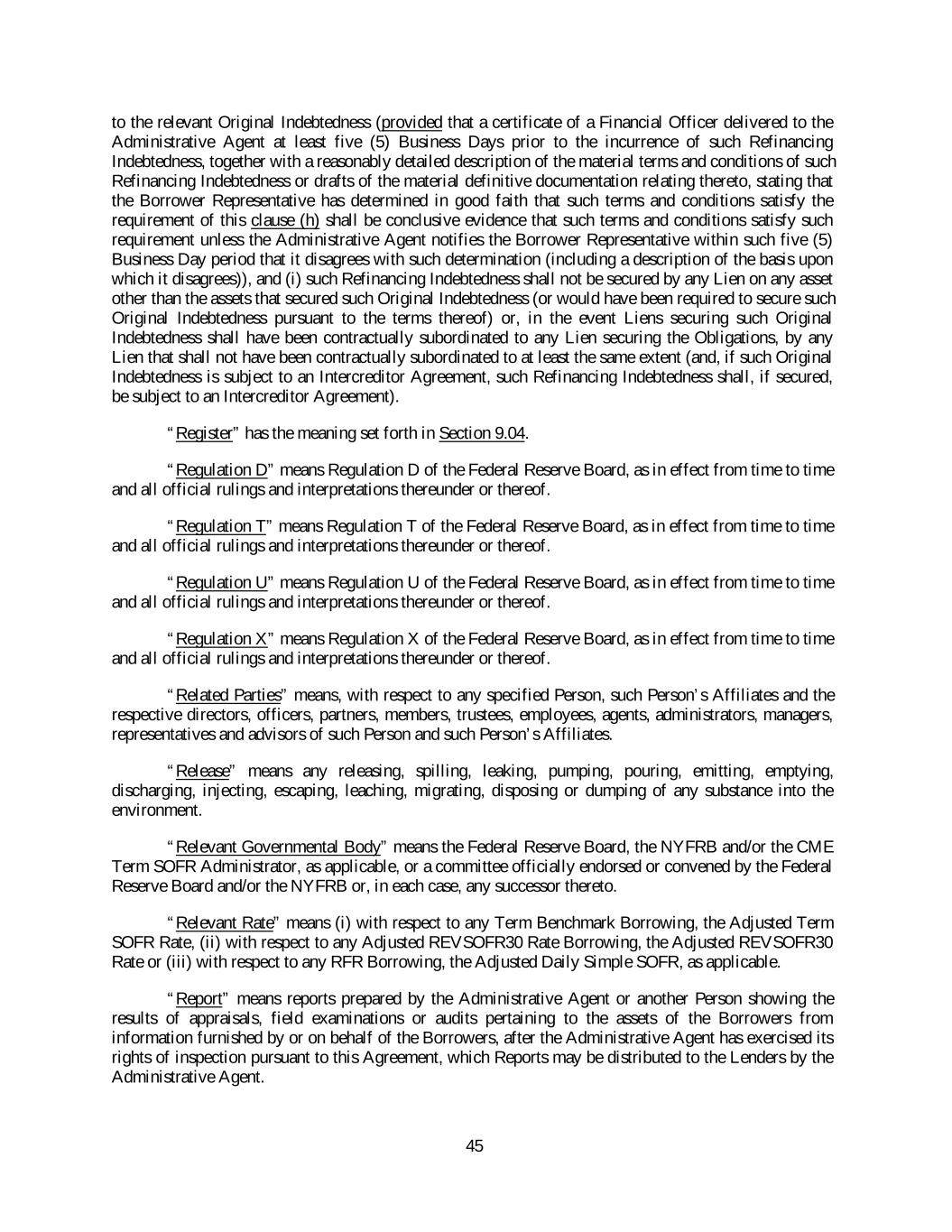 to the relevant Original Indebtedness (provided that a certificate of a Financial Officer delivered to the Administrative Agent at least five (5) Business Days prior to the incurrence of such Refinancing Indebtedness, together with a reasonably detailed description of the material terms and conditions of such Refinancing Indebtedness or drafts of the material definitive documentation relating thereto, stating that the Borrower Representative has determined in good faith that such terms and conditions satisfy the requirement of this clause (h) shall be conclusive evidence that such terms and conditions satisfy such requirement unless the Administrative Agent notifies the Borrower Representative within such five (5) Business Day period that it disagrees with such determination (including a description of the basis upon which it disagrees)), and (i) such Refinancing Indebtedness shall not be secured by any Lien on any asset other than the assets that secured such Original Indebtedness (or would have been required to secure such Original Indebtedness pursuant to the terms thereof) or, in the event Liens securing such Original Indebtedness shall have been contractually subordinated to any Lien securing the Obligations, by any Lien that shall not have been contractually subordinated to at least the same extent (and, if such Original Indebtedness is subject to an Intercreditor Agreement, such Refinancing Indebtedness shall, if secured, be subject to an Intercreditor Agreement). “Register” has the meaning set forth in Section 9.04. “Regulation D” means Regulation D of the Federal Reserve Board, as in effect from time to time and all official rulings and interpretations thereunder or thereof. “Regulation T” means Regulation T of the Federal Reserve Board, as in effect from time to time and all official rulings and interpretations thereunder or thereof. “Regulation U” means Regulation U of the Federal Reserve Board, as in effect from time to time and all official rulings and interpretations thereunder or thereof. “Regulation X” means Regulation X of the Federal Reserve Board, as in effect from time to time and all official rulings and interpretations thereunder or thereof. “Related Parties” means, with respect to any specified Person, such Person’s Affiliates and the respective directors, officers, partners, members, trustees, employees, agents, administrators, managers, representatives and advisors of such Person and such Person’s Affiliates. “Release” means any releasing, spilling, leaking, pumping, pouring, emitting, emptying, discharging, injecting, escaping, leaching, migrating, disposing or dumping of any substance into the environment. “Relevant Governmental Body” means the Federal Reserve Board, the NYFRB and/or the CME Term SOFR Administrator, as applicable, or a committee officially endorsed or convened by the Federal Reserve Board and/or the NYFRB or, in each case, any successor thereto. “Relevant Rate” means (i) with respect to any Term Benchmark Borrowing, the Adjusted Term SOFR Rate, (ii) with respect to any Adjusted REVSOFR30 Rate Borrowing, the Adjusted REVSOFR30 Rate or (iii) with respect to any RFR Borrowing, the Adjusted Daily Simple SOFR, as applicable. “Report” means reports prepared by the Administrative Agent or another Person showing the results of appraisals, field examinations or audits pertaining to the assets of the Borrowers from information furnished by or on behalf of the Borrowers, after the Administrative Agent has exercised its rights of inspection pursuant to this Agreement, which Reports may be distributed to the Lenders by the Administrative Agent. 45