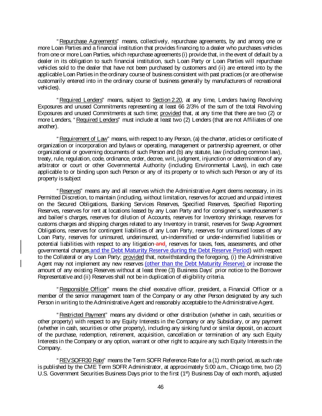 “Repurchase Agreements” means, collectively, repurchase agreements, by and among one or more Loan Parties and a financial institution that provides financing to a dealer who purchases vehicles from one or more Loan Parties, which repurchase agreements (i) provide that, in the event of default by a dealer in its obligation to such financial institution, such Loan Party or Loan Parties will repurchase vehicles sold to the dealer that have not been purchased by customers and (ii) are entered into by the applicable Loan Parties in the ordinary course of business consistent with past practices (or are otherwise customarily entered into in the ordinary course of business generally by manufacturers of recreational vehicles). “Required Lenders” means, subject to Section 2.20, at any time, Lenders having Revolving Exposures and unused Commitments representing at least 66 2/3% of the sum of the total Revolving Exposures and unused Commitments at such time; provided that, at any time that there are two (2) or more Lenders, “Required Lenders” must include at least two (2) Lenders (that are not Affiliates of one another). “Requirement of Law” means, with respect to any Person, (a) the charter, articles or certificate of organization or incorporation and bylaws or operating, management or partnership agreement, or other organizational or governing documents of such Person and (b) any statute, law (including common law), treaty, rule, regulation, code, ordinance, order, decree, writ, judgment, injunction or determination of any arbitrator or court or other Governmental Authority (including Environmental Laws), in each case applicable to or binding upon such Person or any of its property or to which such Person or any of its property is subject “Reserves” means any and all reserves which the Administrative Agent deems necessary, in its Permitted Discretion, to maintain (including, without limitation, reserves for accrued and unpaid interest on the Secured Obligations, Banking Services Reserves, Specified Reserves, Specified Reporting Reserves, reserves for rent at locations leased by any Loan Party and for consignee’s, warehousemen’s and bailee’s charges, reserves for dilution of Accounts, reserves for Inventory shrinkage, reserves for customs charges and shipping charges related to any Inventory in transit, reserves for Swap Agreement Obligations, reserves for contingent liabilities of any Loan Party, reserves for uninsured losses of any Loan Party, reserves for uninsured, underinsured, un-indemnified or under-indemnified liabilities or potential liabilities with respect to any litigation and, reserves for taxes, fees, assessments, and other governmental charges and the Debt Maturity Reserve during the Debt Reserve Period) with respect to the Collateral or any Loan Party; provided that, notwithstanding the foregoing, (i) the Administrative Agent may not implement any new reserves (other than the Debt Maturity Reserve) or increase the amount of any existing Reserves without at least three (3) Business Days’ prior notice to the Borrower Representative and (ii) Reserves shall not be in duplication of eligibility criteria. “Responsible Officer” means the chief executive officer, president, a Financial Officer or a member of the senior management team of the Company or any other Person designated by any such Person in writing to the Administrative Agent and reasonably acceptable to the Administrative Agent. “Restricted Payment” means any dividend or other distribution (whether in cash, securities or other property) with respect to any Equity Interests in the Company or any Subsidiary, or any payment (whether in cash, securities or other property), including any sinking fund or similar deposit, on account of the purchase, redemption, retirement, acquisition, cancellation or termination of any such Equity Interests in the Company or any option, warrant or other right to acquire any such Equity Interests in the Company. “REVSOFR30 Rate” means the Term SOFR Reference Rate for a (1) month period, as such rate is published by the CME Term SOFR Administrator, at approximately 5:00 a.m., Chicago time, two (2) U.S. Government Securities Business Days prior to the first (1st) Business Day of each month, adjusted 46