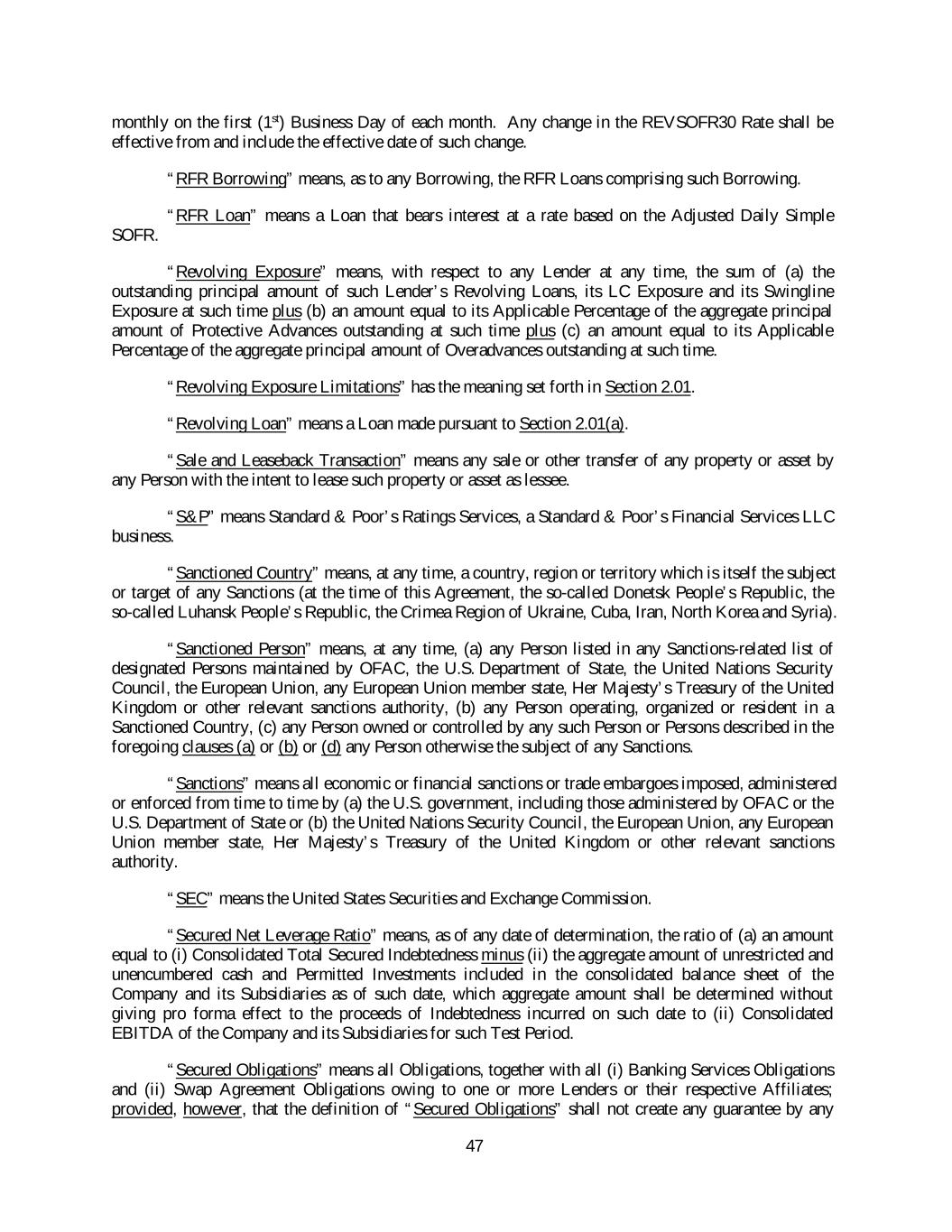 monthly on the first (1st) Business Day of each month. Any change in the REVSOFR30 Rate shall be effective from and include the effective date of such change. “RFR Borrowing” means, as to any Borrowing, the RFR Loans comprising such Borrowing. “RFR Loan” means a Loan that bears interest at a rate based on the Adjusted Daily Simple SOFR. “Revolving Exposure” means, with respect to any Lender at any time, the sum of (a) the outstanding principal amount of such Lender’s Revolving Loans, its LC Exposure and its Swingline Exposure at such time plus (b) an amount equal to its Applicable Percentage of the aggregate principal amount of Protective Advances outstanding at such time plus (c) an amount equal to its Applicable Percentage of the aggregate principal amount of Overadvances outstanding at such time. “Revolving Exposure Limitations” has the meaning set forth in Section 2.01. “Revolving Loan” means a Loan made pursuant to Section 2.01(a). “Sale and Leaseback Transaction” means any sale or other transfer of any property or asset by any Person with the intent to lease such property or asset as lessee. “S&P” means Standard & Poor’s Ratings Services, a Standard & Poor’s Financial Services LLC business. “Sanctioned Country” means, at any time, a country, region or territory which is itself the subject or target of any Sanctions (at the time of this Agreement, the so-called Donetsk People’s Republic, the so-called Luhansk People’s Republic, the Crimea Region of Ukraine, Cuba, Iran, North Korea and Syria). “Sanctioned Person” means, at any time, (a) any Person listed in any Sanctions-related list of designated Persons maintained by OFAC, the U.S. Department of State, the United Nations Security Council, the European Union, any European Union member state, Her Majesty’s Treasury of the United Kingdom or other relevant sanctions authority, (b) any Person operating, organized or resident in a Sanctioned Country, (c) any Person owned or controlled by any such Person or Persons described in the foregoing clauses (a) or (b) or (d) any Person otherwise the subject of any Sanctions. “Sanctions” means all economic or financial sanctions or trade embargoes imposed, administered or enforced from time to time by (a) the U.S. government, including those administered by OFAC or the U.S. Department of State or (b) the United Nations Security Council, the European Union, any European Union member state, Her Majesty’s Treasury of the United Kingdom or other relevant sanctions authority. “SEC” means the United States Securities and Exchange Commission. “Secured Net Leverage Ratio” means, as of any date of determination, the ratio of (a) an amount equal to (i) Consolidated Total Secured Indebtedness minus (ii) the aggregate amount of unrestricted and unencumbered cash and Permitted Investments included in the consolidated balance sheet of the Company and its Subsidiaries as of such date, which aggregate amount shall be determined without giving pro forma effect to the proceeds of Indebtedness incurred on such date to (ii) Consolidated EBITDA of the Company and its Subsidiaries for such Test Period. “Secured Obligations” means all Obligations, together with all (i) Banking Services Obligations and (ii) Swap Agreement Obligations owing to one or more Lenders or their respective Affiliates; provided, however, that the definition of “Secured Obligations” shall not create any guarantee by any 47