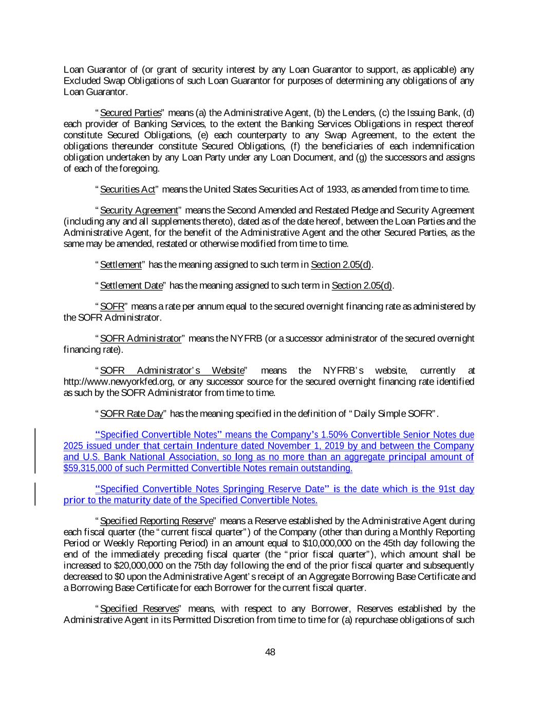 Loan Guarantor of (or grant of security interest by any Loan Guarantor to support, as applicable) any Excluded Swap Obligations of such Loan Guarantor for purposes of determining any obligations of any Loan Guarantor. “Secured Parties” means (a) the Administrative Agent, (b) the Lenders, (c) the Issuing Bank, (d) each provider of Banking Services, to the extent the Banking Services Obligations in respect thereof constitute Secured Obligations, (e) each counterparty to any Swap Agreement, to the extent the obligations thereunder constitute Secured Obligations, (f) the beneficiaries of each indemnification obligation undertaken by any Loan Party under any Loan Document, and (g) the successors and assigns of each of the foregoing. “Securities Act” means the United States Securities Act of 1933, as amended from time to time. “Security Agreement” means the Second Amended and Restated Pledge and Security Agreement (including any and all supplements thereto), dated as of the date hereof, between the Loan Parties and the Administrative Agent, for the benefit of the Administrative Agent and the other Secured Parties, as the same may be amended, restated or otherwise modified from time to time. “Settlement” has the meaning assigned to such term in Section 2.05(d). “Settlement Date” has the meaning assigned to such term in Section 2.05(d). “SOFR” means a rate per annum equal to the secured overnight financing rate as administered by the SOFR Administrator. “SOFR Administrator” means the NYFRB (or a successor administrator of the secured overnight financing rate). “SOFR Administrator’s Website” means the NYFRB’s website, currently at http://www.newyorkfed.org, or any successor source for the secured overnight financing rate identified as such by the SOFR Administrator from time to time. “SOFR Rate Day” has the meaning specified in the definition of “Daily Simple SOFR”. “Specified Convertible Notes” means the Company’s 1.50% Convertible Senior Notes due 2025 issued under that certain Indenture dated November 1, 2019 by and between the Company and U.S. Bank National Association, so long as no more than an aggregate principal amount of $59,315,000 of such Permitted Convertible Notes remain outstanding. “Specified Convertible Notes Springing Reserve Date” is the date which is the 91st day prior to the maturity date of the Specified Convertible Notes. “Specified Reporting Reserve” means a Reserve established by the Administrative Agent during each fiscal quarter (the “current fiscal quarter”) of the Company (other than during a Monthly Reporting Period or Weekly Reporting Period) in an amount equal to $10,000,000 on the 45th day following the end of the immediately preceding fiscal quarter (the “prior fiscal quarter”), which amount shall be increased to $20,000,000 on the 75th day following the end of the prior fiscal quarter and subsequently decreased to $0 upon the Administrative Agent’s receipt of an Aggregate Borrowing Base Certificate and a Borrowing Base Certificate for each Borrower for the current fiscal quarter. “Specified Reserves” means, with respect to any Borrower, Reserves established by the Administrative Agent in its Permitted Discretion from time to time for (a) repurchase obligations of such 48