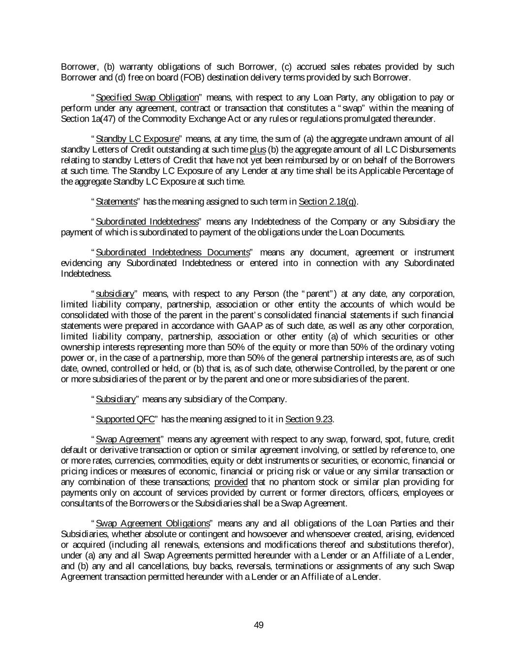 Borrower, (b) warranty obligations of such Borrower, (c) accrued sales rebates provided by such Borrower and (d) free on board (FOB) destination delivery terms provided by such Borrower. “Specified Swap Obligation” means, with respect to any Loan Party, any obligation to pay or perform under any agreement, contract or transaction that constitutes a “swap” within the meaning of Section 1a(47) of the Commodity Exchange Act or any rules or regulations promulgated thereunder. “Standby LC Exposure” means, at any time, the sum of (a) the aggregate undrawn amount of all standby Letters of Credit outstanding at such time plus (b) the aggregate amount of all LC Disbursements relating to standby Letters of Credit that have not yet been reimbursed by or on behalf of the Borrowers at such time. The Standby LC Exposure of any Lender at any time shall be its Applicable Percentage of the aggregate Standby LC Exposure at such time. “Statements” has the meaning assigned to such term in Section 2.18(g). “Subordinated Indebtedness” means any Indebtedness of the Company or any Subsidiary the payment of which is subordinated to payment of the obligations under the Loan Documents. “Subordinated Indebtedness Documents” means any document, agreement or instrument evidencing any Subordinated Indebtedness or entered into in connection with any Subordinated Indebtedness. “subsidiary” means, with respect to any Person (the “parent”) at any date, any corporation, limited liability company, partnership, association or other entity the accounts of which would be consolidated with those of the parent in the parent’s consolidated financial statements if such financial statements were prepared in accordance with GAAP as of such date, as well as any other corporation, limited liability company, partnership, association or other entity (a) of which securities or other ownership interests representing more than 50% of the equity or more than 50% of the ordinary voting power or, in the case of a partnership, more than 50% of the general partnership interests are, as of such date, owned, controlled or held, or (b) that is, as of such date, otherwise Controlled, by the parent or one or more subsidiaries of the parent or by the parent and one or more subsidiaries of the parent. “Subsidiary” means any subsidiary of the Company. “Supported QFC” has the meaning assigned to it in Section 9.23. “Swap Agreement” means any agreement with respect to any swap, forward, spot, future, credit default or derivative transaction or option or similar agreement involving, or settled by reference to, one or more rates, currencies, commodities, equity or debt instruments or securities, or economic, financial or pricing indices or measures of economic, financial or pricing risk or value or any similar transaction or any combination of these transactions; provided that no phantom stock or similar plan providing for payments only on account of services provided by current or former directors, officers, employees or consultants of the Borrowers or the Subsidiaries shall be a Swap Agreement. “Swap Agreement Obligations” means any and all obligations of the Loan Parties and their Subsidiaries, whether absolute or contingent and howsoever and whensoever created, arising, evidenced or acquired (including all renewals, extensions and modifications thereof and substitutions therefor), under (a) any and all Swap Agreements permitted hereunder with a Lender or an Affiliate of a Lender, and (b) any and all cancellations, buy backs, reversals, terminations or assignments of any such Swap Agreement transaction permitted hereunder with a Lender or an Affiliate of a Lender. 49