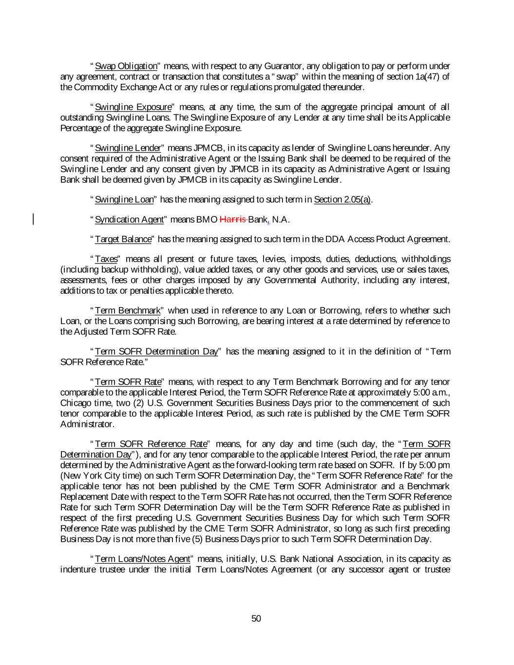 “Swap Obligation” means, with respect to any Guarantor, any obligation to pay or perform under any agreement, contract or transaction that constitutes a “swap” within the meaning of section 1a(47) of the Commodity Exchange Act or any rules or regulations promulgated thereunder. “Swingline Exposure” means, at any time, the sum of the aggregate principal amount of all outstanding Swingline Loans. The Swingline Exposure of any Lender at any time shall be its Applicable Percentage of the aggregate Swingline Exposure. “Swingline Lender” means JPMCB, in its capacity as lender of Swingline Loans hereunder. Any consent required of the Administrative Agent or the Issuing Bank shall be deemed to be required of the Swingline Lender and any consent given by JPMCB in its capacity as Administrative Agent or Issuing Bank shall be deemed given by JPMCB in its capacity as Swingline Lender. “Swingline Loan” has the meaning assigned to such term in Section 2.05(a). “Syndication Agent” means BMO Harris Bank, N.A. “Target Balance” has the meaning assigned to such term in the DDA Access Product Agreement. “Taxes” means all present or future taxes, levies, imposts, duties, deductions, withholdings (including backup withholding), value added taxes, or any other goods and services, use or sales taxes, assessments, fees or other charges imposed by any Governmental Authority, including any interest, additions to tax or penalties applicable thereto. “Term Benchmark” when used in reference to any Loan or Borrowing, refers to whether such Loan, or the Loans comprising such Borrowing, are bearing interest at a rate determined by reference to the Adjusted Term SOFR Rate. “Term SOFR Determination Day” has the meaning assigned to it in the definition of “Term SOFR Reference Rate.” “Term SOFR Rate” means, with respect to any Term Benchmark Borrowing and for any tenor comparable to the applicable Interest Period, the Term SOFR Reference Rate at approximately 5:00 a.m., Chicago time, two (2) U.S. Government Securities Business Days prior to the commencement of such tenor comparable to the applicable Interest Period, as such rate is published by the CME Term SOFR Administrator. “Term SOFR Reference Rate” means, for any day and time (such day, the “Term SOFR Determination Day”), and for any tenor comparable to the applicable Interest Period, the rate per annum determined by the Administrative Agent as the forward-looking term rate based on SOFR. If by 5:00 pm (New York City time) on such Term SOFR Determination Day, the “Term SOFR Reference Rate” for the applicable tenor has not been published by the CME Term SOFR Administrator and a Benchmark Replacement Date with respect to the Term SOFR Rate has not occurred, then the Term SOFR Reference Rate for such Term SOFR Determination Day will be the Term SOFR Reference Rate as published in respect of the first preceding U.S. Government Securities Business Day for which such Term SOFR Reference Rate was published by the CME Term SOFR Administrator, so long as such first preceding Business Day is not more than five (5) Business Days prior to such Term SOFR Determination Day. “Term Loans/Notes Agent” means, initially, U.S. Bank National Association, in its capacity as indenture trustee under the initial Term Loans/Notes Agreement (or any successor agent or trustee 50