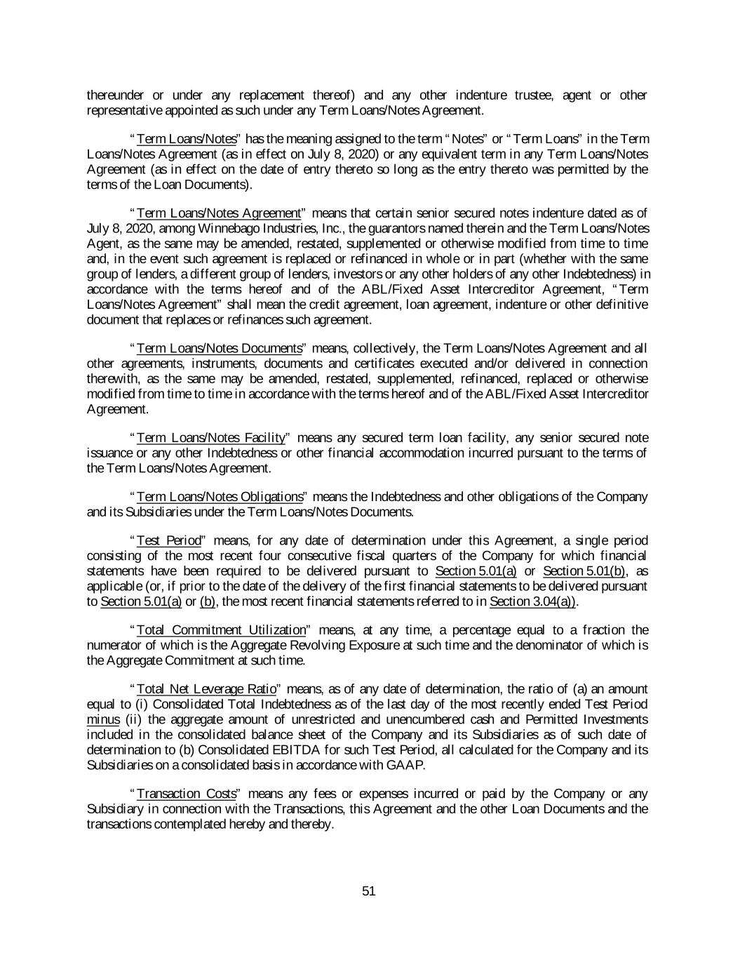 thereunder or under any replacement thereof) and any other indenture trustee, agent or other representative appointed as such under any Term Loans/Notes Agreement. “Term Loans/Notes” has the meaning assigned to the term “Notes” or “Term Loans” in the Term Loans/Notes Agreement (as in effect on July 8, 2020) or any equivalent term in any Term Loans/Notes Agreement (as in effect on the date of entry thereto so long as the entry thereto was permitted by the terms of the Loan Documents). “Term Loans/Notes Agreement” means that certain senior secured notes indenture dated as of July 8, 2020, among Winnebago Industries, Inc., the guarantors named therein and the Term Loans/Notes Agent, as the same may be amended, restated, supplemented or otherwise modified from time to time and, in the event such agreement is replaced or refinanced in whole or in part (whether with the same group of lenders, a different group of lenders, investors or any other holders of any other Indebtedness) in accordance with the terms hereof and of the ABL/Fixed Asset Intercreditor Agreement, “Term Loans/Notes Agreement” shall mean the credit agreement, loan agreement, indenture or other definitive document that replaces or refinances such agreement. “Term Loans/Notes Documents” means, collectively, the Term Loans/Notes Agreement and all other agreements, instruments, documents and certificates executed and/or delivered in connection therewith, as the same may be amended, restated, supplemented, refinanced, replaced or otherwise modified from time to time in accordance with the terms hereof and of the ABL/Fixed Asset Intercreditor Agreement. “Term Loans/Notes Facility” means any secured term loan facility, any senior secured note issuance or any other Indebtedness or other financial accommodation incurred pursuant to the terms of the Term Loans/Notes Agreement. “Term Loans/Notes Obligations” means the Indebtedness and other obligations of the Company and its Subsidiaries under the Term Loans/Notes Documents. “Test Period” means, for any date of determination under this Agreement, a single period consisting of the most recent four consecutive fiscal quarters of the Company for which financial statements have been required to be delivered pursuant to Section 5.01(a) or Section 5.01(b), as applicable (or, if prior to the date of the delivery of the first financial statements to be delivered pursuant to Section 5.01(a) or (b), the most recent financial statements referred to in Section 3.04(a)). “Total Commitment Utilization” means, at any time, a percentage equal to a fraction the numerator of which is the Aggregate Revolving Exposure at such time and the denominator of which is the Aggregate Commitment at such time. “Total Net Leverage Ratio” means, as of any date of determination, the ratio of (a) an amount equal to (i) Consolidated Total Indebtedness as of the last day of the most recently ended Test Period minus (ii) the aggregate amount of unrestricted and unencumbered cash and Permitted Investments included in the consolidated balance sheet of the Company and its Subsidiaries as of such date of determination to (b) Consolidated EBITDA for such Test Period, all calculated for the Company and its Subsidiaries on a consolidated basis in accordance with GAAP. “Transaction Costs” means any fees or expenses incurred or paid by the Company or any Subsidiary in connection with the Transactions, this Agreement and the other Loan Documents and the transactions contemplated hereby and thereby. 51