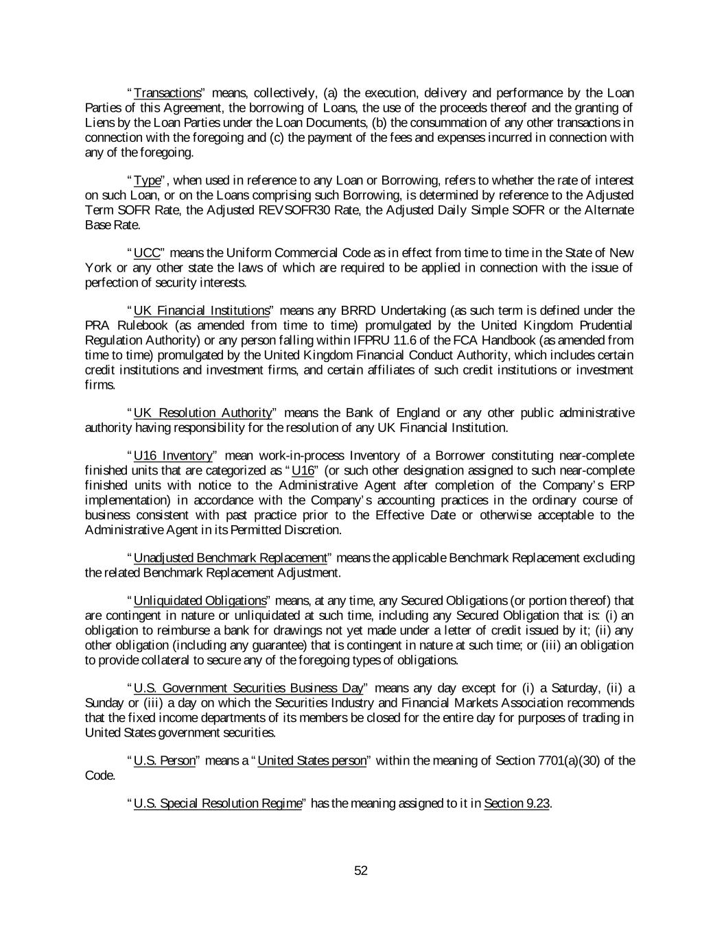 “Transactions” means, collectively, (a) the execution, delivery and performance by the Loan Parties of this Agreement, the borrowing of Loans, the use of the proceeds thereof and the granting of Liens by the Loan Parties under the Loan Documents, (b) the consummation of any other transactions in connection with the foregoing and (c) the payment of the fees and expenses incurred in connection with any of the foregoing. “Type”, when used in reference to any Loan or Borrowing, refers to whether the rate of interest on such Loan, or on the Loans comprising such Borrowing, is determined by reference to the Adjusted Term SOFR Rate, the Adjusted REVSOFR30 Rate, the Adjusted Daily Simple SOFR or the Alternate Base Rate. “UCC” means the Uniform Commercial Code as in effect from time to time in the State of New York or any other state the laws of which are required to be applied in connection with the issue of perfection of security interests. “UK Financial Institutions” means any BRRD Undertaking (as such term is defined under the PRA Rulebook (as amended from time to time) promulgated by the United Kingdom Prudential Regulation Authority) or any person falling within IFPRU 11.6 of the FCA Handbook (as amended from time to time) promulgated by the United Kingdom Financial Conduct Authority, which includes certain credit institutions and investment firms, and certain affiliates of such credit institutions or investment firms. “UK Resolution Authority” means the Bank of England or any other public administrative authority having responsibility for the resolution of any UK Financial Institution. “U16 Inventory” mean work-in-process Inventory of a Borrower constituting near-complete finished units that are categorized as “U16” (or such other designation assigned to such near-complete finished units with notice to the Administrative Agent after completion of the Company’s ERP implementation) in accordance with the Company’s accounting practices in the ordinary course of business consistent with past practice prior to the Effective Date or otherwise acceptable to the Administrative Agent in its Permitted Discretion. “Unadjusted Benchmark Replacement” means the applicable Benchmark Replacement excluding the related Benchmark Replacement Adjustment. “Unliquidated Obligations” means, at any time, any Secured Obligations (or portion thereof) that are contingent in nature or unliquidated at such time, including any Secured Obligation that is: (i) an obligation to reimburse a bank for drawings not yet made under a letter of credit issued by it; (ii) any other obligation (including any guarantee) that is contingent in nature at such time; or (iii) an obligation to provide collateral to secure any of the foregoing types of obligations. “U.S. Government Securities Business Day” means any day except for (i) a Saturday, (ii) a Sunday or (iii) a day on which the Securities Industry and Financial Markets Association recommends that the fixed income departments of its members be closed for the entire day for purposes of trading in United States government securities. “U.S. Person” means a “United States person” within the meaning of Section 7701(a)(30) of the Code. “U.S. Special Resolution Regime” has the meaning assigned to it in Section 9.23. 52