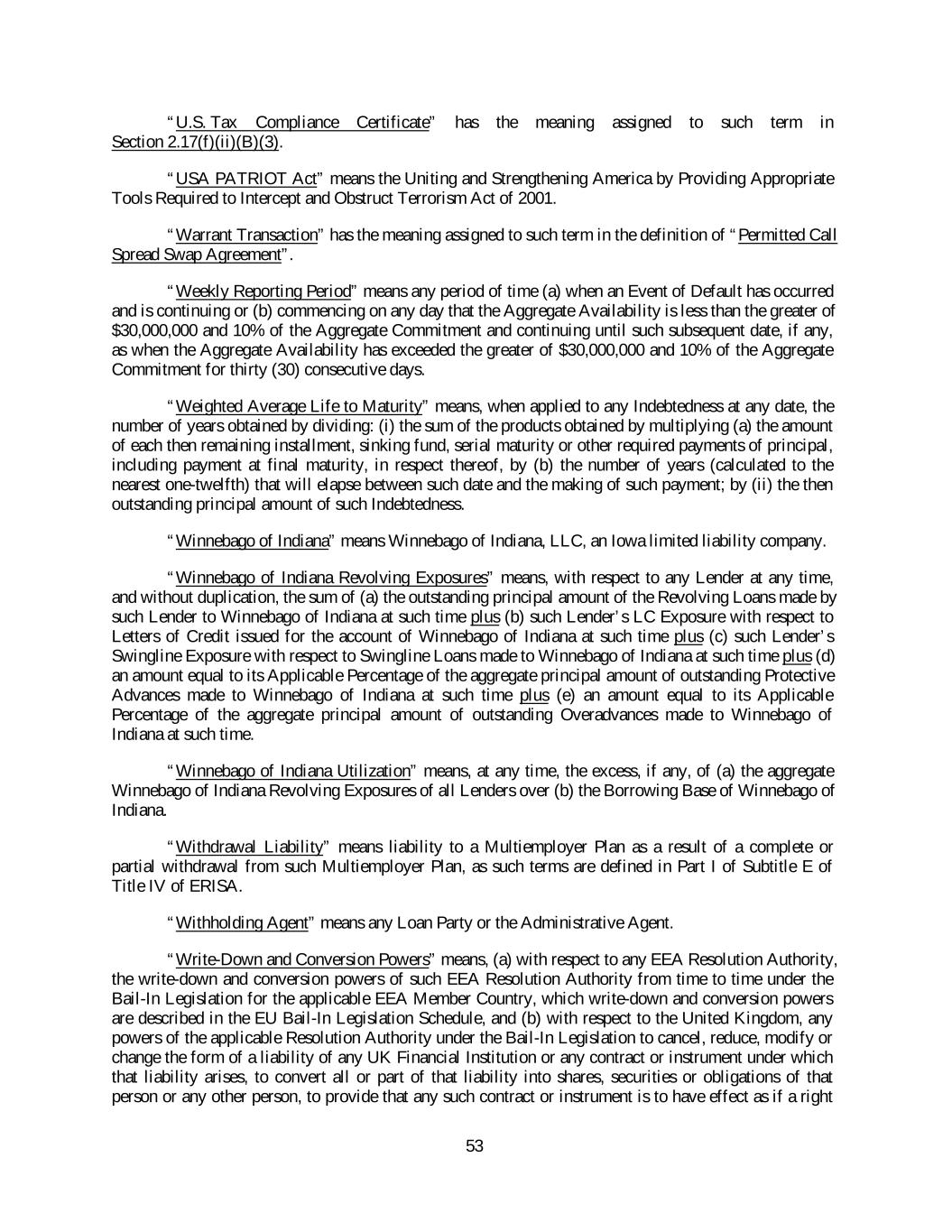 “U.S. Tax Compliance Certificate” has the meaning assigned to such term in Section 2.17(f)(ii)(B)(3). “USA PATRIOT Act” means the Uniting and Strengthening America by Providing Appropriate Tools Required to Intercept and Obstruct Terrorism Act of 2001. “Warrant Transaction” has the meaning assigned to such term in the definition of “Permitted Call Spread Swap Agreement”. “Weekly Reporting Period” means any period of time (a) when an Event of Default has occurred and is continuing or (b) commencing on any day that the Aggregate Availability is less than the greater of $30,000,000 and 10% of the Aggregate Commitment and continuing until such subsequent date, if any, as when the Aggregate Availability has exceeded the greater of $30,000,000 and 10% of the Aggregate Commitment for thirty (30) consecutive days. “Weighted Average Life to Maturity” means, when applied to any Indebtedness at any date, the number of years obtained by dividing: (i) the sum of the products obtained by multiplying (a) the amount of each then remaining installment, sinking fund, serial maturity or other required payments of principal, including payment at final maturity, in respect thereof, by (b) the number of years (calculated to the nearest one-twelfth) that will elapse between such date and the making of such payment; by (ii) the then outstanding principal amount of such Indebtedness. “Winnebago of Indiana” means Winnebago of Indiana, LLC, an Iowa limited liability company. “Winnebago of Indiana Revolving Exposures” means, with respect to any Lender at any time, and without duplication, the sum of (a) the outstanding principal amount of the Revolving Loans made by such Lender to Winnebago of Indiana at such time plus (b) such Lender’s LC Exposure with respect to Letters of Credit issued for the account of Winnebago of Indiana at such time plus (c) such Lender’s Swingline Exposure with respect to Swingline Loans made to Winnebago of Indiana at such time plus (d) an amount equal to its Applicable Percentage of the aggregate principal amount of outstanding Protective Advances made to Winnebago of Indiana at such time plus (e) an amount equal to its Applicable Percentage of the aggregate principal amount of outstanding Overadvances made to Winnebago of Indiana at such time. “Winnebago of Indiana Utilization” means, at any time, the excess, if any, of (a) the aggregate Winnebago of Indiana Revolving Exposures of all Lenders over (b) the Borrowing Base of Winnebago of Indiana. “Withdrawal Liability” means liability to a Multiemployer Plan as a result of a complete or partial withdrawal from such Multiemployer Plan, as such terms are defined in Part I of Subtitle E of Title IV of ERISA. “Withholding Agent” means any Loan Party or the Administrative Agent. “Write-Down and Conversion Powers” means, (a) with respect to any EEA Resolution Authority, the write-down and conversion powers of such EEA Resolution Authority from time to time under the Bail-In Legislation for the applicable EEA Member Country, which write-down and conversion powers are described in the EU Bail-In Legislation Schedule, and (b) with respect to the United Kingdom, any powers of the applicable Resolution Authority under the Bail-In Legislation to cancel, reduce, modify or change the form of a liability of any UK Financial Institution or any contract or instrument under which that liability arises, to convert all or part of that liability into shares, securities or obligations of that person or any other person, to provide that any such contract or instrument is to have effect as if a right 53